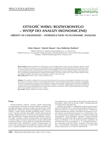 PRACA POGL¥DOWA 2002, VOL 32, NO 3, 184-187 OTY£OÆ WIEKU ROZWOJOWEGO WSTÊP DO ANALIZY EKONOMICZNEJ OBESITY IN CHILDHOOD INTRODUCTION TO ECONOMIC ANALYSIS Artur Mazur1, Marek Mazur2, Ewa Ma³ecka-Tendera3 Oddzia³ Dzieciêcy Szpitala Wojewódzkiego nr 2 w Rzeszowie, Zak³ad Finansów i Gospodarki Miêdzynarodowej Wydzia³u Ekonomii Uniwersytetu Rzeszowskiego, 3 Katedra i Zak³ad Patofizjologii AM w Katowicach 1 2 Streszczenie: Badania ostatnich lat wskazuj¹ na wzrost wystêpowania w naszym kraju nadwagi i oty³oci wród dzieci i m³odzie¿y. W dotychczasowych badaniach nie uwzglêdniano skutków ekonomicznych nadwagi i oty³oci wieku rozwojowego. W pracy przedstawiono metody badañ i analiz oraz modeli ekonomicznych umo¿liwiaj¹cych ustalenie rzeczywistych kosztów zwi¹zanych z profilaktyk¹ i leczeniem oty³oci u dzieci. Wskazano równie¿ na potrzebê przeprowadzenia ujednoliconych badañ i procedur medycznych, dziêki którym bêdzie mo¿liwe ustalenie skutków ekonomicznych nadwagi i oty³oci w naszym kraju. S³owa kluczowe: oty³oæ, dzieci, analiza ekonomiczna Abstract: The studies conducted in recent years have showed an increase of overweight and obesity in our country. However, economic effects of overweight and obesity in the developmental age have not been investigated. The present study there describes research methods, analysis and economic models which enable the establishing of costs connected with prophylaxis ant treatment of obesity in children. Additionally, the need of carrying out standarized research and introduction of medical procedures is discussed, which would enable effective management of overweight and obesity in our country. Key words: obesity, children, economic analysis Wstêp Przeprowadzana reforma systemu opieki zdrowotnej w naszym kraju wymusi³a na pracownikach wszystkich jej szczebli dokonanie rzetelnej analizy ekonomicznej swojej dzia³alnoci. Obliczane s¹ koszty dzia³alnoci szpitali i przychodni, a tak¿e koszty dzia³añ profilaktycznych i leczniczych. Zaczêto równie¿ prowadziæ analizê ekonomiczn¹ kosztów diagnozowania i leczenia poszczególnych jednostek chorobowych. Analizê ekonomiczn¹ danego schorzenia b¹d czynnika ryzyka przeprowadza siê najczêciej w dwóch etapach. W pierwszym nale¿y uzyskaæ odpowied na pytanie: Jaki jest ciê¿ar spo³eczny spowodowany danym schorzeniem lub czynnikiem ryzyka? Przeprowadza siê w tym celu analizê kosztów okrelonej choroby. Drugi etap ma za zadanie zbadanie ekonomicznej op³acalnoci dzia- 184 PRZEGL¥D PEDIATRYCZNY 2002, VOL 32, NO 3 ³añ medycznych zmierzaj¹cych do poprawy stanu zdrowia pacjentów, takich jak np. koszty terapii farmakologicznej czy interwencji chirurgicznej. Oty³oæ jest jednym z najbardziej rozpowszechnionych stanów chorobowych w rozwiniêtych spo³eczeñstwach. Problem ten dotyczy w znacznym stopniu dzieci i m³odzie¿y. Skutki ekonomiczne oty³oci doros³ych wyra¿aj¹ siê w ocenie kosztów spowodowanych przez ni¹ zachorowañ. Analizy ekonomiczne przeprowadzone w ró¿nych pañstwach europejskich, USA, Kanadzie, Australii i Nowej Zelandii wykaza³y, ¿e zaburzenia stanu zdrowia spowodowane oty³oci¹ poch³aniaj¹ 1.3% do 6.8% ³¹cznych wydatków na ochronê zdrowia w tych krajach (1, 2, 3). Badania niemieckie wskazuj¹, ¿e ³¹czne koszty zwi¹zane z leczeniem oty³oci i jej powik³añ u doros³ych w tym kraju w roku 1990 mo¿na oszacowaæ na 5.4 do 9.9 mld DM (4). Oty³oæ wieku rozwojowego... W przeprowadzonych dotychczas badaniach nie uwzglêdniano skutków ekonomicznych nadwagi i oty³oci wieku rozwojowego. Dlatego te¿, aby móc oszacowaæ ca³oæ kosztów jakie powoduj¹ schorzenia z ni¹ zwi¹zane w przebiegu ca³ego ¿ycia, trzeba znaleæ nowy punkt wyjcia dla ekonomicznej analizy oty³oci u dzieci i m³odzie¿y. Powinna ona stanowiæ podstawê ka¿dej ekonomicznej analizy dzia³añ profilaktycznych i leczniczych. Jedynie w ten sposób mo¿na wskazaæ, gdzie kryj¹ siê potencjalne oszczêdnoci oraz gdzie nale¿y skierowaæ rodki przeznaczone na te dzia³ania aby by³y one w³aciwie wydatkowane. Przeprowadzenie rzetelnej analizy ekonomicznej oceny oty³oci wieku dzieciêcego utrudnia jednak d³ugi okres obserwacji oraz szeroki wachlarz mo¿liwych nastêpstw chorobowych. Podstawy medyczne analizy ekonomicznej Oty³oæ jest wynikiem d³ugotrwa³ego zaburzenia równowagi pomiêdzy iloci¹ dostarczanej energii a jej wydatkowaniem. Regulacja energetyczna ustroju podlega czynnikom genetycznym i rodowiskowym. Badania molekularne pozwoli³y na zidentyfikowanie genu odpowiedzialnego za powstawanie oty³oci u zwierz¹t, podczas gdy u ludzi wystêpuje poligeniczny typ dziedziczenia warunkuj¹cy raczej sk³onnoæ do nadmiernego gromadzenia siê tkanki t³uszczowej (5). Sta³e narastanie odsetka osób oty³ych w krajach rozwiniêtych wskazuje na istotn¹ role czynników rodowiskowych (6). Zmiana trybu ¿ycia na mniej aktywny, spo¿ywanie pokarmów o du¿ej zawartoci t³uszczów i ³atwo przyswajalnych wêglowodanów, nieregularne posi³ki, sprzyjaj¹ nadmiernemu gromadzeniu siê tkanki t³uszczowej. Wprawdzie oty³oæ u niemowl¹t nie predestynuje do póniejszego jej wystêpowania, lecz gwa³towne przybieranie na wadze po czwartym lub pi¹tym roku ¿ycia (tzw. oty³oæ z odbicia) niesie za sob¹ ryzyko utrzymania nadwagi w póniejszym okresie ¿ycia (7). Oty³y nastolatek ma ju¿ prawie 50% szans na pozostanie oty³ym w wieku doros³ym (8). Liczba oty³ych dzieci i m³odzie¿y w krajach uprzemys³owionych stale ronie. Dane z Niemiec oraz USA wskazuj¹ na niemal skokowy wzrost liczby oty³ych dzieci w ostatnich latach (9, 10). Czêstoæ wystêpowania oty³oci u dzieci i m³odzie¿y w naszym kraju stwierdzana przez autorów w okresie ostatnich dwudziestu lat waha³a siê w szerokich granicach - od 2,5% do 12% (11, 12, 13, 14). Badania te dotyczy³y ró¿nych grup wiekowych, a ich autorzy stosowali ró¿ne kryteria oceny nadwagi i oty³oci. Brak jest wiêc aktualnych