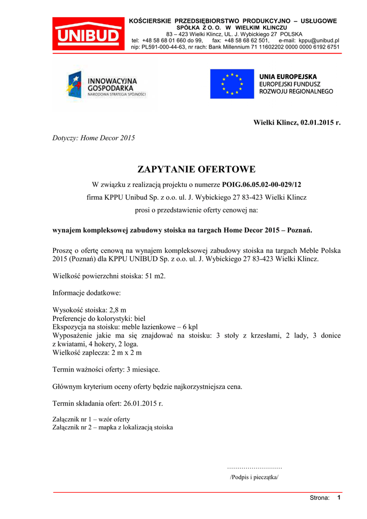 KOŚCIERSKIE PRZEDSIĘBIORSTWO PRODUKCYJNO – USŁUGOWE SPÓŁKA Z O. O. W WIELKIM KLINCZU 83 – 423 Wielki Klincz, UL. J. Wybickiego 27 POLSKA tel: +48 58 68 01 660 do 99, fax: +48 58 68 62 501, e-mail: [email protected] nip: PL591-000-44-63, nr rach: Bank Millennium 71 11602202 0000 0000 6192 6751 Wielki Klincz, 02.01.2015 r. Dotyczy: Home Decor 2015 ZAPYTANIE OFERTOWE W związku z realizacją projektu o numerze POIG.06.05.02-00-029/12 firma KPPU Unibud Sp. z o.o. ul. J. Wybickiego 27 83-423 Wielki Klincz prosi o przedstawienie oferty cenowej na: wynajem kompleksowej zabudowy stoiska na targach Home Decor 2015 – Poznań. Proszę o ofertę cenową na wynajem kompleksowej zabudowy stoiska na targach Meble Polska 2015 (Poznań) dla KPPU UNIBUD Sp. z o.o. ul. J. Wybickiego 27 83-423 Wielki Klincz. Wielkość powierzchni stoiska: 51 m2. Informacje dodatkowe: Wysokość stoiska: 2,8 m Preferencje do kolorystyki: biel Ekspozycja na stoisku: meble łazienkowe – 6 kpl Wyposażenie jakie ma się znajdować na stoisku: 3 stoły z krzesłami, 2 lady, 3 donice z kwiatami, 4 hokery, 2 loga. Wielkość zaplecza: 2 m x 2 m Termin ważności oferty: 3 miesiące. Głównym kryterium oceny oferty będzie najkorzystniejsza cena. Termin składania ofert: 26.01.2015 r. Załącznik nr 1 – wzór oferty Załącznik nr 2 – mapka z lokalizacją stoiska ……………………… /Podpis i pieczątka/ Strona: 1 .…………………., …….…..2015 r. Project co-financed by the European Regional Development Fund under the Operational Programme Innovative Economy Załącznik nr 1 Zamawiający : KPPU UNIBUD Sp. z o.o. J. Wybickiego 27 83- 423 Wielki Klincz Dotyczy : Home Decor 2015 OFERTA W nawiązaniu do zapytania ofertowego z dnia : 02.01.2015 r. przesyłam ofertę na : Wynajem kompleksowej zabudowy stoiska na targach: Home Decor 2015 w Poznaniu w dniach od 17.02.2015 do 20.02.2015 . Wielkość stoiska 6 m x 8,5 m Nazwa i adres oferenta: ........................................................................................................................................................................... ........................................................................................................................................................................... ........................................................................................................................................................................... imię i nazwisko osoby kontaktowej: ................................................................................................................ nr tel: .................................................... nr fax:.............…........................ e-mail: ...........…………............ Oferujemy realizację zamówienia w cenie: CENA NETTO ....................... PLN Podatek VAT .......................... PLN CENA BRUTTO .................... PLN Ważność oferty: 3 miesiące. ....................................................... (Pieczęć i podpis oferenta) 1 UWAGI/DODATKOWE INFORMACJE: ........................................................................................................................................................................... ........................................................................................................................................................................... ........................................................................................................................................................................... ........................................................................................................................................................................... ........................................................................................................................................................................... ........................................................................................................................................................................... ........................................................................................................................................................................... ........................................................................................................................................................................... ........................................................................................................................................................................... ........................................................................................................................................................................... ....................................................... (Pieczęć i podpis oferenta) 2