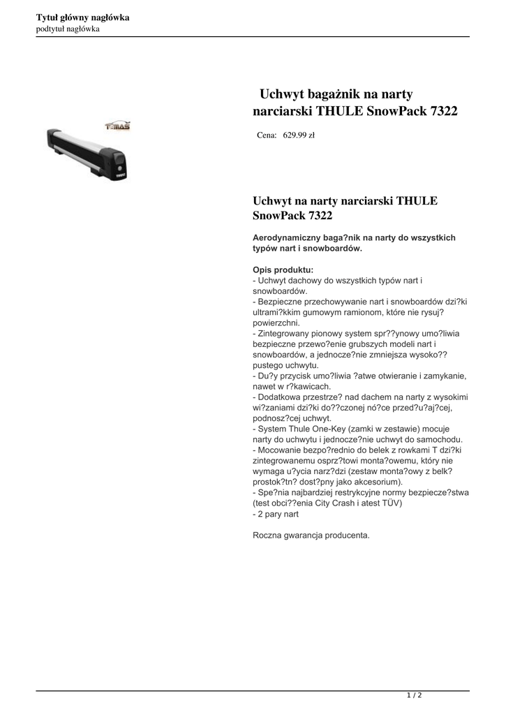 Tytuł główny nagłówka podtytuł nagłówka Uchwyt bagażnik na narty narciarski THULE SnowPack 7322 Cena: 629.99 zł Uchwyt na narty narciarski THULE SnowPack 7322 Aerodynamiczny baga?nik na narty do wszystkich typów nart i snowboardów. Opis produktu: - Uchwyt dachowy do wszystkich typów nart i snowboardów. - Bezpieczne przechowywanie nart i snowboardów dzi?ki ultrami?kkim gumowym ramionom, które nie rysuj? powierzchni. - Zintegrowany pionowy system spr??ynowy umo?liwia bezpieczne przewo?enie grubszych modeli nart i snowboardów, a jednocze?nie zmniejsza wysoko?? pustego uchwytu. - Du?y przycisk umo?liwia ?atwe otwieranie i zamykanie, nawet w r?kawicach. - Dodatkowa przestrze? nad dachem na narty z wysokimi wi?zaniami dzi?ki do??czonej nó?ce przed?u?aj?cej, podnosz?cej uchwyt. - System Thule One-Key (zamki w zestawie) mocuje narty do uchwytu i jednocze?nie uchwyt do samochodu. - Mocowanie bezpo?rednio do belek z rowkami T dzi?ki zintegrowanemu osprz?towi monta?owemu, który nie wymaga u?ycia narz?dzi (zestaw monta?owy z belk? prostok?tn? dost?pny jako akcesorium). - Spe?nia najbardziej restrykcyjne normy bezpiecze?stwa (test obci??enia City Crash i atest TÜV) - 2 pary nart Roczna gwarancja producenta. 1/2 Tytuł główny nagłówka podtytuł nagłówka 2/2 Powered by TCPDF (www.tcpdf.org)