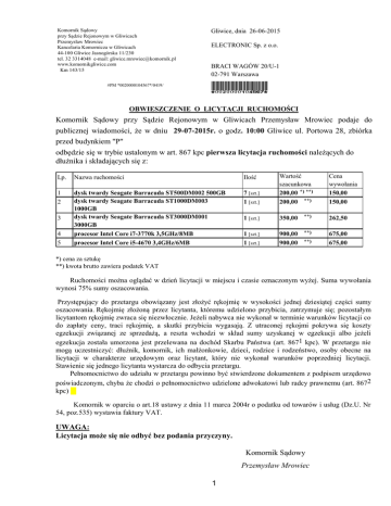 Komornik Sądowy przy Sądzie Rejonowym w Gliwicach Przemysław Mrowiec Kancelaria Komornicza w Gliwicach 44-100 Gliwice Jasnogórska 11/230 tel. 32 3314048 e-mail: [email protected] www.komornikgliwice.com Km 143/15 #PM *0020000104567*/0419/ Gliwice, dnia 26-06-2015 ELECTRONIC Sp. z o.o. BRACI WAGÓW 20/U-1 02-791 Warszawa *0020000104567* OBWIESZCZENIE O LICYTACJI RUCHOMOŚCI Komornik Sądowy przy Sądzie Rejonowym w Gliwicach Przemysław Mrowiec podaje do publicznej wiadomości, że w dniu 29-07-2015r. o godz. 10:00 Gliwice ul. Portowa 28, zbiórka przed budynkiem "P" odbędzie się w trybie ustalonym w art. 867 kpc pierwsza licytacja ruchomości należących do dłużnika i składających się z: Lp. Nazwa ruchomości Ilość 1 2 dysk twardy Seagate Barracuda ST500DM002 500GB dysk twardy Seagate Barracuda ST1000DM003 1000GB dysk twardy Seagate Barracuda ST3000DM001 3000GB procesor Intel Core i7-3770k 3,5GHz/8MB procesor Intel Core i5-4670 3,4GHz/6MB 7 [szt.] 1 [szt.] Wartość szacunkowa 200,00 *) **) 200,00 **) 1 [szt.] 350,00 **) 262,50 1 [szt.] 1 [szt.] 900,00 900,00 **) 675,00 675,00 3 4 5 **) Cena wywołania 150,00 150,00 *) cena za sztukę **) kwota brutto zawiera podatek VAT Ruchomości można oglądać w dzień licytacji w miejscu i czasie oznaczonym wyżej. Suma wywołania wynosi 75% sumy oszacowania. Przystępujący do przetargu obowiązany jest złożyć rękojmię w wysokości jednej dziesiątej części sumy oszacowania. Rękojmię złożoną przez licytanta, któremu udzielono przybicia, zatrzymuje się; pozostałym licytantom rękojmię zwraca się niezwłocznie. Jeżeli nabywca nie wykonał w terminie warunków licytacji co do zapłaty ceny, traci rękojmię, a skutki przybicia wygasają. Z utraconej rękojmi pokrywa się koszty egzekucji związanej ze sprzedażą, a reszta wchodzi w skład sumy uzyskanej w egzekucji albo jeżeli egzekucja została umorzona jest przelewana na dochód Skarbu Państwa (art. 8671 kpc). W przetargu nie mogą uczestniczyć: dłużnik, komornik, ich małżonkowie, dzieci, rodzice i rodzeństwo, osoby obecne na licytacji w charakterze urzędowym oraz licytant, który nie wykonał warunków poprzedniej licytacji. Stawienie się jednego licytanta wystarcza do odbycia przetargu. Pełnomocnictwo do udziału w przetargu powinno być stwierdzone dokumentem z podpisem urzędowo poświadczonym, chyba że chodzi o pełnomocnictwo udzielone adwokatowi lub radcy prawnemu (art. 8672 kpc) Komornik w oparciu o art.18 ustawy z dnia 11 marca 2004r o podatku od towarów i usług (Dz.U. Nr 54, poz.535) wystawia faktury VAT. UWAGA: Licytacja może się nie odbyć bez podania przyczyny. Komornik Sądowy Przemysław Mrowiec 1 Adresat oryginału: ELECTRONIC Sp. z o.o. Do wiadomości: 1. r.pr. Piotr Dragon Kancelaria Radców Prawnych i Adwokata Juris Consultus s.c., 44-100 Gliwice 2. Sąd Rejonowy w Gliwicach tablia ogłoszeń, 44-100 Gliwice 3. Urząd Miasta Gliwice tablica ogłoszeń, 44-100 Gliwice 4. Komornik Sądowy przy Sądzie Rejonowym w Gliwicach Przemysław Mrowiec, 44-100 Gliwice 5. Śląskie Centrum Logistyki Spółka Akcyjna Pan Michał Szulc, Gliwice, 44-100 Gliwice 6. a/a 2