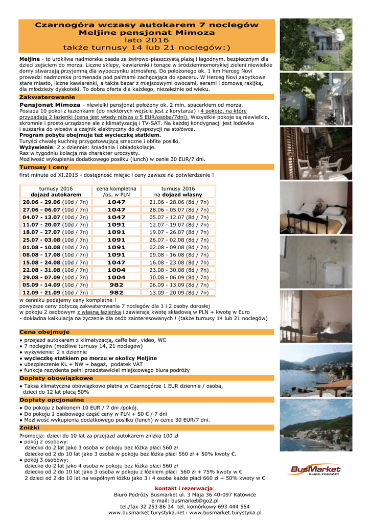 Czarnogóra wczasy autokarem 7 noclegów Meljine pensjonat Mimoza lato 2016 także turnusy 14 lub 21 noclegów:) Meljine - to urokliwa nadmorska osada ze żwirowo-piaszczystą plażą i łagodnym, bezpiecznym dla dzieci zejściem do morza. Liczne sklepy, kawiarenki i tonące w śródziemnomorskiej zieleni niewielkie domy stwarzają przyjemną dla wypoczynku atmosferę. Do położonego ok. 1 km Herceg Novi prowadzi nadmorska promenada pod palmami zachęcająca do spaceru. W Herceg Novi zabytkowe stare miasto, liczne kawiarenki, a także bazar z miejscowymi owocami, serami i domową rakijką, dla młodzieży dyskoteki. To dobra oferta dla każdego, niezależnie od wieku. Zakwaterowanie Pensjonat Mimoza - niewielki pensjonat położony ok. 2 min. spacerkiem od morza. Posiada 10 pokoi z łazienkami (do niektórych wejście jest z korytarza) i 4 pokoje, na które przypadają 2 łazienki (cena jest wtedy niższa o 5 EUR/osoba/7dni). Wszystkie pokoje są niewielkie, skromnie i prosto urządzone ale z klimatyzacją i TV-SAT. Na każdej kondygnacji jest lodówka i suszarka do włosów a czajnik elektryczny do dyspozycji na stołówce. Program pobytu obejmuje też wycieczkę statkiem. Turyści chwalę kuchnię przygotowującą smaczne i obfite posiłki. Wyżywienie: 2 x dziennie: śniadania i obiadokolacje. Raz w tygodniu kolacja ma charakter uroczysty. Możliwość wykupienia dodatkowego posiłku (lunch) w cenie 30 EUR/7 dni. Turnusy i ceny first minute od XI.2015 - dostępność miejsc i ceny zawsze na potwierdzenie ! turnusy 2016 dojazd autokarem cena kompletna /os. w PLN turnusy 2016 na dojazd własny 20.06 - 29.06 (10d / 7n) 1047 21.06 - 28.06 (8d / 7n) 27.06 - 06.07 (10d / 7n) 1047 28.06 - 05.07 (8d / 7n) 04.07 - 13.07 (10d / 7n) 1047 05.07 - 12.07 (8d / 7n) 11.07 - 20.07 (10d / 7n) 1091 12.07 - 19.07 (8d / 7n) 18.07 - 27.07 (10d / 7n) 1091 19.07 - 26.07 (8d / 7n) 25.07 - 03.08 (10d / 7n) 1091 26.07 - 02.08 (8d / 7n) 01.08 - 10.08 (10d / 7n) 1091 02.08 - 09.08 (8d / 7n) 08.08 - 17.08 (10d / 7n) 1091 09.08 - 16.08 (8d / 7n) 15.08 - 24.08 (10d / 7n) 1047 16.08 - 23.08 (8d / 7n) 22.08 - 31.08 (10d / 7n) 1004 23.08 - 30.08 (8d / 7n) 29.08 - 07.09 (10d / 7n) 1004 30.08 - 06.09 (8d / 7n) 05.09 - 14.09 (10d / 7n) 982 06.09 - 13.09 (8d / 7n) 12.09 - 21.09 (10d / 7n) 982 13.09 - 20.09 (8d / 7n) w cenniku podajemy ceny kompletne ! powyższe ceny dotyczą zakwaterowania 7 noclegów dla 1 i 2 osoby dorosłej w pokoju 2 osobowym z własną łazienką i zawierają kwotę składową w PLN + kwotę w Euro - dokładna kalkulacja na życzenie dla osób zainteresowanych ! (także turnusy 14 lub 21 noclegów) Cena obejmuje ● ● ● ● ● ● przejazd autokarem z klimatyzacją, caffe bar, video, WC 7 noclegów (możliwe turnusy 14, 21 noclegów) wyżywienie: 2 x dziennie wycieczkę statkiem po morzu w okolicy Meljine ubezpieczenie KL + NW + bagaż, podatek VAT funkcje rezydenta pełni przedstawiciel miejscowego biura podróży Dopłaty obowiązkowe ● Taksa klimatyczna obowiązkowo płatna w Czarnogórze 1 EUR dziennie / osoba, dzieci do 12 lat płacą 50% Dopłaty opcjonalne ● Do pokoju z balkonem 10 EUR / 7 dni /pokój. ● Do pokoju 1 osobowego część ceny w PLN + 50 € / 7 dni ● Możliwość wykupienia dodatkowego posiłku (lunch) w cenie 30 EUR/7 dni. Zniżki Promocja: dzieci do 10 lat za przejazd autokarem zniżka 100 zł ● pokój 2 osobowy: dziecko do 2 lat jako 3 osoba w pokoju bez łóżka płaci 560 zł dziecko od 2 do 10 lat jako 3 osoba w pokoju bez łóżka płaci 560 zł + 50% kwoty €. ● pokój 3 osobowy: dziecko do 2 lat jako 4 osoba w pokoju bez łóżka płaci 560 zł dziecko od 2 do 10 lat jako 3 osoba w pokoju z łóżkiem płaci 560 zł + 75% kwoty w € 2 dzieci od 2 do 10 lat na wspólnym łóżku jako 3 i 4 osoba każde płaci 660 zł + 50% kwoty w € kontakt i rezerwacja: Biuro Podróży Busmarket ul. 3 Maja 36 40-097 Katowice e-mail: [email protected] tel./fax 32 253 86 34 tel. komórkowy 693 444 554 www.busmarket.turystyka.net i www.busmarket.turystyka.pl osoba powyżej 10 lat jako 3 osoba w pokoju z łóżkiem płaci 560 zł + 90 % kwoty w € ● pokój 4 osobowy: dziecko do 2 lat jako 5 osoba w pokoju bez łóżka płaci 560 zł 2 dzieci od 2 do 10 lat jako 3 i 4 osoba w pokoju z łóżkiem każde płaci po 560 zł + 75 % kwoty € 2 osoby powyżej 10 lat jako 3 i 4 osoba każde płaci po 560 zł + 90 % kwoty €. ● dojazd własny -300 PLN Informacje dodatkowe Ceny składają się z części składowej w PLN i części w walucie Euro: 1.Kwota w złotych płatna jest w Polsce, kwota w EUR w Czarnogórze. 2.Równowarość kwoty w EUR płatna w Polsce: - obowiązkowo przy dojeździe własnym lub gdy potrzebna jest faktura na całość, wtedy kwotę w EUR należy przeliczyć na zł wg kursu NBP tabela sprzedaż. 3. Wycieczki fakultatywne organizowane są przez lokalne biura podróży. 4.Doba hotelowa rozpoczyna się o godz 14:00 i kończy o godz 9:00. Praktyczne informacje Najbliższa placówka dyplomatyczna: Ambasada RP ul. Kozaracka 79, 81000 Podgorica tel.(00382) 20 608320, tel dyżurny (00382) 69376634 fax (00382) 20 658 581 Obowiązująca waluta: EUR Wycieczki fakultatywne organizowane przez lokalne biura 1.REJS STATKIEM PO ZATOCE KOTORSKIEJ ok.30 EUR 2. DUBROWNIK ok. 35 EUR 3.CETINJE-LOVCEN-NJEGUSI-KOTOR ok. 30 EUR 4.MONASTYR OSTROG ok. 35 EUR 5.KANION MORACZA-MONASTYR MORACZA-BIOGRADZKIE JEZIORO-KANION TARA ok. 45 EUR 6.ALBANIA ok.50 EUR 7.MEDJUGORIE ok. 60 EUR 8.RAFTING TARĄ ok 90 EUR Program ramowy/dojazd autokarem 1 dzień Wyjazd z Polski zgodnie z rozkładem jazdy, przejazd przez Słowację (dla chętnych posiłek w cenie ok. 5 EUR), Węgry i Chorwację. NIEPOTRZEBNY PASZPORT ! 2 dzień Dalsza jazda przez Chorwację i Czarnogórę, przyjazd na miejsce wypoczynku ok. godz. 08:00 -10:00 Zakwaterowanie od 14.00, obiadokolacja, nocleg. 3 – 8 dzień WYPOCZYNEK. Możliwość wykupienia wycieczek fakultatywnych. 9 dzień Po śniadaniu wykwaterowanie z pokoi d