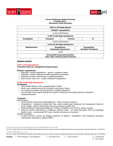 Forum Zmieniamy Polski Przemysł 3 lutego 2011 r. Warszawa, Hotel Sheraton 9.00-11.30 Sesja główna Polityka i gospodarka 11.30-12.00 Przerwa 12.00-14.00 Sesje tematyczne Energetyka Transport Finanse IT 14.00-14.30 Przerwa 14.30-16.30 Sesje tematyczne Budownictwo Zarządzanie. Ekspansja zagraniczna Zarządzanie. Dyrektor Finansowy 19.00 Uroczystość przyznania tytułów: Tego, który zmienia polski przemysł Wstępna agenda: 9.00-11.30 Sesja główna Uroczyste otwarcie, wystąpienia inauguracyjne Polityka i gospodarka • Regulacja i wolność gospodarcza – granice i wzajemne relacje • Narzędzia i metody realizowania polityki gospodarczej państwa • Własność prywatna a państwowa w polskiej gospodarce • Stare wzorce, nowe role – związki zawodowe w gospodarce 12.00-14.00 Sesje tematyczne Energetyka • Nowy kształt sektora i rynku energetycznego w Polsce • Skutki zmian własnościowych dla inwestycji, konkurencji, klienta • Czy możliwa jest dalsza wymiana aktywów w polskiej energetyce • Jak na kształt rynku wpłyną strategiczne projekty inwestycyjne (energetyka jądrowa, połączenia międzysystemowe)? Transport Rynek krajowy • Jak się zmienia konkurencja międzygałęziowa – kolej a przewozy drogowe • Infrastruktura – fundament rozwoju kolei. Stan, zakres modernizacji, inwestycje i ich finansowanie. Warunki i koszty dostępu. Zmiany własnościowe (proces prywatyzacji spółek PLK) • Rynek towarowych przewozów kolejowych w Polsce. Perspektywy na rok 2011, bariery rozwoju • Układ sił, zmiany własnościowe w kolejowym sektorze cargo – ich skutki dla klienta. Klucz do przyszłego kształtu rynku – prywatyzacja PKP Cargo. Inwestor branżowy czy finansowy? Kontekst europejski • W jakim kierunku rozwiną się silniejsze podmioty na polskim i europejskim rynku kolejowym (przewozy intermodalne, ekspansja w regionie EŚW?) • Rosnące znaczenie transgranicznych przewozów kolejowych. „Europeizacja” rynku. Nowe dyrektywy UE. Zarządzanie łańcuchem dostaw – jeden głównych warunków międzynarodowej konkurencyjności. Przewozy kontenerowe Finanse • Warszawa jako centrum finansowe Europy Centralnej. Wizja i warunki jej realizacji • Idea i narzędzia jej realizacji – prywatyzacja i polityka własnościowa MSP. Relacje z inwestorami i największymi instytucjami finansowymi • Rola i perspektywy GPW na europejskim rynku finansowym IT • • • • • Rozwój biznesu a poziom wykorzystania nowoczesnych technologii Zaangażowanie i rola zarządów w wyborze i wdrażaniu nowoczesnych technologii. Pozycja osób odpowiedzialnych za ICT w firmie. Nowe technologie i systemy a ład korporacyjny Rozwiązania ICT jako element przewagi konkurencyjnej Systemy i technologie wspierające zarządzanie i podejmowanie decyzji. Optymalizacja kosztów w obszarze firmowej administracji. Obsługa klienta i technologie ICT. Integracja systemów teleinformatycznych oraz bezpieczeństwo danych i informacji. Wirtualne platformy usługowe i aplikacje na żądanie Outsourcing IT. Outsourcing procesów biznesowych 14.30-16.30 Sesje tematyczne Budownictwo • Sytuacja branży budowlanej. Konkurencyjność, płynność finansowa, rynek, system przetargowy • Dynamika inwestycji infrastrukturalnych w Polsce. Czynniki pobudzające koniunkturę • Perspektywy branży po roku 2012. Obszary przyszłej aktywności firm budowlanych, ich główni partnerzy (budownictwo przemysłowe, telekomunikacja, energetyka) • Nowe trendy w budownictwie (efektywność energetyczna, nowe materiały i technologie, rola nowoczesnej logistyki i narzędzie IT w procesie inwestycyjnym) Zarządzanie. Ekspansja zagraniczna • Przykłady udanych i chybionych akwizycji zagranicznych w różnych branżach przemysłu • Polskie firmy na globalnym rynku – przyczyny porażek i sukcesów • Wsparcie dla polskiego inwestora – potrzeby, bariery, praktyka Zarządzanie. Dyrektor Finansowy • Globalny kryzys finansowy – reperkusje dla finansów przedsiębiorstw w Polsce • Dług, płynność finansowa, awersja przed ryzykiem – reakcje rynków finansowych, działania przedsiębiorstw • Rola dyrektora finansowego w nowej rzeczywistości • Aktualna sytuacja na rynkach finansowych • Jak uwolnić rezerwy wewnątrz firmy? • Zarządzanie ryzykiem • Realizacja dużych projektów inwestycyjnych • Nowe możliwości finansowania
