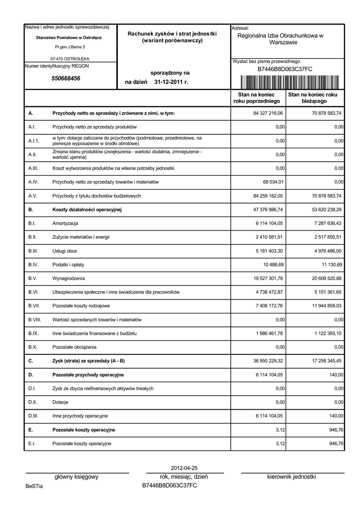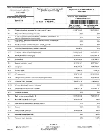 Nazwa i adres jednostki sprawozdawczej Starostwo Powiatowe w Ostrołęce Pl.gen.J.Bema 5 Rachunek zysków i strat jednos tki (wariant porównawczy) 07-410 OSTROŁĘKA Numer identyfikacyjny REGON 550668456 na dzień sporządzony na 31-12-2011 r. A. Przychody netto ze sprzedaży i zrównane z nimi, w tym: A.I. Przychody netto ze sprzedaży produktów A.I.1. A.II. A.III. w tym: dotacje zaliczane do przychodów (podmiotowe, przedmiotowe, na pierwsze wyposażenie w środki obrotowe) Zmiana stanu produktów (zwiększenia - wartość dodatnia, zmniejszenie wartość ujemna) Koszt wytworzenia produktów na własne potrzeby jednostki Adresat: Regionalna Izba Obrachunkowa w Warszawie Wysłać bez pisma przewodniego B7446B8D063C37FC Stan na koniec roku poprzedniego 84 327 216,06 Stan na koniec roku bieżącego 70 878 583,74 0,00 0,00 0,00 0,00 0,00 0,00 0,00 0,00 68 034,01 0,00 A.IV. Przychody netto ze sprzedaży towarów i materiałów A.V. Przychody z tytułu dochodów budżetowych 84 259 182,05 70 878 583,74 B. Koszty działalności operacyjnej 47 376 986,74 53 620 238,29 B.I. Amortyzacja 6 114 104,05 7 287 636,43 B.II. Zużycie materiałów i energii 2 410 581,51 2 517 850,51 B.III. Usługi obce 5 181 403,30 4 976 486,00 B.IV. Podatki i opłaty 10 488,69 11 130,69 B.V. Wynagrodzenia 19 527 301,78 20 608 520,88 B.VI. Ubezpieczenia społeczne i inne świadczenia dla pracowników 4 738 472,87 5 151 361,65 B.VII. Pozostałe koszty rodzajowe 7 408 172,76 11 944 859,03 B.VIII. Wartość sprzedanych towarów i materiałów B.IX. Inne świadczenia finansowane z budżetu B.X. Pozostałe obciążenia C. Zysk (strata) ze sprzedaży (A - B) 36 950 229,32 D. Pozostałe przychody operacyjne 6 114 104,05 D.I. Zysk ze zbycia niefinansowych aktywów trwałych 0,00 0,00 D.II. Dotacje 0,00 0,00 D.III. Inne przychody operacyjne E. Pozostałe koszty operacyjne 3,12 946,76 E.I. Pozostałe koszty operacyjne 3,12 946,76 BeSTia główny księgowy 0,00 1 986 461,78 0,00 1 122 393,10 0,00 0,00 17 258 345,45 6 114 104,05 2012-04-25 rok, miesiąc, dzień B7446B8D063C37FC kierownik jednostki 140,00 140,00 F. Zysk (strata) z działalności operacyjnej (C + D - E) G. Przychody finansowe G.I. Dywidendy i udziały w zyskach G.II. Odsetki G.III. Inne H. 43 064 330,25 17 257 538,69 57 336,55 0,00 0,00 0,00 2 663,77 0,00 54 672,78 0,00 Koszty finansowe 0,00 0,00 H.I. Odsetki 0,00 0,00 H.II. Inne 0,00 0,00 I. Zysk (strata) z działalności gospodarczej (F + G - H) J. Wynik zdarzeń nadzwyczajnych (J.I. - J.II.) 0,00 0,00 J.I. Zyski nadzwyczajne 0,00 0,00 J.II. Straty nadzwyczajne 0,00 0,00 K. Zysk (strata) brutto (I +- J) L. Podatek dochodowy M. N. BeSTia 43 121 666,80 43 121 666,80 Pozostałe obowiązkowe zmniejszenia zysku (zwiększenia straty) oraz nadwyżki środków obrotowych Zysk (strata) netto (K - L - M) główny księgowy 2012-04-25 rok, miesiąc, dzień B7446B8D063C37FC 17 257 538,69 17 257 538,69 0,00 0,00 0,00 0,00 43 121 666,80 17 257 538,69 kierownik jednostki Wyjaśnienia do sprawozdania BeSTia główny księgowy 2012-04-25 rok, miesiąc, dzień B7446B8D063C37FC kierownik jednostki