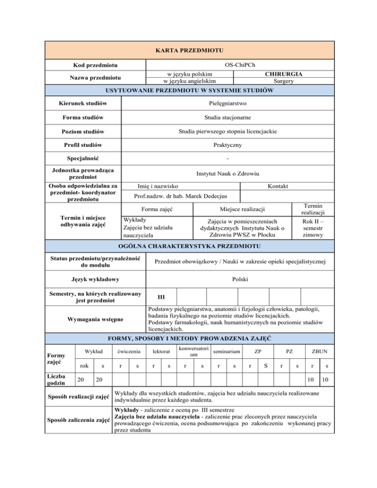 KARTA PRZEDMIOTU OS-ChiPCh Kod przedmiotu w języku polskim w języku angielskim Nazwa przedmiotu CHIRURGIA Surgery USYTUOWANIE PRZEDMIOTU W SYSTEMIE STUDIÓW Kierunek studiów Pielęgniarstwo Forma studiów Studia stacjonarne Poziom studiów Studia pierwszego stopnia licencjackie Profil studiów Praktyczny Specjalność - Jednostka prowadząca przedmiot Instytut Nauk o Zdrowiu Osoba odpowiedzialna za przedmiot- koordynator przedmiotu Imię i nazwisko Kontakt Prof.nadzw. dr hab. Marek Dedecjus Miejsce realizacji Termin realizacji Zajęcia w pomieszczeniach dydaktycznych Instytutu Nauk o Zdrowiu PWSZ w Płocku Rok II – semestr zimowy Forma zajęć Termin i miejsce odbywania zajęć Wykłady Zajęcia bez udziału nauczyciela OGÓLNA CHARAKTERYSTYKA PRZEDMIOTU Status przedmiotu/przynależność do modułu Przedmiot obowiązkowy / Nauki w zakresie opieki specjalistycznej Język wykładowy Polski Semestry, na których realizowany jest przedmiot III Podstawy pielęgniarstwa, anatomii i fizjologii człowieka, patologii, badania fizykalnego na poziomie studiów licencjackich. Podstawy farmakologii, nauk humanistycznych na poziomie studiów licencjackich. Wymagania wstępne FORMY, SPOSOBY I METODY PROWADZENIA ZAJĘĆ Formy zajęć Liczba godzin Wykład rok 20 s 20 Sposób realizacji zajęć ćwiczenia r s lektorat r s konwersatori seminarium um r s r s ZP r PZ S r ZBUN s r s 10 10 Wykłady dla wszystkich studentów, zajęcia bez udziału nauczyciela realizowane indywidualnie przez każdego studenta. Wykłady - zaliczenie z oceną po III semestrze Zajęcia bez udziału nauczyciela - zaliczenie prac zleconych przez nauczyciela Sposób zaliczenia zajęć prowadzącego ćwiczenia, ocena podsumowująca po zakończeniu wykonanej pracy przez studenta Metody dydaktyczne Przedmioty powiązane/moduł Wykłady: − wykład informacyjny, − wykład problemowy, − dyskusja dydaktyczna, − metoda programowana z użyciem komputera. Zajęcia bez udziału nauczyciela: − studiowanie literatury, − prezentacja multimedialna, dyskusja dydaktyczna. Fizjologia, Anatomia, Pielęgniarstwo chirurgiczne 1. Podstawowa 2. 3. 4. 5. 6. Wykaz literatury 1. 2. Uzupełni ająca 3. 4. 5. 6. Czarnecka Z., Malińska W. (red.), Instrumentarium i przebieg zabiegów: w chirurgii, ginekologii i urologii, Wydaw. Makmed, Lublin 2006. Fibak J. (red.), Chirurgia . Podręcznik dla studentów ,PZWL, Warszawa 2006. Fibak J (red.),Chirurgia. Repetytorium, PZWL, Warszawa 2006. Gaździk T.S .(red.), Ortopedia i traumatologia, PZWL, Warszawa 2005. Głuszek S. (red.), Chirurgia: podręcznik dla studentów wydziałów nauk o zdrowiu, Czelej, Lublin 2008. Tuszewski M.: Chirurgia układu pokarmowego z elementami pielęgniarstwa. Warszawa 1995. Brongel L., Duda K. (red.), Mnogie i wielonarządowe obrażenia ciała, PZWL, Warszawa 2011. Hirt R., Bubser M. (red.), Podręcznik anestezjologii dla pielęgniarek, PZWL, Warszawa 2010. Jakubaszka J. (red.), Pielęgniarstwo, Wyd. I , Wrocław, Urban & Partner 2001 Noszczyk W. (red.), Chirurgia T. 1-2, PZWL, Warszawa 2005. Pizzutillo P.D. (red. A. Gregosiewicz), Ortopedia dziecięca, Wyd. Czelej, Lublin 1999. Woźniewski M., Kołodziej J (red.), Rehabilitacja w chirurgii, PZWL, Warszawa 2006. CELE, TREŚCI I EFEKTY KSZTAŁCENIA Cele przedmiotu (ogólne, szczegółowe) Student: będzie przygotowany do rozpoznawania, diagnozowania oraz wdrażania kompleksowego planu opieki nad pacjentem hospitalizowanym z powodu chorób chirurgicznych. Student : C1.określi zakres danych niezbędnych do sformułowania diagnozy pielęgniarskiej pacjentów chirurgicznych, C2. przedstawi zasady przygotowania pacjenta do zabiegu operacyjnego i po jego wykonaniu z uwzględnieniem specyfiki stanów chirurgicznych, C3.opanuje określone umiejętności diagnostyczno-lecznicze niezbędne do sprawowania opieki nad pacjentem chirurgicznym. Treści programowe Efekty kształcenia (kody) OSChiPCh_W01 OSChiPCh_W02 Forma zajęć Temat W Wszystkie zajęcia W Wykłady: • Postępowanie diagnostyczno-terapeutyczne w najczęstszych nowotworach. • Postępowanie diagnostyczno-terapeutyczne w chirurgicznych chorobach tarczycy, nadnerczy i trzustki. • Postępowanie diagnostyczno-terapeutyczne w wybranych chorobach klatki piersiowej. Ropniak opłucnej. Odma opłucnowa. • Postępowanie diagnostyczno-terapeutyczne w chorobach chirurgicznych przewodu pokarmowego. Suma liczby godzin Liczba godzin 30 30 2 2 2 2 1 13 • • • OSChiPCh_W03 W Zbun OSChiPCh_W04 W OSChiPCh_W05 OSChiPCh_W06 W Zbun W Zbun OSChiPCh_W07 W W OSChiPCh_W08 OSChiPCh_W09 OSChiPCh_W10 OSChiPCh_W11 OSChiPCh_W12 OSChiPCh_W13 OSChiPCh_W14 OSChiPCh_W15 OSChiPCh_U01 W Zbun W Postępowanie diagnostyczno-terapeutyczne w chirurgicznych chorobach układu moczowo- płciowego. Postępowanie diagnostyczno-terapeutyczne w chorobach tętnic i żył. Pacjent kardiochirurgiczny. Wybrane zagadnienia z chirurgii dziecięcej. 2 2 30 30 1 1 Wszystkie zajęcia 30 30 Wszystkie zajęcia 30 30 W - Specyfika oddziału chirurgicznego Przygotowanie chorego do leczenia i zabiegu operacyjnego – informacja pacjenta i zgoda na leczenie. 1 1 W - Leczenie żywieniowe w chirurgii. 1 1 30 30 1 1 Wszystkie zajęcia W - Specyfika oddziału chirurgicznego Przygotowanie chorego do leczenia i zabiegu operacyjnego – informacja pacjenta i zgoda na leczenie. Wszystkie zajęcia W - Specyfika oddziału chirurgicznego Przygotowanie chorego do leczenia i zabiegu operacyjnego – informacja pacjenta i zgoda na leczenie. W Zbun Wszystkie zajęcia 30 30 W Zbun Wszystkie zajęcia 30 30 Wszystkie zajęcia 30 30 Wszystkie zajęcia 30 30 Wszystkie zajęcia 30 30 Wszystkie zajęcia 30 30 30 30 W Zbun W Zbun W Zbun W Zbun Wykłady: • Specyfika oddziału chirurgicznego Przygotowanie chorego do leczenia i zabiegu operacyjnego – informacja pacjenta i zgoda na leczenie. • Walka z bólem w oddziale chirurgicznym. Znieczulenia- rodzaje, wskazania i przebieg. Wstrząs – przyczyny i objawy. OSChiPCh_U02 W OSChiPCh_U03 W Zbu