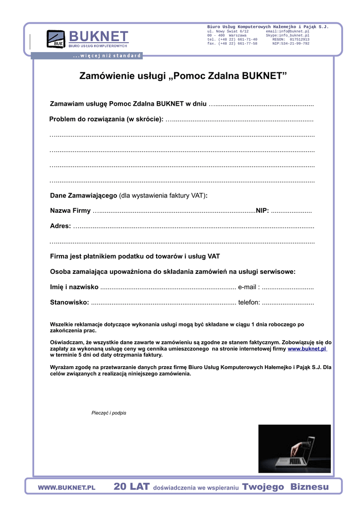 Biuro Usług Komputerowych Hałemejko i Pająk S.J. ul. Nowy Świat 6/12 00 - 400 Warszawa tel. (+48 22) 661-71-40 fax. (+48 22) 661-77-58 email:[email protected] Skype:info_buknet.pl REGON: 017512913 NIP:534-21-99-792 Zamówienie usługi „Pomoc Zdalna BUKNET” Zamawiam usługę Pomoc Zdalna BUKNET w dniu …..................................................... Problem do rozwiązania (w skrócie): …............................................................................ …........................................................................................................................................... …........................................................................................................................................... …........................................................................................................................................... …........................................................................................................................................... Dane Zamawiającego (dla wystawienia faktury VAT): Nazwa Firmy …....................................................................................NIP: ...................... Adres: ….............................................................................................................................. …........................................................................................................................................... Firma jest płatnikiem podatku od towarów i usług VAT Osoba zamaiająca upoważniona do składania zamówień na usługi serwisowe: Imię i nazwisko ......................................................................... e-mail : ............................ Stanowisko: .............................................................................. telefon: ............................ Wszelkie reklamacje dotyczące wykonania usługi mogą być składane w ciągu 1 dnia roboczego po zakończenia prac. Oświadczam, że wszystkie dane zawarte w zamówieniu są zgodne ze stanem faktycznym. Zobowiązuję się do zapłaty za wykonaną usługę ceny wg cennika umieszczonego na stronie internetowej firmy www.buknet.pl w terminie 5 dni od daty otrzymania faktury. Wyrażam zgodę na przetwarzanie danych przez firmę Biuro Usług Komputerowych Hałemejko i Pająk S.J. Dla celów związanych z realizacją niniejszego zamówienia. Pieczęć i podpis WWW.BUKNET.PL 20 LAT doświadczenia we wspieraniu Twojego Biznesu
