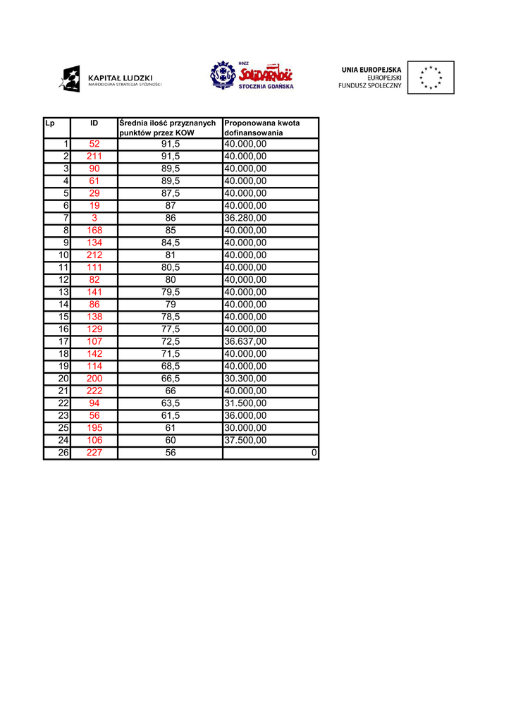 Lp ID 1 2 3 4 5 6 7 8 9 10 11 12 13 14 15 16 17 18 19 20 21 22 23 25 24 26 52 211 90 61 29 19 3 168 134 212 111 82 141 86 138 129 107 142 114 200 222 94 56 195 106 227 Średnia ilość przyznanych punktów przez KOW 91,5 91,5 89,5 89,5 87,5 87 86 85 84,5 81 80,5 80 79,5 79 78,5 77,5 72,5 71,5 68,5 66,5 66 63,5 61,5 61 60 56 Proponowana kwota dofinansowania 40.000,00 40.000,00 40.000,00 40.000,00 40.000,00 40.000,00 36.280,00 40.000,00 40.000,00 40.000,00 40.000,00 40,000,00 40.000,00 40.000,00 40.000,00 40.000,00 36.637,00 40.000,00 40.000,00 30.300,00 40.000,00 31.500,00 36.000,00 30.000,00 37.500,00 0