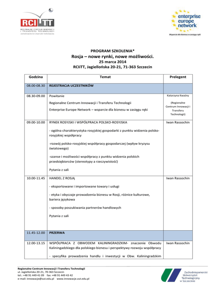 PROGRAM SZKOLENIA* Rosja – nowe rynki, nowe możliwości. 25 marca 2014 RCIiTT, Jagiellońska 20-21, 71-363 Szczecin Godzina Temat 08.00-08.30 REJESTRACJA UCZESTNIKÓW 08.30-09.00 Powitanie Regionalne Centrum Innowacji i Transferu Technologii 09.00-10.00 Prelegent Katarzyna Kwaśny Enterprise Europe Network – wsparcie dla biznesu w zasięgu ręki (Regionalne Centrum Innowacji i Transferu Technologii) RYNEK ROSYJSKI I WSPÓŁPRACA POLSKO-ROSYJSKA Iwan Rassochin - ogólna charakterystyka rosyjskiej gospodarki z punktu widzenia polskorosyjskiej współpracy -rozwój polsko-rosyjskiej współpracy gospodarczej (wpływ kryzysu światowego) -szanse i możliwości współpracy z punktu widzenia polskich przedsiębiorców (stereotypy a rzeczywistość) Pytania z sali 10.00-11.45 HANDEL Z ROSJĄ Iwan Rassochin - eksportowane i importowane towary i usługi - etyka i obyczaje prowadzenia biznesu w Rosji, różnice kulturowe, bariera językowa - sposoby poszukiwania partnerów handlowych Pytania z sali 11.45-12.00 PRZERWA 12.00-13.15 WSPÓŁPRACA Z OBWODEM KALININGRADZKIM- znaczenie Obwodu Kaliningadzkiego dla polskiego biznesu i perspektywy rozwoju współpracy - specyfika prowadzenia handlu i inwestycji w Obw. Kaliningradzkim Regionalne Centrum Innowacji I Transferu Technologii ul. Jagiellońska 20-21, 70-363 Szczecin tel.: +48 91 449 41 09 fax: +48 91 449 43 42 e-mail: [email protected] www.innowacje.zut.edu.pl Iwan Rassochin (Specjalna Strefa Ekonomiczna) Pytania z sali 13.15-13.45 LUNCH 13.45-15.15 ISTOTNE ASPEKTY PROWADZENIA EKSPORTU DO ROSJI Iwan Rassochin - zawieranie umów - warunki płatności - przepisy bankowe - transport - odprawa celna - ograniczenia i zakazy, certyfikacja - unia celna Rosji, Białorusi i Kazachstanu -znaczenie przystąpienia Rosji do WTO dla polskich eksporterów Pytania z sali 15.15-15.30 PRZERWA 15.30-16.30 ZAGADNIENIA PRAWNE PROWADZENIA DZIAŁANOŚCI W ROSJI Iwan Eassochin formy prawne prowadzenia działalności w Rosji - zakładanie firmy w Rosji - system podatkowy i najważniejsze podatki - system ulg i zachęt dla inwestorów 16.30-17.00 INDYWIDUALNE KONSULTACJE Iwan Rassochin *Organizator zastrzega sobie możliwość wprowadzenia drobnych zmian w strukturze programu Regionalne Centrum Innowacji I Transferu Technologii ul. Jagiellońska 20-21, 70-363 Szczecin tel.: +48 91 449 41 09 fax: +48 91 449 43 42 e-mail: [email protected] www.innowacje.zut.edu.pl