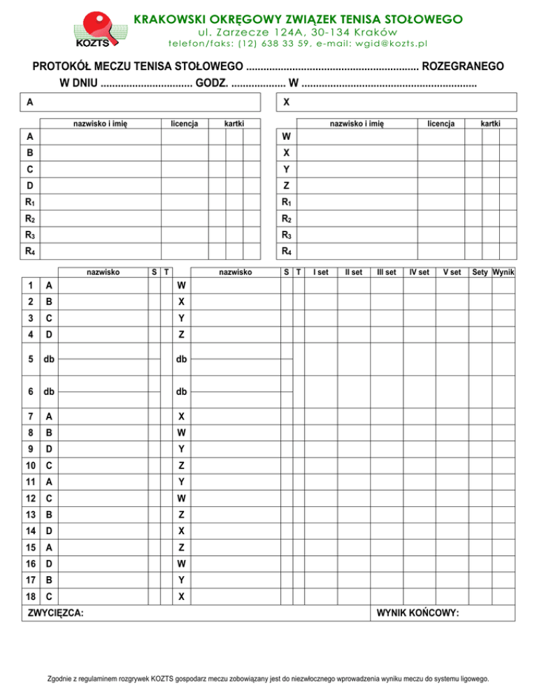 KRAKOWSKI OKRĘGOWY ZWIĄZEK TENISA STOŁOWEGO ul . Zarzecze 124A, 30-134 Kraków t el ef on /f a k s : (1 2 ) 63 8 3 3 59 , e- m a i l : w gi d @k ozt s .p l PROTOKÓŁ MECZU TENISA STOŁOWEGO ............................................................ ROZEGRANEGO W DNIU ................................ GODZ. ................... W ............................................................. A X nazwisko i imię licencja kartki nazwisko i imię A W B X C Y D Z R1 R1 R2 R2 R3 R3 R4 R4 nazwisko S T nazwisko 1 A W 2 B X 3 C Y 4 D Z 5 db db 6 db db 7 A X 8 B W 9 D Y 10 C Z 11 A Y 12 C W 13 B Z 14 D X 15 A Z 16 D W 17 B Y 18 C X ZWYCIĘZCA: S T I set II set III set licencja IV set V set kartki Sety Wynik WYNIK KOŃCOWY: Zgodnie z regulaminem rozgrywek KOZTS gospodarz meczu zobowiązany jest do niezwłocznego wprowadzenia wyniku meczu do systemu ligowego. KRAKOWSKI OKRĘGOWY ZWIĄZEK TENISA STOŁOWEGO ul . Zarzecze 124A, 30-134 Kraków t el ef on /f a k s : (1 2 ) 63 8 3 3 59 , e- m a i l : w gi d @k ozt s .p l Oświadczam, że zawodnicy naszej drużyny, wpisani do protokółu meczu, posiadają aktualne badania lekarskie, zgodnie z obowiązującymi przepisami. nazwisko i imię funkcja podpis nazwisko i imię kapitanowie drużyn podpis weryfikacja meczu A X A X trenerzy drużyn A X sędziowie meczu 1. 2. organizacja meczu warunki techniczne pole gry prawidłowe nieprawidłowe podłoga prawidłowe nieprawidłowe oświetlenie prawidłowe nieprawidłowe wrażenie estetyczne prawidłowe nieprawidłowe uwagi liczba widzów Inne uwagi (wypełnia: I – kapitan gości, II – kapitan gospodarzy, III – sędzia główny) I II III Zgodnie z regulaminem rozgrywek KOZTS gospodarz meczu zobowiązany jest do niezwłocznego wprowadzenia wyniku meczu do systemu ligowego.