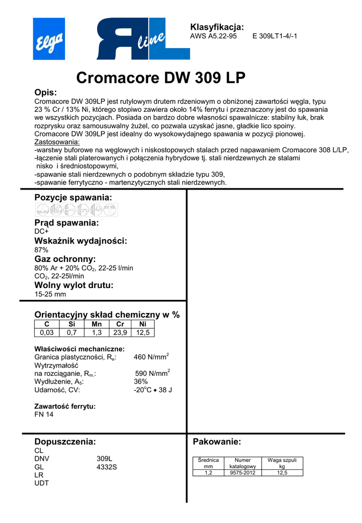Klasyfikacja: AWS A5.22-95 E 309LT1-4/-1 Cromacore DW 309 LP Opis: Cromacore DW 309LP jest rutylowym drutem rdzeniowym o obniżonej zawartości węgla, typu 23 % Cr / 13% Ni, którego stopiwo zawiera około 14% ferrytu i przeznaczony jest do spawania we wszystkich pozycjach. Posiada on bardzo dobre własności spawalnicze: stabilny łuk, brak rozprysku oraz samousuwalny żużel, co pozwala uzyskać jasne, gładkie lico spoiny. Cromacore DW 309LP jest idealny do wysokowydajnego spawania w pozycji pionowej. Zastosowania: -warstwy buforowe na węglowych i niskostopowych stalach przed napawaniem Cromacore 308 L/LP, -łączenie stali platerowanych i połączenia hybrydowe tj. stali nierdzewnych ze stalami nisko i średniostopowymi, -spawanie stali nierdzewnych o podobnym składzie typu 309, -spawanie ferrytyczno - martenzytycznych stali nierdzewnych. Pozycje spawania: Prąd spawania: DC+ Wskaźnik wydajności: 87% Gaz ochronny: 80% Ar + 20% CO2, 22-25 l/min CO2, 22-25l/min Wolny wylot drutu: 15-25 mm Orientacyjny skład chemiczny w % C 0,03 Si 0,7 Mn 1,3 Cr 23,9 Właściwości mechaniczne: Granica plastyczności, Re: Wytrzymałość na rozciąganie, Rm.: Wydłużenie, A5: Udarność, CV: Ni 12,5 2 460 N/mm 2 590 N/mm 36% o -20 C • 38 J Zawartość ferrytu: FN 14 Dopuszczenia: CL DNV GL LR UDT Pakowanie: 309L 4332S Średnica mm 1,2 Numer katalogowy 9575-2012 Waga szpuli kg 12,5