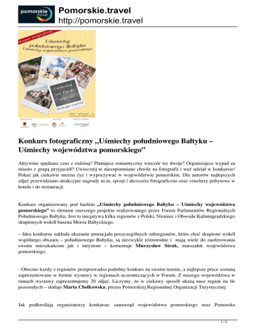 Pomorskie.travel http://pomorskie.travel Konkurs fotograficzny „Uśmiechy południowego Bałtyku – Uśmiechy województwa pomorskiego” Aktywnie spędzasz czas z rodziną? Planujesz romantyczny wieczór we dwoje? Organizujesz wypad za miasto z grupą przyjaciół? Uwiecznij te niezapomniane chwile na fotografii i weź udział w konkursie! Pokaż jak ciekawie można żyć i wypoczywać w województwie pomorskim. Dla autorów najlepszych zdjęć przewidziano atrakcyjne nagrody m.in. sprzęt i akcesoria fotograficzne oraz vouchery pobytowe w hotelu i do restauracji. Konkurs organizowany pod hasłem „Uśmiechy południowego Bałtyku – Uśmiechy województwa pomorskiego” to element szerszego projektu realizowanego przez Forum Parlamentów Regionalnych Południowego Bałtyku. Jest to inicjatywa kilku regionów z Polski, Niemiec i Obwodu Kaliningradzkiego skupionych wokół basenu Morza Bałtyckiego. – Idea konkursu zakłada ukazanie potencjału poszczególnych subregionów, które choć skupione wokół wspólnego obszaru – południowego Bałtyku, są niezwykle różnorodne i mają wiele do zaoferowania swoim mieszkańcom jak i turystom – komentuje Mieczysław Struk, marszałek województwa pomorskiego. - Obecnie każdy z regionów przeprowadza podobny konkurs na swoim terenie, a najlepsze prace zostaną zaprezentowane w formie wystawy w regionach uczestniczących w Forum. Z naszego województwa w ramach wystawy zaprezentujemy 20 zdjęć. Liczymy, że w ciekawy sposób ukażą nasz region na tle pozostałych – dodaje Marta Chełkowska, prezes Pomorskiej Regionalnej Organizacji Turystycznej. Jak podkreślają organizatorzy konkursu: samorząd województwa pomorskiego oraz Pomorska 1/2 Pomorskie.travel http://pomorskie.travel Regionalna Organizacja Turystyczna, fotografie zgłaszane do konkursu mają obrazować jego hasło przewodnie - „Uśmiechy południowego Bałtyku – Uśmiechy województwa pomorskiego”. Przedmiotem fotografii powinny być niestandardowe ujęcia osób (mieszkańców, turystów) lub krajobrazów województwa pomorskiego ukazujące życie codzienne i wypoczynek na terenie województwa oraz uwzględniające wyróżniki kulturowe i przyrodnicze regionu. Poza prezentacją najlepszych prac w formie wystawy, która zagości w regionach partnerskich Forum przewidziano atrakcyjne nagrody: m.in. lustrzankę cyfrową wraz z obiektywami (Canon EOS 600D + 18 - 55 mm IS II + 70-300 mm) Voucher na weekendowy pobyt dla dwóch osób w Bazuny Hotel***&SPA oraz Voucher do Restauracji Gdański Bowke. Regulamin konkursu dostępny stronie: http://pomorskie.travel/Dzieje_sie-KONKURS_FOTOGRAFICZNY jest na Zgłoszenia można przesyłać do 23 kwietnia. Serdecznie zapraszamy do udziału! PCIT 2/2 Powered by TCPDF (www.tcpdf.org)