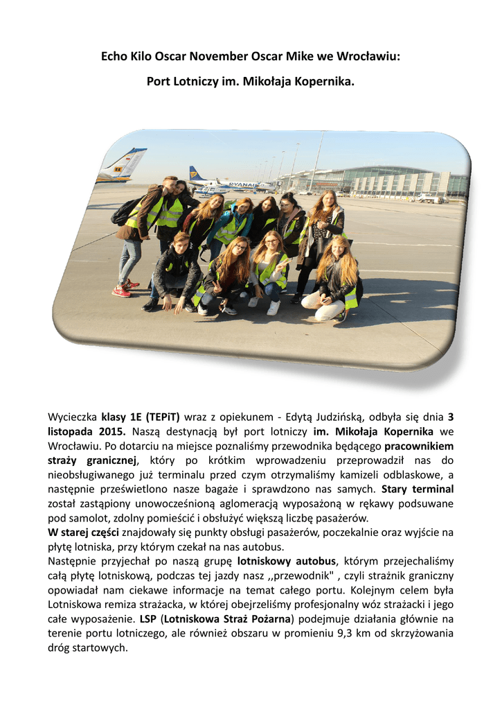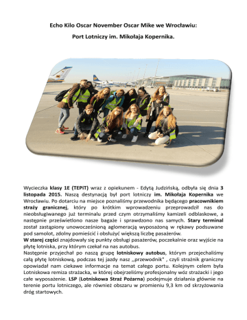 Echo Kilo Oscar November Oscar Mike we Wrocławiu: Port Lotniczy im. Mikołaja Kopernika. Wycieczka klasy 1E (TEPiT) wraz z opiekunem - Edytą Judzińską, odbyła się dnia 3 listopada 2015. Naszą destynacją był port lotniczy im. Mikołaja Kopernika we Wrocławiu. Po dotarciu na miejsce poznaliśmy przewodnika będącego pracownikiem straży granicznej, który po krótkim wprowadzeniu przeprowadził nas do nieobsługiwanego już terminalu przed czym otrzymaliśmy kamizeli odblaskowe, a następnie prześwietlono nasze bagaże i sprawdzono nas samych. Stary terminal został zastąpiony unowocześnioną aglomeracją wyposażoną w rękawy podsuwane pod samolot, zdolny pomieścić i obsłużyć większą liczbę pasażerów. W starej części znajdowały się punkty obsługi pasażerów, poczekalnie oraz wyjście na płytę lotniska, przy którym czekał na nas autobus. Następnie przyjechał po naszą grupę lotniskowy autobus, którym przejechaliśmy całą płytę lotniskową, podczas tej jazdy nasz ,,przewodnik" , czyli strażnik graniczny opowiadał nam ciekawe informacje na temat całego portu. Kolejnym celem była Lotniskowa remiza strażacka, w której obejrzeliśmy profesjonalny wóz strażacki i jego całe wyposażenie. LSP (Lotniskowa Straż Pożarna) podejmuje działania głównie na terenie portu lotniczego, ale również obszaru w promieniu 9,3 km od skrzyżowania dróg startowych. Strażacy wykonali dla nas alarm próbny i pokaz gaszenia pożaru, który był wspaniały. Na tym pokazie zużyli 7 ton wody! Po pokazie udaliśmy się na wieżę strażacką, obejrzeliśmy również całą remizę - pomieszczania, sypialnie, pokoje rozrywek itd. Kolejnym punktem naszej wycieczki była sortownia bagażu, z której od razu udaliśmy się do miejsca odprawy pasażerów w nowym już terminalu, gdzie przy okazji odwiedziliśmy strefę Non Schengen. Wszystkiemu towarzyszył komentarz przewodnika.Po drodze mogliśmy zaobserwować lądujące i startujące samoloty. Po krótkiej przerwie udaliśmy się już do ostatniego punktu naszej wycieczki jakim było spotkanie z grupą saperów straży granicznej, którzy uświadomili nas o wielu niebezpieczeństwach czyhających na nas w portach lotniczych oraz o ich pracy. Mieliśmy również do czynienia ze służbami bezpieczeństwa,ich praca wymaga wielkiej odwagi i dokładności. Posiadają profesjonalny i drogi sprzęt umożliwiający wykrycie przedmiotów niebezpiecznych (bomb, substancji wybuchowych, narkotyków itp.) w bagażach pasażerskich. Pracownik musi meć specjalistyczny strój z kaskiem zabezpieczającym przed np.wybuchem. Strój o którym mowa waży ponad 40 kg,mieliśmy okazję przekonać się na własnej skórze .Niespodzianką było spotkanie z psem specjalizującym się w wyszukiwaniu broni palnej oraz krótki pokaz zorganizowany przez jego opiekuna. Pokazali nam również robota służącego do przenoszenia niebezpiecznych materiałów. Do Wrocławia pojechaliśmy super nowoczesnym pociągiem do samego dworca, a stamtąd już bezpośrednio na lotnisko linią MZK. Do Jeleniej Góry z Wrocławia wróciliśmy również pociagiem, który zabral nas w podróż do przeszłości gdyż był to pociąg RETRO, liczymy na więcej takich wycieczek, na których możemy łaczyć przyjemne z pożytecznym :) Biorąc pod uwagę ilość miejsc, które zwiedziliśmy oraz atrakcji jakie zafundował nam personel lotniska możemy śmiało stwierdzić iż kierunek na którym jesteśmy jest kierunkiem przyszłościowym i wiemy co wiąże się z obowiązkami poszczególnych sekcji działających w portach lotniczych.