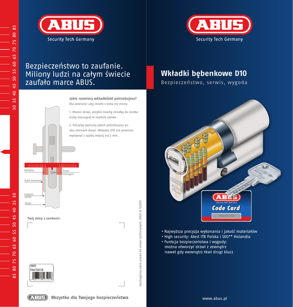 Bezpieczeństwo to zaufanie. Miliony ludzi na całym świecie zaufało marce ABUS. Wkładki bębenkowe D10 Bezpieczeństwo, serwis, wygoda Jakie rozmiary wkładki(ek) potrzebujesz? Dla pewności użyj miarki z boku tej strony. 1. Otwórz drzwi, przyłóż miarkę strzałką do środka śruby mocującej w szyldzie zamka. 2. Odczytaj wymiary jakich potrzebujesz po obu stronach drzwi. Wkładka D10 nie powinna wystawać z szyldu więcej niż 2 mm. Wkładka Śruba mocująca Szyld drzwiowy Drzwi Twój sklep z zamkami: ABUS Fibel E60 GB Zasztregamy sobie prawo do zmian technicznych. ABUS © 12/2011 Grubość szyldu • Najwyższa precyzja wykonania i jakość materiałów • High security: Atest ITB Polska i SKG** Holandia • Funkcja bezpieczeństwa i wygody: można otworzyć drzwi z zewnątrz nawet gdy wewnątrz tkwi drugi klucz www.abus.pl Wkładka bębenkowa D10 Seria D10 - kolory i rozmiary Wkładka bębenkowa ABUS z dziesięcioma zastawkami, bezpiecznym sprzęgłem i atestem ITB Zmierz rozmiar wkładki zgodnie z instrukcją na ostatniej stronie, wypełnij poniższe tabelki i złóż zamówienie w Twoim sklepie! Wkładki dwustronne Zabezpieczenia 8 hartowanych kołków z każdej strony chroni wkładkę przed rozwierceniem. Na diagramie hartowane kołki oznaczono kolorem granatowym. Kształt zastawek ABUS chroni wkładkę przed nową metodą stosowaną przez włamywaczy - ‘bumpingiem’. Rozmiar 30/30 30/35 30/40 30/45 30/50 30/55 30/60 35/35 35/40 Mosiądz Matowy (MM) Rozmiar Ilość Rozmiar Ilość 30/30 35/45 30/35 35/50 30/40 35/55 30/45 40/40 30/50 40/45 30/55 40/50 30/60 45/45 35/35 45/50 35/40 50/50 Półwkładki (zabierak ustawiany w 12 położeniach) System na jeden klucz (KA) Wkładki mogą być dostarczane w wersji na jeden klucz do całego mieszkania/budynku lub dorobione do obecnego klucza D10. Nikiel Perłowy (NP) Ilość Rozmiar Ilość 35/45 35/50 35/55 40/40 40/45 40/50 45/45 45/50 50/50 Rozmiar 10/30 Code Card Nikiel Perłowy (NP) Ilość Rozmiar Ilość Mosiądz Matowy (MM) Rozmiar Ilość Rozmiar Ilość 10/30 Wkładki z gałką (G - rozmiar po stronie gałki) Dorabianie kluczy na podstawie karty kodowej identyfikującej właściciela wkładki. Wygodne bezpieczeństwo Bezpieczne i wygodne funkcje: Wkładkę można otworzyć nawet w sytuacji, gdy od strony mieszkania włożony jest drugi klucz. Płaski nawiercany klucz symetryczny nie rozrywa kieszeni i trafisz nim nawet po ciemku we wkładkę. Atesty potwierdzają zgodność z normami: • PN EN 1303 • SKG** Gotowe zestawy dla wygodnych W ofercie są gotowe zestawy na jeden klucz: wkładka dwustronna + wkładka z gałką dla osób ceniących wygodę. W zestawie taniej niż dwie wkładki osobno. Rozmiar 30/30G 30/35G 30/40G 30/45G 30/50G 30/55G 30/60G 35/30G 35/35G 35/40G 35/45G 35/50G 35/55G 40/30G 40/35G 40/40G Nikiel Perłowy (NP) Ilość Rozmiar Ilość 40/45G 40/50G 45/30G 45/35G 45/40G 45/45G 45/50G 50/30G 50/35G 50/40G 50/45G 50/50G 55/30G 55/35G 60/30G Mosiądz Matowy (MM) Rozmiar Ilość Rozmiar Ilość 30/30G 40/45G 30/35G 40/50G 30/40G 45/30G 30/45G 45/35G 30/50G 45/40G 30/55G 45/45G 30/60G 45/50G 35/30G 50/30G 35/35G 50/35G 35/40G 50/40G 35/45G 50/45G 35/50G 50/50G 35/55G 55/30G 40/30G 55/35G 40/35G 60/30G 40/40G
