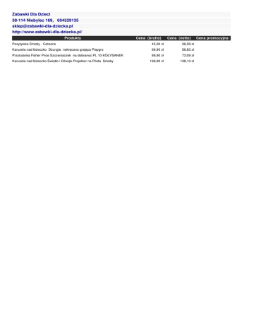 Zabawki Dla Dzieci 38-114 Niebylec 169, 604529135 [email protected] http://www.zabawki-dla-dziecka.pl/ Produkty Cena (brutto) Cena (netto) Pozytywka Smoby - Cotoons 45,00 zł 36,59 zł Karuzela nad łóżeczko Dżungla nakręcana grająca Playgro 69,90 zł 56,83 zł Przytulanka Fisher Price Szczeniaczek na dobranoc PL 10 KOŁYSANEK Karuzela nad łóżeczko Światło i Dźwięk Projektor na Pilota Smoby 89,90 zł 73,09 zł 169,90 zł 138,13 zł Cena promocyjna