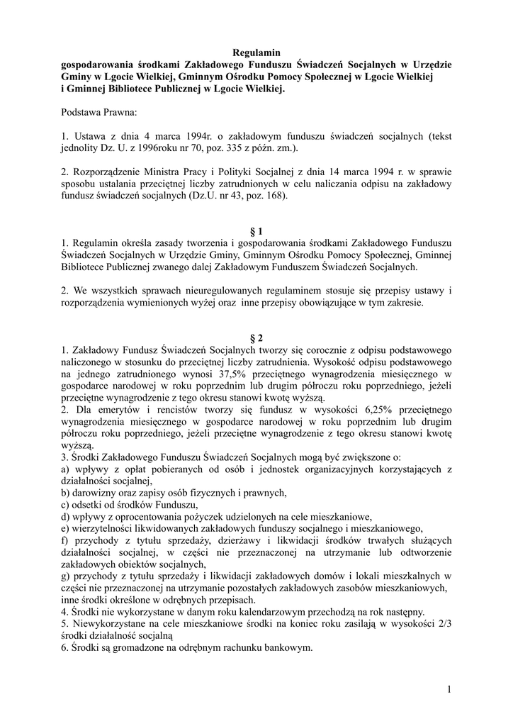 Regulamin gospodarowania środkami Zakładowego Funduszu Świadczeń Socjalnych w Urzędzie Gminy w Lgocie Wielkiej, Gminnym Ośrodku Pomocy Społecznej w Lgocie Wielkiej i Gminnej Bibliotece Publicznej w Lgocie Wielkiej. Podstawa Prawna: 1. Ustawa z dnia 4 marca 1994r. o zakładowym funduszu świadczeń socjalnych (tekst jednolity Dz. U. z 1996roku nr 70, poz. 335 z późn. zm.). 2. Rozporządzenie Ministra Pracy i Polityki Socjalnej z dnia 14 marca 1994 r. w sprawie sposobu ustalania przeciętnej liczby zatrudnionych w celu naliczania odpisu na zakładowy fundusz świadczeń socjalnych (Dz.U. nr 43, poz. 168). §1 1. Regulamin określa zasady tworzenia i gospodarowania środkami Zakładowego Funduszu Świadczeń Socjalnych w Urzędzie Gminy, Gminnym Ośrodku Pomocy Społecznej, Gminnej Bibliotece Publicznej zwanego dalej Zakładowym Funduszem Świadczeń Socjalnych. 2. We wszystkich sprawach nieuregulowanych regulaminem stosuje się przepisy ustawy i rozporządzenia wymienionych wyżej oraz inne przepisy obowiązujące w tym zakresie. §2 1. Zakładowy Fundusz Świadczeń Socjalnych tworzy się corocznie z odpisu podstawowego naliczonego w stosunku do przeciętnej liczby zatrudnienia. Wysokość odpisu podstawowego na jednego zatrudnionego wynosi 37,5% przeciętnego wynagrodzenia miesięcznego w gospodarce narodowej w roku poprzednim lub drugim półroczu roku poprzedniego, jeżeli przeciętne wynagrodzenie z tego okresu stanowi kwotę wyższą. 2. Dla emerytów i rencistów tworzy się fundusz w wysokości 6,25% przeciętnego wynagrodzenia miesięcznego w gospodarce narodowej w roku poprzednim lub drugim półroczu roku poprzedniego, jeżeli przeciętne wynagrodzenie z tego okresu stanowi kwotę wyższą. 3. Środki Zakładowego Funduszu Świadczeń Socjalnych mogą być zwiększone o: a) wpływy z opłat pobieranych od osób i jednostek organizacyjnych korzystających z działalności socjalnej, b) darowizny oraz zapisy osób fizycznych i prawnych, c) odsetki od środków Funduszu, d) wpływy z oprocentowania pożyczek udzielonych na cele mieszkaniowe, e) wierzytelności likwidowanych zakładowych funduszy socjalnego i mieszkaniowego, f) przychody z tytułu sprzedaży, dzierżawy i likwidacji środków trwałych służących działalności socjalnej, w części nie przeznaczonej na utrzymanie lub odtworzenie zakładowych obiektów socjalnych, g) przychody z tytułu sprzedaży i likwidacji zakładowych domów i lokali mieszkalnych w części nie przeznaczonej na utrzymanie pozostałych zakładowych zasobów mieszkaniowych, inne środki określone w odrębnych przepisach. 4. Środki nie wykorzystane w danym roku kalendarzowym przechodzą na rok następny. 5. Niewykorzystane na cele mieszkaniowe środki na koniec roku zasilają w wysokości 2/3 środki działalność socjalną 6. Środki są gromadzone na odrębnym rachunku bankowym. 1 §3 Środki finansowe funduszu przeznacza się na: a) działalność socjalną – 2/3 środków finansowych b) na cele mieszkaniowe -1/3 środków finansowych. §4 Środki Funduszu przeznacza się na finansowanie działalności socjalnej organizowanej na rzecz osób uprawnionych do korzystania z Funduszu w tym: a) pomoc rzeczową (paczki świąteczne) b) zapomogi pieniężne bezzwrotne c) zapomogi losowe bezzwrotne, d) dopłaty do wycieczek turystyczno- krajoznawczych e) dofinansowanie krajowego wypoczynku dzieci i młodzieży w formie wczasów, kolonii, zimowisk, obozów, kolonii zdrowotnych lub wypoczynku urlopowego organizowanego we własnym zakresie, do lat 16, z dofinansowania można korzystać tylko w jednym zakładzie pracy, f) paczki świąteczne dla dzieci pracowników g) finansowanie działalności kulturalno- oświatowej w postaci zakupu biletów na imprezy artystyczne, kulturalne, rozrywkowe i sportowe, h) pożyczki zwrotne na cele mieszkaniowe. §5 1. Ze świadczeń Zakładowego Funduszu Świadczeń Socjalnych mogą korzystać: a) pracownicy Za pracowników uważa się osoby: zatrudnione na podstawie umowy o pracę w Urzędzie Gminy w Lgocie Wielkiej, w Gminnym Ośrodku Pomocy Społecznej w Lgocie Wielkiej, w Gminnej Bibliotece Publicznej w Lgocie Wielkiej- niezależnie od rodzaju umowy o pracę oraz od wymiaru czasu pracy ( proporcjonalnie do czasu zatrudnienia i wymiaru czasu pracy), pracownicy przebywający na urlopach wychowawczych, emerytów i rencistów, którzy rozwiązali umowę o pracę w związku z przejściem na emeryturę, rentę, świadczenie przedemerytalne lub zasiłki przedemerytalne, b) członkowie rodzin osób wymienionych w pkt. a. Członkami rodzin, o których mowa w podpukcie b są: współmałżonkowie, dzieci własne, przysposobione oraz przyjęte na wychowanie w ramach rodziny zastępczej, dzieci współmałżonka, wnuki i rodzeństwo pozostające na utrzymaniu osoby uprawnionej do 18 lat, a jeżeli kształcą się w szkole- do ukończenia nauki, członkowie rodzin po zmarłym pracownikach- jeżeli byli na ich utrzymaniu. 2 §6 1. Przyznanie i wysokość pomocy (dofinansowania) ze środków Funduszu uzależniona jest od sytuacji życiowej, rodzinnej i materialnej, a w przypadku pomocy mieszkaniowej również od sytuacji mieszkaniowej. 2. Podstawą do przyznania ulgowych usług i świadczeń stanowi dochód przypadający na osobę w rodzinie, wskazany w oświadczeniu pracownika. 3. Podstawą ustalenia średniego dochodu przypadającego na członka rodziny są dochody brutto wszystkich członków rodziny pozostających we wspólnym gospodarstwie domowym z 12 miesięcy roku poprzedniego. 4. Pomoc z Funduszu przyznawana będzie do wysokości posiadanych środków według następujących kryteriów: a) pomoc rzeczowa i zapomogi pieniężne bezzwrotne do wysokości posiadanych środków oraz według kryteriów finansowych określonych w tabeli- załącznik nr 1. b) pomoc finansowa (losowa) przyznawana będzie w wypadkach losowych na wniosek pracownika, do wysokości 150% najniższego wynagrodzenia, c) dopłata do wycieczek 