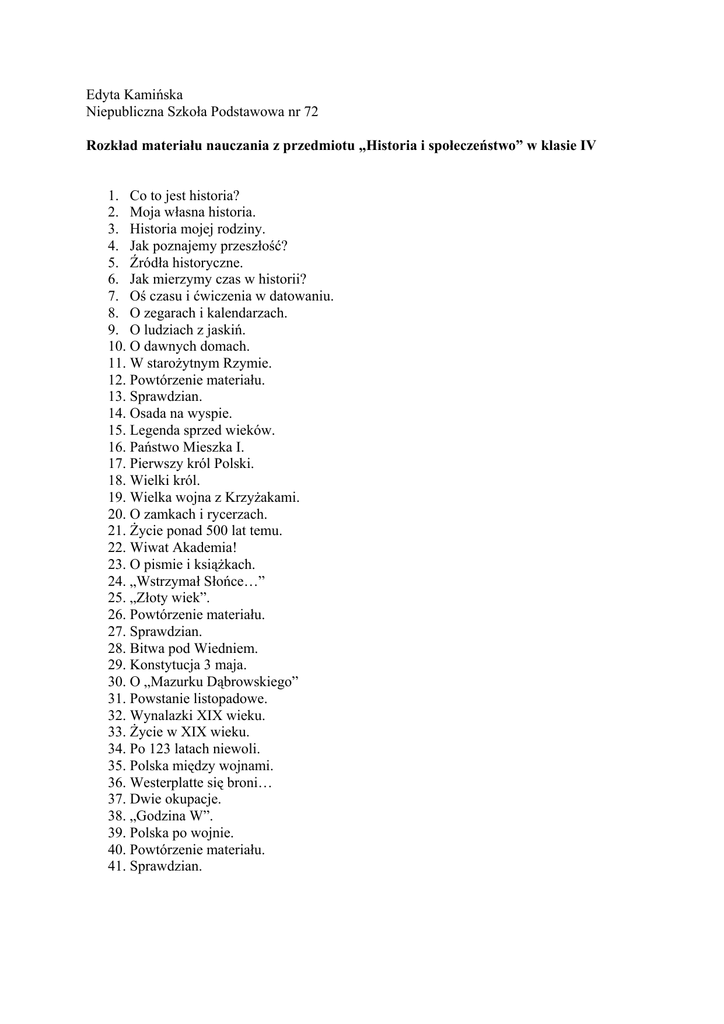 Edyta Kamińska Niepubliczna Szkoła Podstawowa nr 72 Rozkład materiału nauczania z przedmiotu „Historia i społeczeństwo” w klasie IV 1. Co to jest historia? 2. Moja własna historia. 3. Historia mojej rodziny. 4. Jak poznajemy przeszłość? 5. Źródła historyczne. 6. Jak mierzymy czas w historii? 7. Oś czasu i ćwiczenia w datowaniu. 8. O zegarach i kalendarzach. 9. O ludziach z jaskiń. 10. O dawnych domach. 11. W starożytnym Rzymie. 12. Powtórzenie materiału. 13. Sprawdzian. 14. Osada na wyspie. 15. Legenda sprzed wieków. 16. Państwo Mieszka I. 17. Pierwszy król Polski. 18. Wielki król. 19. Wielka wojna z Krzyżakami. 20. O zamkach i rycerzach. 21. Życie ponad 500 lat temu. 22. Wiwat Akademia! 23. O pismie i książkach. 24. „Wstrzymał Słońce…” 25. „Złoty wiek”. 26. Powtórzenie materiału. 27. Sprawdzian. 28. Bitwa pod Wiedniem. 29. Konstytucja 3 maja. 30. O „Mazurku Dąbrowskiego” 31. Powstanie listopadowe. 32. Wynalazki XIX wieku. 33. Życie w XIX wieku. 34. Po 123 latach niewoli. 35. Polska między wojnami. 36. Westerplatte się broni… 37. Dwie okupacje. 38. „Godzina W”. 39. Polska po wojnie. 40. Powtórzenie materiału. 41. Sprawdzian.