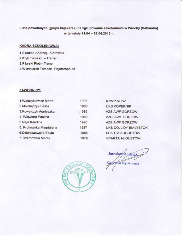 (grupakaiakarek} Lista powołanych na zgrupowanieszko|eniow€w włochy(sabaudia) w terminie11.04- 28.04.2013 r. KADRA SZKOLENIOWA: 1'siemionAndŻej-Kierownik 2.KrykTomasz- Trener 3.PilarskiPiotr-Trener 4.Wichniarek Tomasz-Fizjoterapeuta ZAWODNICY: 1'WalczykiewiczMańa 1987 2'|v|ikołajczyk Beata 1986 3.KowalczykAgnieszka ,1989 4' WiewióraPaulina 1989 5.NajaKarolina 1990 5. KrukowskaMagdalena 6.DzieniszewskaEdyta 1987 '1986 T.Twardowski l\,ilarek 1979 KTWKALISZ UKS KOPERNIK AzS AWF GORZOW AzS AWF GORZOW Azs AWF GoRzÓW UKs DoJL|DYBlAŁYsToK SPARTAAUGUSTÓW SPARTAAUGUSTOW