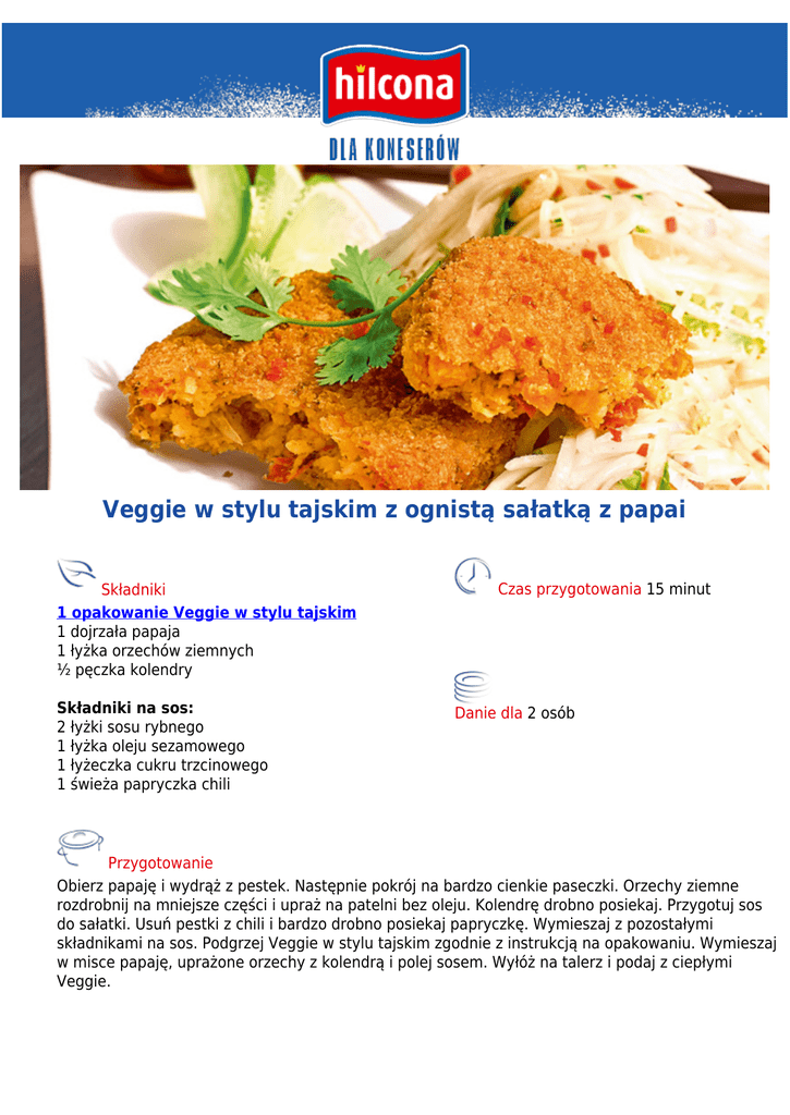 Veggie w stylu tajskim z ognistą sałatką z papai Składniki 1 opakowanie Veggie w stylu tajskim 1 dojrzała papaja 1 łyżka orzechów ziemnych ½ pęczka kolendry Składniki na sos: 2 łyżki sosu rybnego 1 łyżka oleju sezamowego 1 łyżeczka cukru trzcinowego 1 świeża papryczka chili Czas przygotowania 15 minut Danie dla 2 osób Przygotowanie Obierz papaję i wydrąż z pestek. Następnie pokrój na bardzo cienkie paseczki. Orzechy ziemne rozdrobnij na mniejsze części i upraż na patelni bez oleju. Kolendrę drobno posiekaj. Przygotuj sos do sałatki. Usuń pestki z chili i bardzo drobno posiekaj papryczkę. Wymieszaj z pozostałymi składnikami na sos. Podgrzej Veggie w stylu tajskim zgodnie z instrukcją na opakowaniu. Wymieszaj w misce papaję, uprażone orzechy z kolendrą i polej sosem. Wyłóż na talerz i podaj z ciepłymi Veggie.