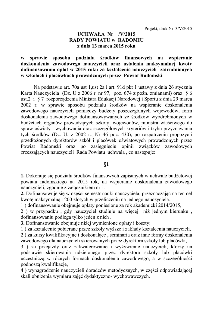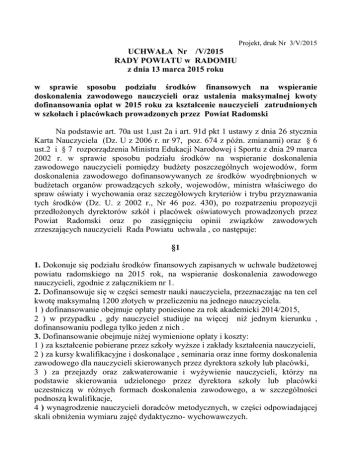Projekt, druk Nr 3/V/2015 UCHWAŁA Nr /V/2015 RADY POWIATU w RADOMIU z dnia 13 marca 2015 roku w sprawie sposobu podziału środków finansowych na wspieranie doskonalenia zawodowego nauczycieli oraz ustalenia maksymalnej kwoty dofinansowania opłat w 2015 roku za kształcenie nauczycieli zatrudnionych w szkołach i placówkach prowadzonych przez Powiat Radomski Na podstawie art. 70a ust 1,ust 2a i art. 91d pkt 1 ustawy z dnia 26 stycznia Karta Nauczyciela (Dz. U z 2006 r. nr 97, poz. 674 z późn. zmianami) oraz § 6 ust.2 i § 7 rozporządzenia Ministra Edukacji Narodowej i Sportu z dnia 29 marca 2002 r. w sprawie sposobu podziału środków na wspieranie doskonalenia zawodowego nauczycieli pomiędzy budżety poszczególnych wojewodów, form doskonalenia zawodowego dofinansowywanych ze środków wyodrębnionych w budżetach organów prowadzących szkoły, wojewodów, ministra właściwego do spraw oświaty i wychowania oraz szczegółowych kryteriów i trybu przyznawania tych środków (Dz. U. z 2002 r., Nr 46 poz. 430), po rozpatrzeniu propozycji przedłożonych dyrektorów szkół i placówek oświatowych prowadzonych przez Powiat Radomski oraz po zasięgnięciu opinii związków zawodowych zrzeszających nauczycieli Rada Powiatu uchwala , co następuje: §1 1. Dokonuje się podziału środków finansowych zapisanych w uchwale budżetowej powiatu radomskiego na 2015 rok, na wspieranie doskonalenia zawodowego nauczycieli, zgodnie z załącznikiem nr 1. 2. Dofinansowuje się w części semestr nauki nauczyciela, przeznaczając na ten cel kwotę maksymalną 1200 złotych w przeliczeniu na jednego nauczyciela. 1 ) dofinansowanie obejmuje opłaty poniesione za rok akademicki 2014/2015, 2 ) w przypadku , gdy nauczyciel studiuje na więcej niż jednym kierunku , dofinansowaniu podlega tylko jeden z nich . 3. Dofinansowanie obejmuje niżej wymienione opłaty i koszty: 1 ) za kształcenie pobierane przez szkoły wyższe i zakłady kształcenia nauczycieli, 2 ) za kursy kwalifikacyjne i doskonalące , seminaria oraz inne formy doskonalenia zawodowego dla nauczycieli skierowanych przez dyrektora szkoły lub placówki, 3 ) za przejazdy oraz zakwaterowanie i wyżywienie nauczycieli, którzy na podstawie skierowania udzielonego przez dyrektora szkoły lub placówki uczestniczą w różnych formach doskonalenia zawodowego, a w szczególności podnoszą kwalifikacje, 4 ) wynagrodzenie nauczycieli doradców metodycznych, w części odpowiadającej skali obniżenia wymiaru zajęć dydaktyczno- wychowawczych. 4. W przypadku uczestnictwa nauczyciela pełniącego funkcję dyrektora szkoły i placówek oświatowych w wyżej wymienionych formach skierowanie udziela Starosta Radomski. §2 Wykonanie uchwały powierza się Zarządowi Powiatu . §3 Uchwała wchodzi w życie z dniem podjęcia z mocą obowiązującą od 1 stycznia 2015 roku. Wnioskodawca : Zarząd Powiatu Uzasadnienie W budżetach szkół i placówek oświatowo- wychowawczych na 2015 rok zostały wyodrębnione środki na dofinansowanie i dokształcanie doskonalenia zawodowego nauczycieli, z uwzględnieniem doradztwa metodycznego – w wysokości 1 % planowanych rocznych środków przeznaczonych na wynagrodzenia osobowe nauczycieli. Zgodnie z rozporządzeniem Ministra Edukacji Narodowej i Sportu w sprawie podziału środków na wspieranie doskonalenia zawodowego nauczycieli pomiędzy budżety poszczególnych wojewodów, form doskonalenia zawodowego dofinansowanych ze środków wyodrębnionych w budżetach organów prowadzących szkoły, wojewodów, ministra właściwego do spraw oświaty i wychowania oraz szczegółowych kryteriów i trybu przyznawania tych środków (Dz. U. z 2002 r. Nr 46, poz. 430) o maksymalnej kwocie dofinansowania oraz formach kształcenia, na które dofinansowanie będzie przyznawane, decyduje Rada Powiatu, uwzględniając propozycje dyrektorów szkół i placówek oświatowych, po uprzednim zasięgnięciu opinii związków zawodowych zrzeszających nauczycieli. Proponowana kwota maksymalnego dofinansowania za semestr wynosi 1 200 złotych za kształcenie pobierane przez szkoły wyższe. Dyrektorzy szkół i placówek oświatowych w terminie do 31 marca 2016 roku złożą sprawozdanie ze sposobu wykorzystania środków przyznanych w 2015 roku na dofinansowanie doskonalenia zawodowego nauczycieli. Wobec powyższego uprzejmie proszę o przyjęcie uchwały w sprawie kwoty dofinansowania i form doskonalenia zawodowego. Zał. Nr 1 do Uchwały Nr /V/2015 Rady Powiatu w Radomiu z dnia 13 marca 2015 roku Zasady podziału środków finansowych na wspieranie doskonalenia zawodowego nauczycieli na 2015 rok Lp. Nazwa jednostki 1. 2. 3. Opłaty i koszty doskonalenia Kwota zawodowego dofinansow. Centrum Kształcenia -opłaty za kształcenie pobierane 1 800 zł. Zawodowego i przez szkoły wyższe i zakłady Ustawicznego w kształcenia nauczycieli Pionkach - wynagrodzenie nauczyciela 24 383 zł. doradcy metodycznego w części odpowiadającej skali obniżenia wymiaru zajęć dydaktycznowychowawczych ( wynagrodzenia wraz z pochodnymi ) 17 602 zł. - opłaty za kursy kwalifikacyjne i doskonalące, seminaria oraz inne formy doskonalenia zawodowego koszty przejazdów oraz 3 200 zł. zakwaterowania Zespół Szkół im. J. - opłaty za kształcenie pobierane Śniadeckiego w przez szkoły wyższe i zakłady Pionkach kształcenia nauczycieli - opłaty za kursy kwalifikacyjne i doskonalące, seminaria oraz inne formy doskonalenia zawodowego -koszty przejazdów oraz zakwaterowania Liceum Ogólnokształcące Pionkach - opłaty za kształcenie pobierane w przez szkoły wyższe i zakłady kształcenia nauczycieli - opłaty za kursy kwalifikacyjne i doskonalące, seminaria oraz inne formy doskonalenia zawodowego koszty przejazdów oraz zakwaterowania 5 800 zł. 16 258 zł. 800 zł. 4 500 zł. 5 339 zł. 1 000 zł. 4. 5. 6. 7. 8. 9. Poradnia PsychologicznoPedagogiczna Pionkach w Zespół Szkół Ponadgimnazjalnych w Iłży Liceum Ogólnokształcące Ił