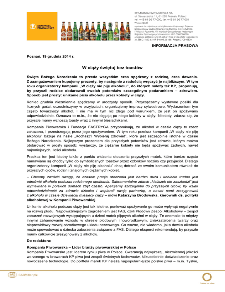INFORMACJA PRASOWA Poznań, 19 grudnia 2014 r. W ciąży świętuj bez toastów Święta Bożego Narodzenia to przede wszystkim czas spędzony z rodziną, czas dawania. Z zaangażowaniem kupujemy prezenty, by następnie z radością wręczyć je najbliższym. W tym roku organizatorzy kampanii „W ciąży nie piję alkoholu”, do których należy też KP, proponują, by przyszli rodzice obdarowali swoich potomków szczególnym podarunkiem – zdrowiem. Sposób jest prosty: unikanie picia alkoholu przez kobiety w ciąży. Koniec grudnia niezmiennie spędzamy w uroczysty sposób. Przyrządzamy wystawne posiłki dla licznych gości, uczestniczymy w przyjęciach, organizujemy imprezy sylwestrowe. Wydarzeniom tym często towarzyszy alkohol. I nie ma w tym nic złego pod warunkiem, że jest on spożywany odpowiedzialnie. Oznacza to m.in., że nie sięgają po niego kobiety w ciąży. Niestety, zdarza się, że przyszłe mamy wznoszą toasty wraz z innymi biesiadnikami. Kompania Piwowarska i Fundacja FASTRYGA przypominają, że alkohol w czasie ciąży to rzecz zakazana, i przestrzegają przez jego spożywaniem. W tym roku przekaz kampanii „W ciąży nie piję alkoholu” bazuje na haśle „Kochasz? Wybieraj zdrowie!”, które jest szczególnie istotne w czasie Bożego Narodzenia. Najlepszym prezentem dla przyszłych potomków jest zdrowie, którym można obdarować w prosty sposób: wystarczy, że ciężarne kobiety nie będą spożywać żadnych, nawet najmniejszych, ilości alkoholu. Przekaz ten jest istotny także z punktu widzenia otoczenia przyszłych matek, które bardzo często namawiane są choćby tylko do symbolicznych toastów przez członków rodziny czy przyjaciół. Dlatego organizatorzy kampanii „W ciąży nie piję alkoholu” chcą dotrzeć ze swoim komunikatem również do przyszłych ojców, rodzin i znajomych ciężarnych kobiet. – Chcemy zwrócić uwagę, że czasem presja otoczenia jest bardzo duża i kobiecie trudno jest odmówić alkoholu podczas rodzinnego spotkania. Sakramentalne zdanie „kieliszek nie zaszkodzi” jest wymawiane w polskich domach zbyt często. Apelujemy szczególnie do przyszłych ojców, by wzięli odpowiedzialność za zdrowie dziecka i wspierali swoją partnerkę, a nawet sami zrezygnowali z alkoholu w czasie dziewięciu miesięcy ciąży – mówi Katarzyna Brodowska, kierownik ds. polityki alkoholowej w Kompanii Piwowarskiej. Unikanie alkoholu podczas ciąży jest tak istotne, ponieważ spożywanie go może wpłynąć negatywnie na rozwój płodu. Najpoważniejszym zagrożeniem jest FAS, czyli Płodowy Zespół Alkoholowy – zespół zaburzeń rozwojowych występujących u dzieci matek pijących alkohol w ciąży. Te anomalie to między innymi zahamowanie wzrostu w okresie płodowym i noworodkowym, zniekształcenia twarzy oraz nieprawidłowy rozwój ośrodkowego układu nerwowego. Co ważne, nie wiadomo, jaka dawka alkoholu może spowodować u dziecka zaburzenia związane z FAS. Dlatego eksperci rekomendują, by przyszłe mamy całkowicie zrezygnowały z alkoholu. Do redaktora: Kompania Piwowarska – Lider branży piwowarskiej w Polsce Kompania Piwowarska jest liderem rynku piwa w Polsce. Gwarancją najwyższej, niezmiennej jakości warzonego w browarach KP piwa jest zespół świetnych fachowców, kilkusetletnie doświadczenie oraz nowoczesne technologie. Do portfela marek KP należą najpopularniejsze polskie piwa – m.in. Tyskie, Żubr, Lech, Dębowe, Redd's, a także międzynarodowe marki premium Pilsner Urquell i Grolsch oraz specjalności, jak warzone według tradycyjnych receptur Tyskie Klasyczne czy kolekcja Książęcego. Wielbicielom piwa niepasteryzowanego w wybranych lokalach firma oferuje też piwo prosto z browaru, czyli Tyskie z tanka. Nowością w portfelu KP od 2013 roku jest cydr – Green Mill Cider – napój produkowany ze 100% soku jabłkowego. Kompania Piwowarska (utworzona w 1999 roku) posiada trzy browary (w Tychach, Poznaniu i Białymstoku) oraz oddziały handlowe na terenie całego kraju. KP od lat jest jednym z czołowych sponsorów sportu, prowadzi także działalność społeczną oraz programy edukacyjne popularyzujące odpowiedzialność i umiar w konsumowaniu alkoholu. Wielkość sprzedaży osiągniętej przez KP w roku finansowym zakończonym 31 marca 2014 r. wyniosła 13,3 mln hektolitrów piwa. Kompania Piwowarska jest częścią międzynarodowej grupy piwowarskiej SABMiller. SABMiller – jeden z największych na świecie producentów piwa Kompania Piwowarska jest częścią jednego z największych na świecie producentów piwa – SABMiller plc. Grupa produkuje lub dystrybuuje piwo na sześciu kontynentach, a jej ogólnoświatowy portfel obejmuje międzynarodowe piwa premium, takie jak Grolsch, Miller Genuine Draft, Peroni Nastro Azzurro czy Pilsner Urquell oraz czołowe marki lokalne, takie jak Aquila, Castle, Miller Lite, Snow czy Tyskie. SABMiller jest jedną z największych na świecie (poza USA) firm rozlewających produkty CocaColi. W roku finansowym zakończonym 31 marca 2014 SABMiller osiągnął przychody w wysokości 34,1 mld USD oraz wypracował zysk brutto (EBITA) w wysokości 6,45 mld USD. SABMiller plc jest notowany na giełdach papierów wartościowych w Londynie i Johannesburgu. Dodatkowych informacji udzielają: Joanna Kwiatkowska Media Relations Manager Kompania Piwowarska ul. Emilii Plater 53, 00-113 Warszawa tel. kom. + 48 695 797 890 [email protected] www.kp.pl Katarzyna Brodowska kierownik ds. polityki alkoholowej Kompania Piwowarska ul. Emilii Plater 53, 00-113 Warszawa tel. + 48 22 321 23 29 tel. kom. 601 572 922 fax. 22 321 23 02 [email protected] www.kp.pl