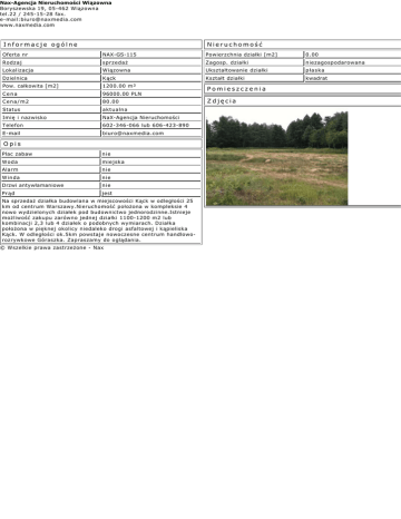 Nax-Agencja Nieruchomości Wiązowna Boryszewska 19, 05-462 Wiązowna tel.22 / 245-15-28 fax. e-mail:[email protected] www.naxmedia.com Informacje ogólne Nieruchomość Oferta nr NAX-GS-115 Powierzchnia działki [m2] 0.00 Rodzaj sprzedaż Zagosp. działki niezagospodarowana Lokalizacja Wiązowna Ukształtowanie działki płaska Dzielnica Kąck Kształt działki kwadrat Pow. całkowita [m2] 1200.00 m² Cena 96000.00 PLN Cena/m2 80.00 Status aktualna Imię i nazwisko NaX-Agencja Nieruchomości Telefon 602-346-066 lub 606-423-890 E-mail [email protected] Opis Plac zabaw nie Woda miejska Alarm nie Winda nie Drzwi antywłamaniowe nie Prąd jest Na sprzedaż działka budowlana w miejscowości Kąck w odległości 25 km od centrum Warszawy.Nieruchomość położona w kompleksie 4 nowo wydzielonych działek pod budownictwo jednorodzinne.Istnieje możliwość zakupu zarówno jednej działki 1100-1200 m2 lub kombinacji 2,3 lub 4 działek o podobnych wymiarach. Działka położona w pięknej okolicy niedaleko drogi asfaltowej i kąpieliska Kąck. W odległości ok.5km powstaje nowoczesne centrum handloworozrywkowe Góraszka. Zapraszamy do oglądania. © Wszelkie prawa zastrzeżone - Nax Pomieszczenia Zdjęcia