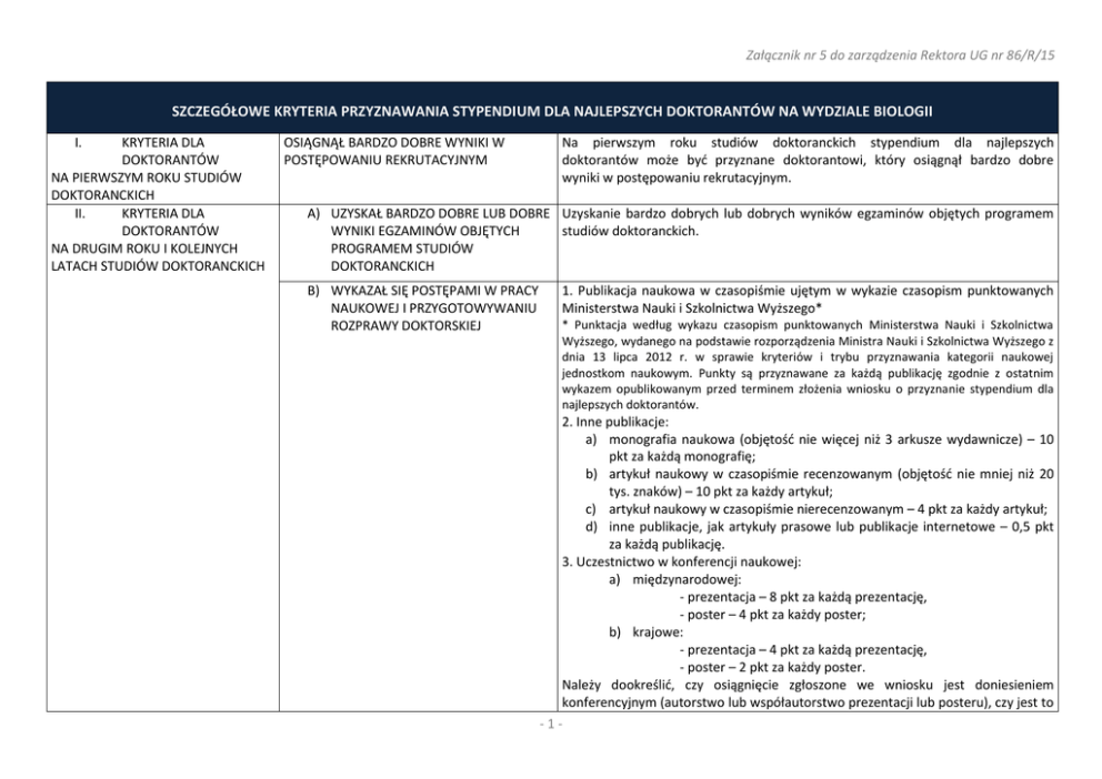 Załącznik nr 5 do zarządzenia Rektora UG nr 86/R/15 SZCZEGÓŁOWE KRYTERIA PRZYZNAWANIA STYPENDIUM DLA NAJLEPSZYCH DOKTORANTÓW NA WYDZIALE BIOLOGII I. KRYTERIA DLA DOKTORANTÓW NA PIERWSZYM ROKU STUDIÓW DOKTORANCKICH II. KRYTERIA DLA DOKTORANTÓW NA DRUGIM ROKU I KOLEJNYCH LATACH STUDIÓW DOKTORANCKICH OSIĄGNĄŁ BARDZO DOBRE WYNIKI W POSTĘPOWANIU REKRUTACYJNYM Na pierwszym roku studiów doktoranckich stypendium dla najlepszych doktorantów może być przyznane doktorantowi, który osiągnął bardzo dobre wyniki w postępowaniu rekrutacyjnym. A) UZYSKAŁ BARDZO DOBRE LUB DOBRE Uzyskanie bardzo dobrych lub dobrych wyników egzaminów objętych programem WYNIKI EGZAMINÓW OBJĘTYCH studiów doktoranckich. PROGRAMEM STUDIÓW DOKTORANCKICH B) WYKAZAŁ SIĘ POSTĘPAMI W PRACY NAUKOWEJ I PRZYGOTOWYWANIU ROZPRAWY DOKTORSKIEJ 1. Publikacja naukowa w czasopiśmie ujętym w wykazie czasopism punktowanych Ministerstwa Nauki i Szkolnictwa Wyższego* * Punktacja według wykazu czasopism punktowanych Ministerstwa Nauki i Szkolnictwa Wyższego, wydanego na podstawie rozporządzenia Ministra Nauki i Szkolnictwa Wyższego z dnia 13 lipca 2012 r. w sprawie kryteriów i trybu przyznawania kategorii naukowej jednostkom naukowym. Punkty są przyznawane za każdą publikację zgodnie z ostatnim wykazem opublikowanym przed terminem złożenia wniosku o przyznanie stypendium dla najlepszych doktorantów. 2. Inne publikacje: a) monografia naukowa (objętość nie więcej niż 3 arkusze wydawnicze) – 10 pkt za każdą monografię; b) artykuł naukowy w czasopiśmie recenzowanym (objętość nie mniej niż 20 tys. znaków) – 10 pkt za każdy artykuł; c) artykuł naukowy w czasopiśmie nierecenzowanym – 4 pkt za każdy artykuł; d) inne publikacje, jak artykuły prasowe lub publikacje internetowe – 0,5 pkt za każdą publikację. 3. Uczestnictwo w konferencji naukowej: a) międzynarodowej: - prezentacja – 8 pkt za każdą prezentację, - poster – 4 pkt za każdy poster; b) krajowe: - prezentacja – 4 pkt za każdą prezentację, - poster – 2 pkt za każdy poster. Należy dookreślić, czy osiągnięcie zgłoszone we wniosku jest doniesieniem konferencyjnym (autorstwo lub współautorstwo prezentacji lub posteru), czy jest to -1- Załącznik nr 5 do zarządzenia Rektora UG nr 86/R/15 C) WYKAZAŁ SIĘ SZCZEGÓLNYM ZAANGAŻOWANIEM W PRACY DYDAKTYCZNEJ również uczestnictwo w konferencji połączone z przedstawieniem prezentacji lub posteru. W przypadku uczestnictwa w konferencji połączonego z przedstawieniem prezentacji lub posteru przyznaje się dodatkowo 2 pkt za uczestnictwo w konferencji międzynarodowej lub 1 pkt za uczestnictwo w konferencji krajowej. Nie przyznaje się punktów za uczestnictwo w konferencji naukowej bez przedstawienia prezentacji lub posteru oraz za udział w zjeździe kół naukowych. 4. Naukowe staże i praktyki odbywające się w Polsce i trwające krócej niż rok – 1 pkt za każdy miesiąc stażu lub praktyki (max. 5 pkt) 5. Naukowe staże zagraniczne lub staże naukowe trwające dłużej niż rok – 2 pkt za każdy miesiąc stażu (max. 15 pkt) 6. Szkolenia – 1 pkt za każde szkolenie 7. Inne rodzaje szkoleń i praktyk (odbywające się np. w przedsiębiorstwach) – 0,5 pkt za każde szkolenie lub każdą praktykę 8. Udział w organizacji konferencji naukowej lub innego wydarzenia naukowego, np. Bałtycki Festiwal Nauki, zajęcia dydaktyczne popularyzujące naukę – 0,5 pkt za każdy udział w organizacji wymienionych przedsięwzięć 9. Nagrody i stypendia: a) zagraniczne – 5 pkt za każdą nagrodę lub każde stypendium; b) krajowe – 2 pkt za każdą nagrodę lub każde stypendium. 10. Uczestnictwo w projektach: a) kierowanie projektem – 10 pkt za każde kierowanie projektem; b) główny wykonawca projektu – 5 pkt za każde główne wykonawstwo w projekcie; c) współudział w projekcie – 1 pkt za każdy współudział w projekcie. 11. Patenty i zgłoszenia patentowe: a) patenty – 10 pkt za każdy patent; b) zgłoszenia patentowe – 6 pkt za każde zgłoszenie. 1. Realizacja ponadwymiarowych godzin dydaktycznych – 3 pkt 2. Organizacja lub prowadzenie szkoleń, warsztatów, koła naukowego lub zajęć dydaktycznych innych niż przewidziane w programie studiów doktoranckich (w wymiarze min. 15 godz.) – 3 pkt za realizację każdego wymienionego przedsięwzięcia (max. 15 pkt) -2- Załącznik nr 5 do zarządzenia Rektora UG nr 86/R/15 III. SPOSÓB UDOKUMENTOWANIA SPEŁNIENIA KRYTERIÓW 1. Osiągnięcie bardzo dobrych wyników w postępowaniu rekrutacyjnym stwierdza się na podstawie protokołu dokumentującego przebieg postępowania rekrutacyjnego w sprawie danego kandydata. 2. Każde osiągnięcie zgłoszone we wniosku musi zostać należycie udokumentowane. 3. W przypadku publikacji – należy dołączyć do wniosku kopię pierwszej strony publikacji. 4. W przypadku udziału w organizacji konferencji naukowej lub innego wydarzenia naukowego należy dołączyć do wniosku zaświadczenie wystawione przez organizatora konferencji lub innego wydarzenia naukowego, określające rodzaj i zakres prac wykonanych przez doktoranta. -3- Załącznik nr 5 do zarządzenia Rektora UG nr 86/R/15 SZCZEGÓŁOWE KRYTERIA PRZYZNAWANIA STYPENDIUM DLA NAJLEPSZYCH DOKTORANTÓW NA WYDZIALE CHEMII I. KRYTERIA DLA DOKTORANTÓW NA PIERWSZYM ROKU STUDIÓW DOKTORANCKICH II. KRYTERIA DLA DOKTORANTÓW NA DRUGIM ROKU I KOLEJNYCH LATACH STUDIÓW DOKTORANCKICH OSIĄGNĄŁ BARDZO DOBRE WYNIKI W POSTĘPOWANIU REKRUTACYJNYM A) UZYSKAŁ BARDZO DOBRE LUB DOBRE WYNIKI EGZAMINÓW OBJĘTYCH PROGRAMEM STUDIÓW DOKTORANCKICH B) WYKAZAŁ SIĘ POSTĘPAMI W PRACY NAUKOWEJ I PRZYGOTOWYWANIU ROZPRAWY DOKTORSKIEJ Na pierwszym roku studiów doktoranckich stypendium dla najlepszych doktorantów może być przyznane doktorantowi, który uzyskał maksymalną liczbę punktów w postępowaniu rekrutacyjnym. Średnia z przedmiotów zaliczonych w roku akademickim poprzedzającym złożenie 