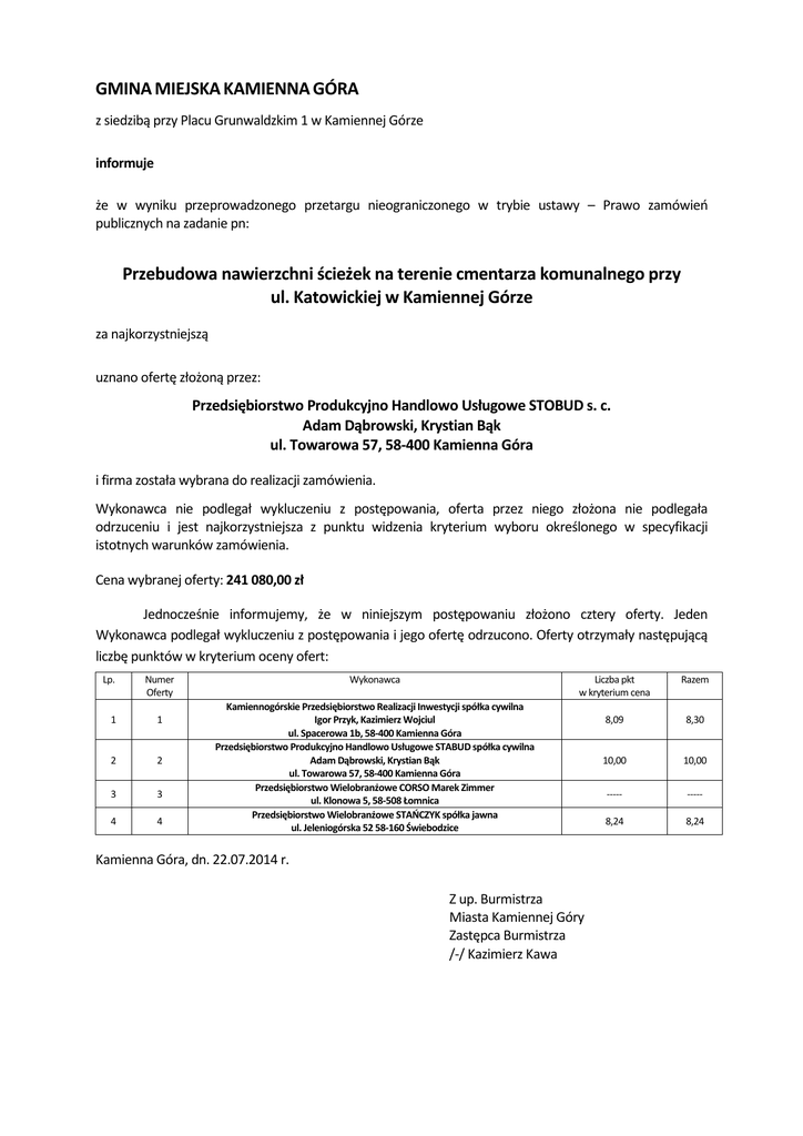 GMINA MIEJSKA KAMIENNA GÓRA z siedzibą przy Placu Grunwaldzkim 1 w Kamiennej Górze informuje że w wyniku przeprowadzonego przetargu nieograniczonego w trybie ustawy – Prawo zamówień publicznych na zadanie pn: Przebudowa nawierzchni ścieżek na terenie cmentarza komunalnego przy ul. Katowickiej w Kamiennej Górze za najkorzystniejszą uznano ofertę złożoną przez: Przedsiębiorstwo Produkcyjno Handlowo Usługowe STOBUD s. c. Adam Dąbrowski, Krystian Bąk ul. Towarowa 57, 58-400 Kamienna Góra i firma została wybrana do realizacji zamówienia. Wykonawca nie podlegał wykluczeniu z postępowania, oferta przez niego złożona nie podlegała odrzuceniu i jest najkorzystniejsza z punktu widzenia kryterium wyboru określonego w specyfikacji istotnych warunków zamówienia. Cena wybranej oferty: 241 080,00 zł Jednocześnie informujemy, że w niniejszym postępowaniu złożono cztery oferty. Jeden Wykonawca podlegał wykluczeniu z postępowania i jego ofertę odrzucono. Oferty otrzymały następującą liczbę punktów w kryterium oceny ofert: Lp. Numer Oferty 1 1 2 2 3 3 4 4 Wykonawca Liczba pkt w kryterium cena Razem 8,09 8,30 10,00 10,00 ----- ----- 8,24 8,24 Kamiennogórskie Przedsiębiorstwo Realizacji Inwestycji spółka cywilna Igor Przyk, Kazimierz Wojciul ul. Spacerowa 1b, 58-400 Kamienna Góra Przedsiębiorstwo Produkcyjno Handlowo Usługowe STABUD spółka cywilna Adam Dąbrowski, Krystian Bąk ul. Towarowa 57, 58-400 Kamienna Góra Przedsiębiorstwo Wielobranżowe CORSO Marek Zimmer ul. Klonowa 5, 58-508 Łomnica Przedsiębiorstwo Wielobranżowe STAŃCZYK spółka jawna ul. Jeleniogórska 52 58-160 Świebodzice Kamienna Góra, dn. 22.07.2014 r. Z up. Burmistrza Miasta Kamiennej Góry Zastępca Burmistrza /-/ Kazimierz Kawa