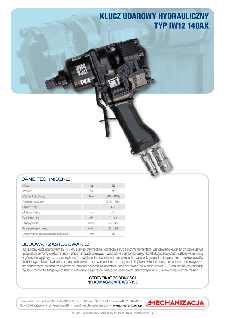 KLUCZ UDAROWY HYDRAULICZNY TYP IW12 140AX DANE TECHNICZNE: Masa kg 10 Trzpień cal ¾ Moment obrotowy Nm 340 - 1632 Rozmiar nasadek S19 - S60 Złącze węży 8SAE Gniazdo węży cal 3/8 Ciśnienie oleju MPa 7 - 14 Przepływ oleju l/min 15 - 45 Przepływ optymalny l/min 20 – 38 Maksymalne dopuszczalne ciśnienie MPa 15 BUDOWA I ZASTOSOWANIE: Hydrauliczny klucz udarowy IW 12 140 AX służy do przykręcania i odkręcania śrub z dużymi momentami. Zastosowanie kluczy IW znacznie ułatwia i przyspiesza remonty ciężkich maszyn, prace na torach kolejowych, wznoszenie i demontaż dużych konstrukcji stalowych itp. Zastosowanie kluczy w górnictwie węglowym znacznie wpłynęło na zwiększenie skuteczności oraz skrócenie czasu odkręcania i dokręcania śrub zamków obudów chodnikowych. Klucze hydrauliczne dają dużo większą moc w odniesieniu do 1 kg wagi niż jakiekolwiek inne klucze o napędzie pneumatycznym czy elektrycznym. Mechanizm udarowy nie przenosi obciążeń na operatora. Czas dokręcania/odkręcania wynosi 8-10 sekund. Klucze posiadają regulację momentu. Mogą być zasilane z niezależnych agregatów o napędzie spalinowym, elektrycznym lub z układów hydraulicznych maszyn. CERTYFIKAT ZGODNOŚCI NR KOMAG/06/ATEX/ST/135 Biuro Techniczno-Handlowe „MECHANIZACJA” Sp. z o.o. tel.: +48 32 782 44 10 ∙ fax: +48 32 782 44 14 PL 40-276 Katowice ∙ ul. Pułaskiego 20 ∙ e-mail: [email protected] ∙ www.mechanizacja.pl NR 017 - Klucz udarowy hydrauliczny typ IW12 140AX - Październik 2014 KLUCZ UDAROWY HYDRAULICZNY TYP IW12 140AX NASADKI ¾”: Nr K 32 K 32 K 32 K 32 K 32 K 32 K 32 K 32 K 32 K 32 K 32 K 32 K 32 K 32 K 32 K 32 K 32 K 32 K 32 K 32 K 32 K 32 K 32 K 32 K 32 K 32 K 32 K 32 K 32 mm 17 18 19 22 24 27 30 32 33 (3/4 W) 34 36 38 41 ‘’AF 13/16 7/8 15/16 1. 1.1/16 1.1/8 1.1/4 1.5/16 1.3/8 1.7/16 1.1/2 1.5/8 1.11/16 1.3/4 1.7/8 2. dł. 45 45 45 48 48 52 52 52 52 55 56 58 58 d1 29 32 32 38 40 41 44 49 49 52 52 54 57 d2 44 44 44 44 44 44 44 44 44 44 44 44 44 t 9 9 9,5 10 12 13 16,5 16,5 17 17 19 21,5 21,5 48 48 48 48 52 52 52 55 55 56 58 58 62 63 66 66 35 38 40 41 41 44 49 49 52 52 54 57 63 63 67 73 44 44 44 44 44 44 44 44 44 44 44 44 44 44 54 54 11 13 13 13 13 16,5 17 19 19 19 21,5 21,5 25 25,5 27 27 Masa (g) 375 320 385 254 430 445 360 420 440 440 460 480 505 380 365 400 395 390 375 425 425 460 510 490 495 685 645 880 1000 Kształt długi Nr K 32 L K 32 L K 32 L K 32 L K 32 L K 32 L K 32 L K 32 L K 32 L K 32 L mm 17 19 22 24 27 30 32 33 (3/4 W) 34 36 dł. 90 90 90 90 90 90 90 90 90 90 d1 29 32 38 40 41 44 49 49 52 52 d2 44 44 44 44 44 44 44 44 44 44 t 9 9,5 10 12 13 16,5 16,5 17 17 19 Dt 63 63 63 63 63 63 63 63 63 62 Masa (g) 800 750 770 750 715 740 840 780 840 790 Elementy łączące do zakrętaków z czopem 4-kątnym wg. DIN 3121 kształt F i H. Nr KB 3290-8 KB 3290-12 KB 3290-16 KB 3295 KB 3270 KB 3275 KB 3219 KB 3221 Oznaczenie Przedłużacz Przedłużacz Przedłużacz Przegub Cardana Pierścień zabezpieczający Kołek zabezpieczający Reduktor ¾” na ½” Adapter ¾” na 1” dł. 205 300 405 110 Ø 36 4x35 65 65 Masa (g) 730 970 1200 575 3 3 380 410 Biuro Techniczno-Handlowe „MECHANIZACJA” Sp. z o.o. tel.: +48 32 782 44 10 ∙ fax: +48 32 782 44 14 PL 40-276 Katowice ∙ ul. Pułaskiego 20 ∙ e-mail: [email protected] ∙ www.mechanizacja.pl NR 017 - Klucz udarowy hydrauliczny typ IW12 140AX - Październik 2014