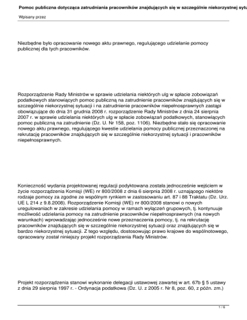 Pomoc publiczna dotycząca zatrudniania pracowników znajdujących się w szczególnie niekorzystnej sytu Wpisany przez Niezbędne było opracowanie nowego aktu prawnego, regulującego udzielanie pomocy publicznej dla tych pracowników. Rozporządzenie Rady Ministrów w sprawie udzielania niektórych ulg w spłacie zobowiązań podatkowych stanowiących pomoc publiczną na zatrudnienie pracowników znajdujących się w szczególnie niekorzystnej sytuacji i na zatrudnienie pracowników niepełnosprawnych zastąpi obowiązujące do dnia 31 grudnia 2008 r. rozporządzenie Rady Ministrów z dnia 24 sierpnia 2007 r. w sprawie udzielania niektórych ulg w spłacie zobowiązań podatkowych, stanowiących pomoc publiczną na zatrudnienie (Dz. U. Nr 158, poz. 1106). Niezbędne stało się opracowanie nowego aktu prawnego, regulującego kwestie udzielania pomocy publicznej przeznaczonej na rekrutację pracowników znajdujących się w szczególnie niekorzystnej sytuacji i pracowników niepełnosprawnych. Konieczność wydania projektowanej regulacji podyktowana została jednocześnie wejściem w życie rozporządzenia Komisji (WE) nr 800/2008 z dnia 6 sierpnia 2008 r. uznającego niektóre rodzaje pomocy za zgodne ze wspólnym rynkiem w zastosowaniu art. 87 i 88 Traktatu (Dz. Urz. UE L 214 z 9.8.2008). Rozporządzenie Komisji (WE) nr 800/2008 stanowi o nowych uregulowaniach w zakresie udzielania pomocy w ramach wyłączeń grupowych, tj. kontynuuje możliwość udzielania pomocy na zatrudnienie pracowników niepełnosprawnych (na nowych warunkach) wprowadzając jednocześnie nowe przeznaczenia pomocy, tj. na rekrutację pracowników znajdujących się w szczególnie niekorzystnej sytuacji oraz znajdujących się w bardzo niekorzystnej sytuacji. Z tego względu, dostosowując prawo krajowe do wspólnotowego, opracowany został niniejszy projekt rozporządzenia Rady Ministrów. Projekt rozporządzenia stanowi wykonanie delegacji ustawowej zawartej w art. 67b § 5 ustawy z dnia 29 sierpnia 1997 r. - Ordynacja podatkowa (Dz. U. z 2005 r. Nr 8, poz. 60, z późn. zm.) 1/6 Pomoc publiczna dotycząca zatrudniania pracowników znajdujących się w szczególnie niekorzystnej sytu Wpisany przez zwanej dalej „ustawą - Ordynacja podatkowa", która upoważniła Radę Ministrów do określania warunków udzielania pomocy m.in. na zatrudnienie, mając na uwadze dopuszczalność i warunki udzielania pomocy państwa określone w przepisach prawa wspólnotowego. Celem niniejszego rozporządzenia jest określenie szczegółowych warunków udzielania niektórych ulg w spłacie zobowiązań podatkowych stanowiących pomoc na rekrutację pracowników znajdujących się w szczególnie niekorzystnej sytuacji i na zatrudnienie pracowników niepełnosprawnych, na podstawie ustawy - Ordynacja podatkowa, w formie programu pomocowego. Pomoc będzie udzielana w drodze decyzji podejmowanych przez organy udzielające pomocy na podstawie art. 67a i art. 67b § 1 pkt 3 lit. h ustawy - Ordynacja podatkowa, w formie odroczenia, rozłożenia na raty lub umorzenia zobowiązania podatkowego. Z uwagi na fakt, iż projekt nie zawiera przepisów technicznych, nie podlega notyfikacji zgodnie z trybem przewidzianym w przepisach dotyczących sposobu funkcjonowania krajowego systemu notyfikacji norm i aktów prawnych. Regulacje zawarte w projektowanym rozporządzeniu są zgodne z warunkami określonymi w rozporządzeniu Komisji (WE) nr 800/2008. W myśl art. 11 rozporządzenia Komisji (WE) nr 800/2008, Państwa Członkowskie zostały zobowiązane do przekazywania sprawozdań rocznych o udzielonej pomocy dla małych i średnich przedsiębiorstw zgodnych z tym rozporządzeniem. Informacje zbiorcze o udzielonej pomocy na rozwój małych i średnich przedsiębiorstw - w ramach przedmiotowego rozporządzenia - będą corocznie przygotowane przez Ministerstwo Finansów, po uprzednim uzyskaniu informacji od Prezesa Urzędu Ochrony Konkurencji i Konsumentów o udzielonej pomocy przez podmioty nie pozostające we właściwości resortu finansów (te podmioty przekazują sprawozdania o udzielonej pomocy bezpośrednio do UOKiK). Projekt rozporządzenia, stanowiący program pomocowy w ramach wyłączeń grupowych, nie podlega notyfikacji. Komisja Europejska jest jedynie powiadamiana nie później niż 20. dnia po wejściu w życie rozporządzenia. Ulgi w spłacie zobowiązań podatkowych, stanowiące pomoc na rekrutację pracowników znajdujących się w szczególnie niekorzystnej sytuacji i na zatrudnienie pracowników niepełnosprawnych, mogą być udzielane w ramach niniejszego rozporządzenia małym, średnim 2/6 Pomoc publiczna dotycząca zatrudniania pracowników znajdujących się w szczególnie niekorzystnej sytu Wpisany przez i dużym przedsiębiorcom, po spełnieniu przez nich warunków określonych w tym rozporządzeniu, bez obowiązku notyfikacji. W niektórych przypadkach, określonych w rozporządzeniu, pomoc podlega notyfikacji jako pomoc indywidualna. W § 1 określony został zakres regulacji z przywołaniem podstawy prawnej udzielania pomocy na rekrutację pracowników znajdujących się w szczególnie niekorzystnej sytuacji i na zatrudnienie pracowników niepełnosprawnych, tj. art. 67a i art. 67b § 1 pkt 3 lit. g ustawy Ordynacja podatkowa. W ust. 2 wymieniono dopuszczalne - w ramach rozporządzenia -- przeznaczenia pomocy publicznej. W ust. 3 wskazano, iż udzielanie pomocy, zgodnie z określonymi w rozporządzeniu warunkami, nie podlega notyfikacji, za wyjątkiem określonych w § 4 ust. 1 rozporządzenia przypadków podlegających notyfikacji. W § 2 zawarto przepisy dotyczące wyłączenia od stosowania przepisów rozporządzenia. Wyłączenia dotyczą następujących obszarów: działalności związanej z wywozem i pomocy uwarunkowanej pierwszeństwem użycia towarów produkcji krajowej, działalności wspierającej produkcję podstawową produktów rolnych objętych rozporządzeniem Komisji (WE) nr 1857/2006 z dnia 15 grudni