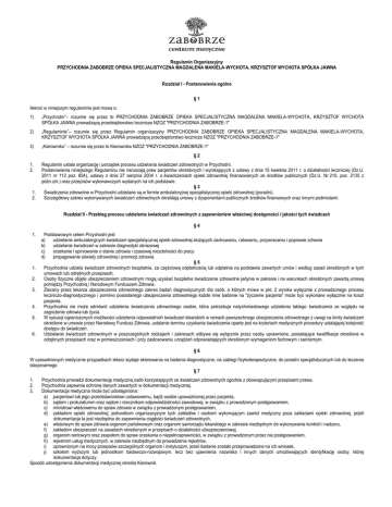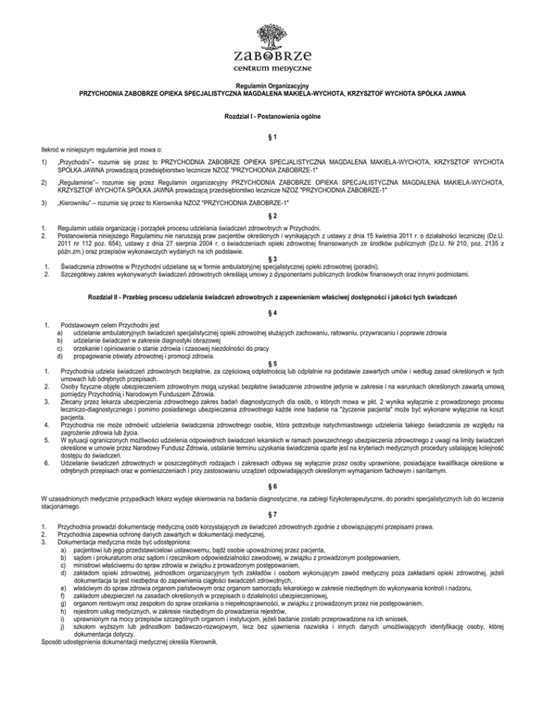 Regulamin Organizacyjny PRZYCHODNIA ZABOBRZE OPIEKA SPECJALISTYCZNA MAGDALENA MAKIELA-WYCHOTA, KRZYSZTOF WYCHOTA SPÓŁKA JAWNA Rozdział I - Postanowienia ogólne §1 Ilekroć w niniejszym regulaminie jest mowa o: 1) „Przychodni”– rozumie się przez to PRZYCHODNIA ZABOBRZE OPIEKA SPECJALISTYCZNA MAGDALENA MAKIELA-WYCHOTA, KRZYSZTOF WYCHOTA SPÓŁKA JAWNA prowadzącą przedsiębiorstwo lecznicze NZOZ "PRZYCHODNIA ZABOBRZE-1" 2) „Regulaminie”– rozumie się przez Regulamin organizacyjny PRZYCHODNIA ZABOBRZE OPIEKA SPECJALISTYCZNA MAGDALENA MAKIELA-WYCHOTA, KRZYSZTOF WYCHOTA SPÓŁKA JAWNA prowadzącą przedsiębiorstwo lecznicze NZOZ "PRZYCHODNIA ZABOBRZE-1" 3) „Kierowniku” – rozumie się przez to Kierownika NZOZ "PRZYCHODNIA ZABOBRZE-1" §2 1. 2. 1. 2. Regulamin ustala organizację i porządek procesu udzielania świadczeń zdrowotnych w Przychodni. Postanowienia niniejszego Regulaminu nie naruszają praw pacjentów określonych i wynikających z ustawy z dnia 15 kwietnia 2011 r. o działalności leczniczej (Dz.U. 2011 nr 112 poz. 654), ustawy z dnia 27 sierpnia 2004 r. o świadczeniach opieki zdrowotnej finansowanych ze środków publicznych (Dz.U. Nr 210, poz. 2135 z późn.zm.) oraz przepisów wykonawczych wydanych na ich podstawie. §3 Świadczenia zdrowotne w Przychodni udzielane są w formie ambulatoryjnej specjalistycznej opieki zdrowotnej (poradni). Szczegółowy zakres wykonywanych świadczeń zdrowotnych określają umowy z dysponentami publicznych środków finansowych oraz innymi podmiotami. Rozdział II - Przebieg procesu udzielania świadczeń zdrowotnych z zapewnieniem właściwej dostępności i jakości tych świadczeń §4 1. 1. 2. 3. 4. 5. 6. Podstawowym celem Przychodni jest a) udzielanie ambulatoryjnych świadczeń specjalistycznej opieki zdrowotnej służących zachowaniu, ratowaniu, przywracaniu i poprawie zdrowia b) udzielanie świadczeń w zakresie diagnostyki obrazowej c) orzekanie i opiniowanie o stanie zdrowia i czasowej niezdolności do pracy d) propagowanie oświaty zdrowotnej i promocji zdrowia. §5 Przychodnia udziela świadczeń zdrowotnych bezpłatnie, za częściową odpłatnością lub odpłatnie na podstawie zawartych umów i według zasad określonych w tych umowach lub odrębnych przepisach. Osoby fizyczne objęte ubezpieczeniem zdrowotnym mogą uzyskać bezpłatne świadczenie zdrowotne jedynie w zakresie i na warunkach określonych zawartą umową pomiędzy Przychodnią i Narodowym Funduszem Zdrowia. Zlecany przez lekarza ubezpieczenia zdrowotnego zakres badań diagnostycznych dla osób, o których mowa w pkt. 2 wynika wyłącznie z prowadzonego procesu leczniczo-diagnostycznego i pomimo posiadanego ubezpieczenia zdrowotnego każde inne badanie na "życzenie pacjenta" może być wykonane wyłącznie na koszt pacjenta. Przychodnia nie może odmówić udzielenia świadczenia zdrowotnego osobie, która potrzebuje natychmiastowego udzielenia takiego świadczenia ze względu na zagrożenie zdrowia lub życia. W sytuacji ograniczonych możliwości udzielenia odpowiednich świadczeń lekarskich w ramach powszechnego ubezpieczenia zdrowotnego z uwagi na limity świadczeń określone w umowie przez Narodowy Fundusz Zdrowia, ustalanie terminu uzyskania świadczenia oparte jest na kryteriach medycznych procedury ustalającej kolejność dostępu do świadczeń. Udzielanie świadczeń zdrowotnych w poszczególnych rodzajach i zakresach odbywa się wyłącznie przez osoby uprawnione, posiadające kwalifikacje określone w odrębnych przepisach oraz w pomieszczeniach i przy zastosowaniu urządzeń odpowiadających określonym wymaganiom fachowym i sanitarnym. §6 W uzasadnionych medycznie przypadkach lekarz wydaje skierowania na badania diagnostyczne, na zabiegi fizykoterapeutyczne, do poradni specjalistycznych lub do leczenia stacjonarnego. §7 1. 2. 3. Przychodnia prowadzi dokumentację medyczną osób korzystających ze świadczeń zdrowotnych zgodnie z obowiązującymi przepisami prawa. Przychodnia zapewnia ochronę danych zawartych w dokumentacji medycznej. Dokumentacja medyczna może być udostępniona: a) pacjentowi lub jego przedstawicielowi ustawowemu, bądź osobie upoważnionej przez pacjenta, b) sądom i prokuraturom oraz sądom i rzecznikom odpowiedzialności zawodowej, w związku z prowadzonym postępowaniem, c) ministrowi właściwemu do spraw zdrowia w związku z prowadzonym postępowaniem, d) zakładom opieki zdrowotnej, jednostkom organizacyjnym tych zakładów i osobom wykonującym zawód medyczny poza zakładami opieki zdrowotnej, jeżeli dokumentacja ta jest niezbędna do zapewnienia ciągłości świadczeń zdrowotnych, e) właściwym do spraw zdrowia organom państwowym oraz organom samorządu lekarskiego w zakresie niezbędnym do wykonywania kontroli i nadzoru, f) zakładom ubezpieczeń na zasadach określonych w przepisach o działalności ubezpieczeniowej, g) organom rentowym oraz zespołom do spraw orzekania o niepełnosprawności, w związku z prowadzonym przez nie postępowaniem, h) rejestrom usług medycznych, w zakresie niezbędnym do prowadzenia rejestrów, i) uprawnionym na mocy przepisów szczególnych organom i instytucjom, jeżeli badanie zostało przeprowadzone na ich wniosek, j) szkołom wyższym lub jednostkom badawczo-rozwojowym, lecz bez ujawnienia nazwiska i innych danych umożliwiających identyfikację osoby, której dokumentacja dotyczy. Sposób udostępnienia dokumentacji medycznej określa Kierownik. §8 W każdej poradni, w miejscu ogólnie dostępnym dla pacjentów powinny być przedstawione informacje o: a) zasadach udzielania świadczeń, b) sposobie rejestracji, c) dniach i godzinach przyjęć, d) nazwiskach lekarzy wraz z tygodniowym harmonogramem pracy i wyszczególnieniem godzin pracy każdego lekarza udzielającego świadczeń. §9 a. b. Lekarze udzielający świadczeń zdrowotnych w poradniach nie mogą w tym samym czasie wykonywać innych obowiązków zawodowych w Zakładzie lub innej pl
