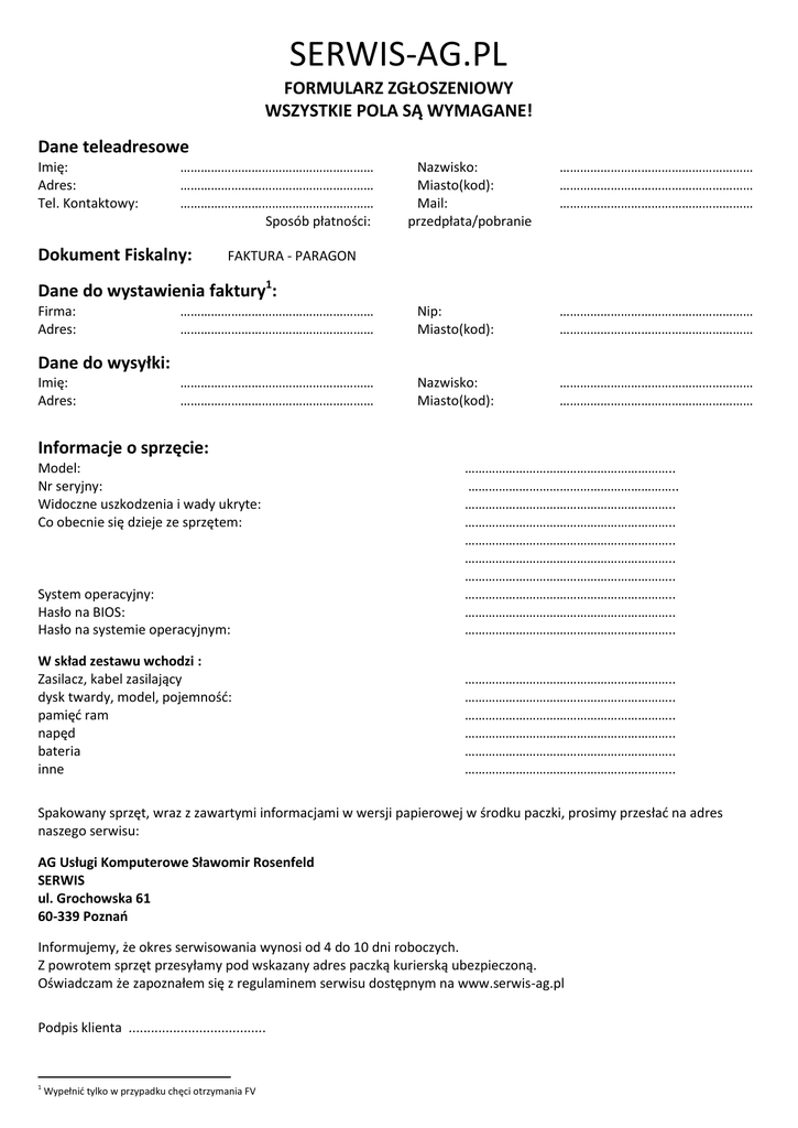 SERWIS-AG.PL FORMULARZ ZGŁOSZENIOWY WSZYSTKIE POLA SĄ WYMAGANE! Dane teleadresowe Imię: Adres: Tel. Kontaktowy: ………………………………………………… ………………………………………………… ………………………………………………… Sposób płatności: Dokument Fiskalny: Nazwisko: Miasto(kod): Mail: przedpłata/pobranie ………………………………………………… ………………………………………………… ………………………………………………… FAKTURA - PARAGON Dane do wystawienia faktury1: Firma: Adres: ………………………………………………… ………………………………………………… Nip: Miasto(kod): ………………………………………………… ………………………………………………… ………………………………………………… ………………………………………………… Nazwisko: Miasto(kod): ………………………………………………… ………………………………………………… Dane do wysyłki: Imię: Adres: Informacje o sprzęcie: Model: Nr seryjny: Widoczne uszkodzenia i wady ukryte: Co obecnie się dzieje ze sprzętem: System operacyjny: Hasło na BIOS: Hasło na systemie operacyjnym: …………………………………………………….. …………………………………………………….. …………………………………………………….. …………………………………………………….. …………………………………………………….. …………………………………………………….. …………………………………………………….. …………………………………………………….. …………………………………………………….. …………………………………………………….. W skład zestawu wchodzi : Zasilacz, kabel zasilający dysk twardy, model, pojemność: pamięć ram napęd bateria inne …………………………………………………….. …………………………………………………….. …………………………………………………….. …………………………………………………….. …………………………………………………….. …………………………………………………….. Spakowany sprzęt, wraz z zawartymi informacjami w wersji papierowej w środku paczki, prosimy przesłać na adres naszego serwisu: AG Usługi Komputerowe Sławomir Rosenfeld SERWIS ul. Grochowska 61 60-339 Poznań Informujemy, że okres serwisowania wynosi od 4 do 10 dni roboczych. Z powrotem sprzęt przesyłamy pod wskazany adres paczką kurierską ubezpieczoną. Oświadczam że zapoznałem się z regulaminem serwisu dostępnym na www.serwis-ag.pl Podpis klienta ..................................... 1 Wypełnić tylko w przypadku chęci otrzymania FV