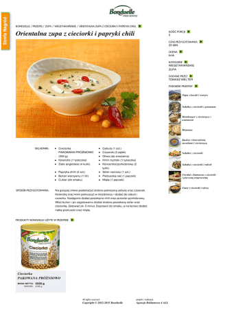 BONDUELLE / PRZEPIS / ZUPA / WEGETARIAŃSKIE / ORIENTALNA ZUPA Z CIECIORKI I PAPRYKI CHILI Orientalna zupa z cieciorki i papryki chili ILOŚĆ PORCJI 5 CZAS PRZYGOTOWANIA 25 MIN OCENA brak KATEGORIE WEGETARIAŃSKIE ZUPA DODANE PRZEZ TOMASZ WELTER PODOBNE PRZEPISY Zupa z kaczki i warzyw Sałatka z cieciorki z granatem Hamburger z ciecierzycy z ananasem Hummus Kuskus z kurczakiem, morelami i ciecierzycą SKŁADNIKI: Cieciorka PAKOWANA PRÓŻNIOWO (250 g) Kolendra (1 łyżeczka) Ziele angielskie (4 kulki) Papryka chilli (2 szt.) Bulion warzywny (1 litr) Cukier (do smaku) SPOSÓB PRZYGOTOWANIA: Cebula (1 szt.) Czosnek (3 ząbki) Oliwa (do smażenia) Kmin rzymski (1 łyżeczka) Koncentrat pomidorowy (2 łyżki) Seler naciowy (1 szt.) Pietruszka nać (1 pęczek) Mięta (1 pęczek) Na gorącej oliwie podsmażyć drobno pokrojoną cebulę oraz czosnek. Kolendrę oraz kmin pokruszyć w moździerzu i dodać do cebuli i czosnku. Następnie dodać posiekane chili oraz przecier pomidorowy. Wlać bulion i po zagotowaniu dodać drobno posiekany seler oraz cieciorkę. Gotować ok. 5 minut. Doprawić do smaku, a na koniec dodać natkę pietruszki oraz miętę. PRODUKTY BONDUELLE UŻYTE W PRZEPISIE Cieciorka PAKOWANA PRÓŻNIOWO MASA NETTO: 2550 ODCIEK: 2100 g g All rights reserved projekt i realizacja Copyright © 2012-2015 Bonduelle Agencja Reklamowa 4 ALL Sałatka z cieciorki Sałatka z cieciorki i rukoli Crostini z humusem z cieciorki i pieczoną wieprzowiną Curry z cieciorki i tykwy