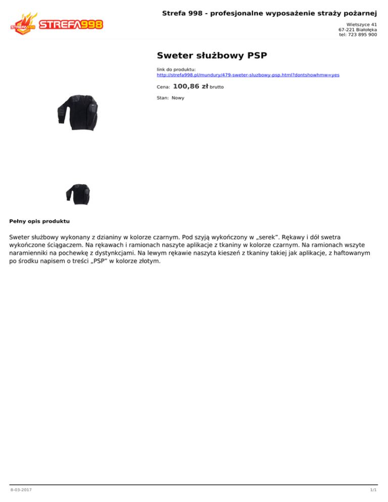 Strefa 998 - profesjonalne wyposażenie straży pożarnej Wietszyce 41 67-221 Białołęka tel: 723 895 900 Sweter służbowy PSP link do produktu: http://strefa998.pl/mundury/479-sweter-sluzbowy-psp.html?dontshowhmw=yes Cena: 100,86 zł brutto Stan: Nowy Pełny opis produktu Sweter służbowy wykonany z dzianiny w kolorze czarnym. Pod szyją wykończony w „serek”. Rękawy i dół swetra wykończone ściągaczem. Na rękawach i ramionach naszyte aplikacje z tkaniny w kolorze czarnym. Na ramionach wszyte naramienniki na pochewkę z dystynkcjami. Na lewym rękawie naszyta kieszeń z tkaniny takiej jak aplikacje, z haftowanym po środku napisem o treści „PSP” w kolorze złotym. 8-03-2017 1/1