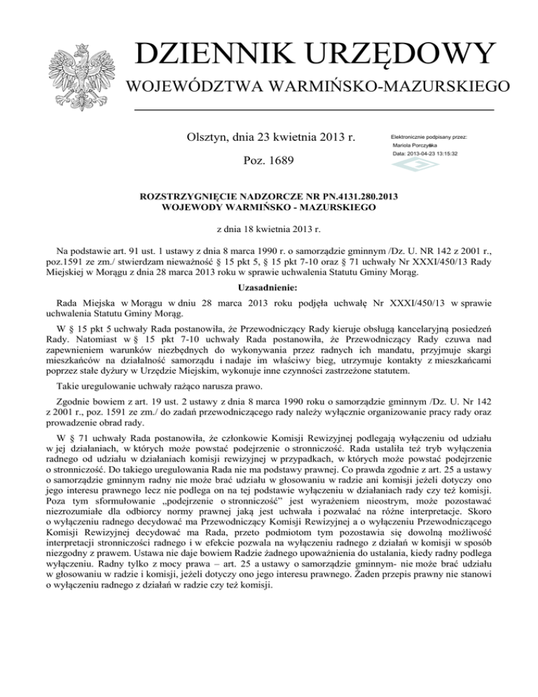 DZIENNIK URZĘDOWY WOJEWÓDZTWA WARMIŃSKO-MAZURSKIEGO Olsztyn, dnia 23 kwietnia 2013 r. Elektronicznie podpisany przez: Mariola Porczyńska Poz. 1689 Data: 2013-04-23 13:15:32 ROZSTRZYGNIĘCIE NADZORCZE NR PN.4131.280.2013 WOJEWODY WARMIŃSKO - MAZURSKIEGO z dnia 18 kwietnia 2013 r. Na podstawie art. 91 ust. 1 ustawy z dnia 8 marca 1990 r. o samorządzie gminnym /Dz. U. NR 142 z 2001 r., poz.1591 ze zm./ stwierdzam nieważność § 15 pkt 5, § 15 pkt 7-10 oraz § 71 uchwały Nr XXXI/450/13 Rady Miejskiej w Morągu z dnia 28 marca 2013 roku w sprawie uchwalenia Statutu Gminy Morąg. Uzasadnienie: Rada Miejska w Morągu w dniu 28 marca 2013 roku podjęła uchwałę Nr XXXI/450/13 w sprawie uchwalenia Statutu Gminy Morąg. W § 15 pkt 5 uchwały Rada postanowiła, że Przewodniczący Rady kieruje obsługą kancelaryjną posiedzeń Rady. Natomiast w § 15 pkt 7-10 uchwały Rada postanowiła, że Przewodniczący Rady czuwa nad zapewnieniem warunków niezbędnych do wykonywania przez radnych ich mandatu, przyjmuje skargi mieszkańców na działalność samorządu i nadaje im właściwy bieg, utrzymuje kontakty z mieszkańcami poprzez stałe dyżury w Urzędzie Miejskim, wykonuje inne czynności zastrzeżone statutem. Takie uregulowanie uchwały rażąco narusza prawo. Zgodnie bowiem z art. 19 ust. 2 ustawy z dnia 8 marca 1990 roku o samorządzie gminnym /Dz. U. Nr 142 z 2001 r., poz. 1591 ze zm./ do zadań przewodniczącego rady należy wyłącznie organizowanie pracy rady oraz prowadzenie obrad rady. W § 71 uchwały Rada postanowiła, że członkowie Komisji Rewizyjnej podlegają wyłączeniu od udziału w jej działaniach, w których może powstać podejrzenie o stronniczość. Rada ustaliła też tryb wyłączenia radnego od udziału w działaniach komisji rewizyjnej w przypadkach, w których może powstać podejrzenie o stronniczość. Do takiego uregulowania Rada nie ma podstawy prawnej. Co prawda zgodnie z art. 25 a ustawy o samorządzie gminnym radny nie może brać udziału w głosowaniu w radzie ani komisji jeżeli dotyczy ono jego interesu prawnego lecz nie podlega on na tej podstawie wyłączeniu w działaniach rady czy też komisji. Poza tym sformułowanie „podejrzenie o stronniczość” jest wyrażeniem nieostrym, może pozostawać niezrozumiałe dla odbiorcy normy prawnej jaką jest uchwała i pozwalać na różne interpretacje. Skoro o wyłączeniu radnego decydować ma Przewodniczący Komisji Rewizyjnej a o wyłączeniu Przewodniczącego Komisji Rewizyjnej decydować ma Rada, przeto podmiotom tym pozostawia się dowolną możliwość interpretacji stronniczości radnego i w efekcie pozwala na wyłączeniu radnego z działań w komisji w sposób niezgodny z prawem. Ustawa nie daje bowiem Radzie żadnego upoważnienia do ustalania, kiedy radny podlega wyłączeniu. Radny tylko z mocy prawa – art. 25 a ustawy o samorządzie gminnym- nie może brać udziału w głosowaniu w radzie i komisji, jeżeli dotyczy ono jego interesu prawnego. Żaden przepis prawny nie stanowi o wyłączeniu radnego z działań w radzie czy też komisji. Dziennik Urzędowy Województwa Warmińsko-Mazurskiego –2– Poz. 1689 Dlatego też należało orzec jak w sentencji. Od niniejszego rozstrzygnięcia przysługuje prawo wniesienia skargi do Wojewódzkiego Sądu Administracyjnego w Olsztynie, za pośrednictwem Wojewody Warmińsko-Mazurskiego, w terminie 30 dni od daty jego otrzymania. Wojewoda w/z Jan Maścianica Wicewojewoda