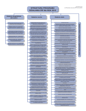 załącznik nr 3 do Programu działania PIP na rok 2015 STRUKTURA PROGRAMU DZIAŁANIA PIP NA ROK 2015 Zadania długofalowe 2013-2015 OBNIŻENIE POZIOMU RYZYKA ZAWODOWEGO W GRUPIE ZAKŁADÓW O WYSOKIEJ SKALI ZAGROŻEŃ ZAWODOWYCH (WZMOŻONY NADZÓR) OGRANICZENIE ZAGROŻEŃ WYPADKOWYCH POPRZEZ WDRAŻANIE ELEMENTÓW ZARZĄDZANIA BEZPIECZEŃSTWEM PRACY W ZAKŁADACH, W KTÓRYCH WYSTĄPIŁY WYPADKI PRZY PRACY EGZEKWOWANIE PRAW PRACOWNICZYCH W ZAKRESIE WYPŁATY WYNAGRODZEŃ I INNYCH ŚWIADCZEŃ ZE STOSUNKU PRACY EGZEKWOWANIE PRZESTRZEGANIA PRZEPISÓW PRAWA WOBEC PRACOWNIKÓW TYMCZASOWYCH EGZEKWOWANIE PRZESTRZEGANIA PRZEPISÓW PRAWA PRACY, W TYM BEZPIECZEŃSTWA I HIGIENY PRACY, W PODMIOTACH LECZNICZYCH EGZEKWOWANIE PRZESTRZEGANIA PRZEPISÓW DOT. CZASU PROWADZENIA POJAZDU, PRZERW I CZASU ODPOCZYNKU (DZIAŁANIA W RAMACH KRAJOWEJ STRATEGII) ORAZ CZASU PRACY KIEROWCÓW KAMPANIA INFORMACYJNO – PROMOCYJNA „BEZPIECZEŃSTWO PRACY ZALEŻY OD CIEBIE” OCENA PRZESTRZEGANIA PRZEPISÓW PRAWA PRACY, W TYM BHP, W JEDNOSTKACH ORGANIZACYJNYCH POMOCY SPOŁECZNEJ KAMPANIA INFORMACYJNO – PREWENCYJNA „SZANUJ ŻYCIE! BEZPIECZNA PRACA W GOSPODARSTWIE ROLNYM” OCENA PRZESTRZEGANIA PRZEPISÓW PRAWA PRACY W GOSPODARSTWACH OGRODNICZYCH DZIAŁANIA KONTROLNE W CELU OGRANICZENIA ZAGROŻEŃ ZWIĄZANYCH Z NANOMATERIAŁAMI ELIMINOWANIE ZAGROŻEŃ WYPADKOWYCH W BUDOWNICTWIE POPRAWA PRZESTRZEGANIA PRZEPISÓW PRAWA PRACY, W TYM BEZPIECZEŃSTWA I HIGIENY PRACY, W PODZIEMNYCH ZAKŁADACH GÓRNICZYCH POPRAWA PRZESTRZEGANIA PRZEPISÓW PRAWA PRACY, W TYM BEZPIECZEŃSTWA I HIGIENY PRACY, W FIRMACH ŚWIADCZĄCYCH USŁUGI GÓRNICZE W PODZIEMNYCH ZAKŁADACH GÓRNICZYCH OGRANICZENIE ZAGROŻEŃ WYPADKOWYCH PRZY EKSPLOATACJI URZĄDZEŃ ODSTAWY UROBKU, TRANSPORTU MATERIAŁÓW I JAZDY LUDZI POD ZIEMIĄ OCENA STANU BEZPIECZEŃSTWA W ZAKRESIE ORGANIZACJI PRACY ORAZ EKSPLOATACJI URZĄDZEŃ ELEKTROENERGETYCZNYCH OGRANICZENIE ZAGROŻEŃ ZAWODOWYCH W ZAKŁADACH PRODUKCJI PREFABRYKATÓW BUDOWLANYCH, W TYM BETONOWYCH I STOLARKI BUDOWLANEJ ORAZ W CEGIELNIACH ZAPEWNIENIE BEZPIECZNYCH WARUNKÓW PRACY W ZAKŁADACH NOWO POWSTAŁYCH Zadania stałe WYPADKI PRZY PRACY KONTROLE PRZESTRZEGANIA PRZEPISÓW BHP PODCZAS USUWANIA WYROBÓW ZAWIERAJĄCYCH AZBEST Z OBIEKTÓW BUDOWLANYCH I PRZEMYSŁOWYCH PROFILAKTYCZNE BADANIA LEKARSKIE KONTROLE NOWYCH MASZYN, URZĄDZEŃ, ŚRODKÓW OCHRONY INDYWIDUALNEJ ORAZ WYROBÓW PIROTECHNICZNYCH W ZAKRESIE OCENY ICH ZGODNOŚCI Z WYMAGANIAMI ZASADNICZYMI SZKOLENIE W DZIEDZINIE BEZPIECZEŃSTWA I HIGIENY PRACY PRZESTRZEGANIE PRZEPISÓW DOTYCZĄCYCH ZATRUDNIANIA OSÓB NIEPEŁNOSPRAWNYCH OCENA RYZYKA ZAWODOWEGO ROBOTY WYKONYWANE W MIEJSCACH OGÓLNODOSTĘPNYCH (ZAGROŻENIA O CHARAKTERZE PUBLICZNYM) FUNKCJONOWANIE SŁUŻBY BHP PRZESTRZEGANIE UPRAWNIEŃ PRACOWNICZYCH ZWIĄZANYCH Z RODZICIELSTWEM PRZESTRZEGANIE PRZEPISÓW PRAWA PRACY DOT. ZATRUDNIANIA MŁODOCIANYCH KONTROLA LEGALNOŚCI ZATRUDNIENIA I INNEJ PRACY ZAROBKOWEJ OBYWATELI POLSKICH KONTROLA LEGALNOŚCI ZATRUDNIENIA, INNEJ PRACY ZAROBKOWEJ ORAZ WYKONYWANIA PRACY PRZEZ CUDZOZIEMCÓW PRZESTRZEGANIE PRZEZ AGENCJE ZATRUDNIENIA PRZEPISÓW USTAWY O PROMOCJI ZATRUDNIENIA I INSTYTUCJACH RYNKU PRACY REALIZOWANIE ZADAŃ INSTYTUCJI ŁĄCZNIKOWEJ KONTROLE JEDNOSTEK: MON, MSW, ABW, SG, SW, POLICJI PRZESTRZEGANIE PRZEPISÓW O URLOPACH WYPOCZYNKOWYCH KONTROLE PRZESTRZEGANIA PRZEPISÓW USTAWY O PRODUKTACH BIOBÓJCZYCH KONTROLE DOT. PROBLEMATYKI REACH OGRANICZENIE ZAGROŻEŃ ŚRODOWISKA PRACY ZWIĄZANYCH Z CZYNNIKAMI RAKOTWÓRCZYMI I MUTAGENNYMI OGRANICZENIE ZAGROŻEŃ ŚRODOWISKA PRACY W WYBRANYCH ZAKŁADACH BRANŻY PALIWOWEJ POPRAWA BEZPIECZEŃSTWA PRACY PRZY BUDOWIE I EKSPLOATACJI SIECI I INSTALACJI GAZOWYCH GAZU ZIEMNEGO EGZEKWOWANIE SPEŁNIANIA MINIMALNYCH I ZASADNICZYCH WYMAGAŃ DOT. BHP KONTROLE DOT. PROBLEMATYKI CLP PRZESTRZEGANIE PRZEPISÓW USTAWY O ORGANIZMACH GENETYCZNIE ZMODYFIKOWANYCH – ZAMKNIĘTE UŻYCIE GMO ZAGROŻENIA ZWIĄZANE Z WYSTĘPOWANIEM HAŁASU W ŚRODOWISKU PRACY BEZPIECZEŃSTWO W RUCHU ZAKŁADÓW GÓRNICZYCH PODCZAS PROWADZENIA PRAC WIERTNICZYCH DOT. WĘGLOWODORÓW KONTROLA DANYCH ZAWARTYCH W DRUKU ZUS IWA OGRANICZENIE ZAGROŻEŃ ŚRODOWISKA PRACY W WYBRANYCH ZAKŁADACH AZOTOWYCH KONTROLE PRACODAWCÓW, KTÓRYM PODWYŻSZONO SKŁADKĘ NA UBEZPIECZENIE WYPADKOWE ELIMINOWANIE NIEPRAWIDŁOWOŚCI ZWIĄZANYCH Z NIEWŁAŚCIWĄ ORGANIZACJĄ STANOWISK PRACY W STREFACH ZAGROŻENIA WYBUCHEM KONTROLE ZWIĄZANE Z OPINIOWANIEM WNIOSKÓW W SPRAWIE WYDANIA ZGODY NA WYŁĄCZNIE ELEKTRYCZNE OŚWIETLENIE POMIESZCZEŃ STAŁEJ PRACY LUB NA ICH LOKALIZOWANIE PONIŻEJ POZIOMU TERENU EGZEKWOWANIE PRZESTRZEGANIA PRZEPISÓW BEZPIECZEŃSTWA I HIGIENY PRACY PRZY WYKONYWANIU PRAC W LEŚNICTWIE ZWIĄZANYCH Z POZYSKIWANIEM I ZRYWKĄ DREWNA CZAS PRACY OGRANICZANIE ZAGROŻEŃ ZAWODOWYCH PRACOWNIKÓW WYKONUJĄCYCH ROBOTY TOROWE OGRANICZANIE ZAGROŻEŃ WYPADKOWYCH PRZY EKSPLOATACJI WÓZKÓW JEZDNIOWYCH Z NAPĘDEM SILNIKOWYM PRZECIWDZIAŁANIE NEGATYWNYM SKUTKOM STRESU W MIEJSCU PRACY KONTROLE WYPŁACANIA WYNAGRODZENIA ZASADNICZEGO (WYNIKAJĄCEGO WPROST Z UMOWY O PRACĘ) ORAZ TERMINOWOŚCI TYCH WYPŁAT KONTROLE PLACÓWEK HANDLOWYCH KONTROLE ZWIĄZANE Z WYDAWANIEM ZEZWOLEŃ NA PRACĘ DZIECI KONTROLE NA WNIOSEK PONADZAKŁADOWYCH STRUKTUR ZWIĄZKOWYCH ORAZ INNYCH PODMIOTÓW KONTROLE ZWIĄZANE Z BADANIEM SKARG PROMOCJA ZAGADNIEŃ OCHRONY PRACY WŚRÓD UCZNIÓW I STUDENTÓW – PROGRAM EDUKACYJNY „KULTURA BEZPIECZEŃSTWA” PROGRAM PREWENCYJNY DLA MIKROZAKŁADÓW „ZDOBĄDŹ DYPLOM PIP” KONKURSY PROMUJĄCE POŻĄDANE POSTAWY W ZAKRESIE OCHRONY PRACY OCENA REALIZACJI CELÓW ZAŁOŻONYCH W PROGRAMACH PREWENCYJNYCH DZIAŁANIA ZWIĄZANE Z ART. 37A USTAWY O PIP KONTROLE SPRAWDZAJĄCE REALIZACJĘ ŚRODKÓW PRAWNYCH KRÓTKIE KONTROLE W BUDOWNICTWIE UKIERUNKOWANE NA LIKWIDACJĘ BEZPOŚREDNICH ZAGROŻEŃ DLA ŻYCIA LUB ZDROWIA PRACUJĄCYCH Zadania własne okręgowych inspektoratów pracy EGZEKWOWANIE PRZESTRZEGANIA PRZEPISÓW PRAWA PRACY PRZY ZATRUDNIANIU Zadania roczne