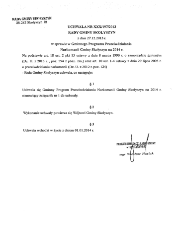 R A D A G M I N Y SKOŁYSZYN 3 8 - 2 4 2 Skołyszyn 1 2 UCHWAŁA N R X X X / 1 9 7 / 2 0 1 3 R A D Y G M I N Y SKOŁYSZYN z d n i a 27.12.2013 r. w s p r a w i e w G m i n n e g o P r o g r a m u Przeciwdziałania N a r k o m a n i i G m i n y Skołyszyn n a 2 0 1 4 r . N a p o d s t a w i e a r t . 1 8 u s t . 2 p k t 1 5 u s t a w y z d n i a 8 m a r c a 1 9 9 0 r. o samorządzie g m i n n y m ( D z . U . z 2 0 1 3 r. , p o z . 5 9 4 z późn. z m . ) o r a z a r t . 1 0 u s t . 1-4 u s t a w y z d n i a 2 9 l i p c a 2 0 0 5 r. o przeciwdziałaniu n a r k o m a n i i ( D z . U . z 2 0 1 2 r. p o z . 1 2 4 ) - R a d a G m i n y Skołyszyn u c h w a l a , c o następuje: §1 U c h w a l a się G m i n n y P r o g r a m Przeciwdziałaniu N a r k o m a n i i G m i n y Skołyszyn n a 2 0 1 4 r . stanowiący załącznik n r 1 d o uchwały. §2 W y k o n a n i e uchwały p o w i e r z a się Wójtowi G m i n y Skołyszyn. §3 Uchwała w c h o d z i w życie z d n i e m 0 1 . 0 1 . 2 0 1 4 r . Załącznik n r 1 d o Uchwały N r X X X / 1 9 7 / 2 0 1 3 38-242 SKoiyszy^ R a d y G m i n y Skołyszyn z d n i a 2 7 . 1 2 . 2 0 1 3 r. G M I N N Y P R O G R A M PRZECIWDZIAŁANIA N A R K O M A N I I G M I N Y SKOŁYSZYN N A R O K 2014 G m i n n y P r o g r a m Przeciwdziałania N a r k o m a n i i G m i n y Skołyszyn n a 2 0 1 4 r. z w a n y d a l e j „Gminnym P r o g r a m e m " został o p r a c o w a n y w o p a r c i u o 1 0 u s t . 1-4 u s t a w y z d n i a 2 9 l i p c a 2 0 0 5 r. o przeciwdziałaniu n a r k o m a n i i ( D z . U . z 2 0 1 2 r . p o z . 1 2 4 ) w związku z a r t . 1 8 u s t . 2 p k t 1 5 u s t a w y z d n i a 8 m a r c a 1 9 9 0 r. o samorządzie g m i n n y m ( D z . U . z 2 0 1 3 r., p o z . 5 9 4 z późn. z m . ) . G m i n n y P r o g r a m s t a n o w i część g m i n n e j s t r a t e g i i rozwiązywania problemów społecznych i uwzględnia z a d a n i a wynikające z u s t a w y o przeciwdziałaniu n a r k o m a n i i . Cele p r o g r a m u Celem Gminnego Programu Przeciwdziałania N a r k o m a n i i jest konstruowanie i r e a l i z a c j a l o k a l n y c h z a s a d p o l i t y k i społecznej p o p r z e z p o d e j m o w a n i e działań zmierzających d o o g r a n i c z e n i a zażywania narkotyków, przeciwdziałnia p o w s t a w a n i u i u s u w a n i u następstw i c h nadużywania: • podniesienie p o z i o m u w i e d z y społeczeństwa n a t e m a t problemów związanych z używaniem środków p s y c h o a k t y w n y c h i możliwości z a p o b i e g a n i a z j a w i s k u , • u p o w s z e c h n i a n i e z d r o w e g o s t y l u życia wśród d z i e c i i młodzieży, • wzrost zaangażowania (wspieranie społeczności lokalnych w 1 działania l o k a l n y c h i n i c j a t y w działań p r o f i l a k t y c z n y c h profilaktyczne n a terenie szkół, o r g a n i z a c j i pozarządowych), • udzielanie rodzinom, w których występują problemy narkomanii rodzinom osób pomocy psychospołecznej i p r a w n e j , • pomoc społeczna dotkniętych środowiskiem socjalnego. osobom ubóstwem tych i uzależnionym wykluczeniem i społeczenym osób z w y k o r z y s t a n i e m p r a c y i socjalenj uzależnionych integrowanie oraz ze kontaktu Zadanie I Podniesienie poziomu wiedzy społeczeństwa na temat problemów związanych z używaniem środków p s y c h o a k t y w n y c h i możliwości z a p o b i e g a n i a t e m u z j a w i s k u p o p r z e z : a ) artykuły w p r a s i e l o k a l n e j , n a s t r o n i e i n t e r n e t o w e j G m i n y Skołyszyn n a t e m a t n a r k o m a n i i , skutkach używania środków p s y c h o a k t y w n y c h oraz sposobu zapobiegania i leczenia uzależnienia, b ) z a k u p l i t e r e a t u r y i materiałów e d u k a c y j n y c h ( u l o t k i , b r o s z u r y , p l a k a t y , płyty C D ) w c e l u r o z p r o w a d z e n i a i c h wśród uczniów, n a u c z y c i e l i i rodziców, c ) realizację programów p r o f i l a k t y c z n y c h w szkołach n a t e r e n i e G m i n y Skołyszyn ( w a r s z t a t y , konkursy, spektakle teatralne, koncerty), d ) o r g a n i z o w a n i e szkoleń, spotkań dotyczących p r o f i l a k t y k i i rozwiązywania problemów z narkomanią. Zadanie I I Leczenie, rehabilitacja i integracja osób uzależnionych z środowiskiem lokalnym z w y k o r z y s t a n i e m pracy socjalnej i k o n t a k t u socjalnego poprzez: a ) u d z i e l e n i e o s o b o m z a i n t e r e s o w a n y m i n f o r m a c j i o ośrodkach t e r a p e u t y c z n y c h , b ) świadczenie p o m o c y psychospołecznej o r a z p r a w n e j o s o b o m uzależnionym i r o d z i n o m osób uzależnionych, c ) współpraca z G m i n n y m Ośrodkiem P o m o c y Społecznej w Skołyszynie. Zadanie I I I O g r a n i c z a n i e szkód z d r o w o t n y c h i społecznych p o p r z e z : a ) r o z p o w s z e c h n i a n i e i n f o r m a c j i o r y z y k u zakażenia żółtaczką t y p u B i C , w i r u s e m H I V , gruźlicą o r a z r y z y k u p r z e d a w k o w a n i a n a r k o t y k u , c ) w s p i e r a n i e programów r e d u k c j i szkód z d r o w o t n y c h i społecznych, a d r e s o w a n y c h d o c z y n n y c h użytkowników narkotyków, d ) współpraca z o r g a n i z a c j a m i zajmującymi się p r o b l e m e m uzależnień. Źródła i z a s a d y f i n a n s o w a n i a G m i n e g o P r o g r a m u Przeciwdziałania N a r k o m a n i i G m i n y Skołyszyn n a r o k 2 0 1 4 . Z a d a n i a wynikające z G m i n n e g o P r o g r a m u r e a l i z o w a n e będą z e środków pochodzących z opłat z a k o r z y s t a n i e z zezwoleń n a sprzedaż napojów a l k o h o l o w y c h . Łączna k w o t a p r z e z n a c z o n a n a realizację G m i n n e g o P r o g r a m u Przeciwdziałnia N a r k o m a n i i w 2 0 1 4 r. w y n i e s i e 7 0 0 0 , 0 0 zł. n PRZEWODNICCY RAD w mgr GMINY SROLYSZYNI] W i e n i a w Hi siak