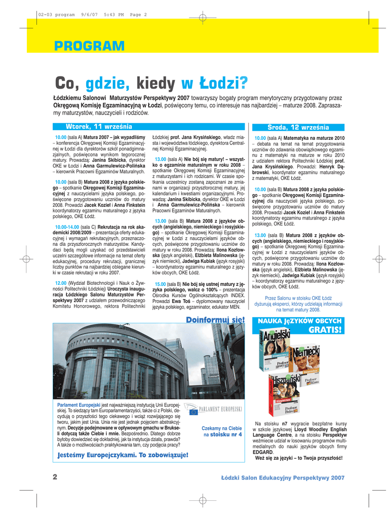 02-03 program 9/6/07 5:43 PM Page 2 PROGRAM Co, gdzie, kiedy w ¸odzi? ¸ódzkiemu Salonowi Maturzystów Perspektywy 2007 towarzyszy bogaty program merytoryczny przygotowany przez Okr´gowà Komisj´ Egzaminacyjnà w ¸odzi, poÊwi´cony temu, co interesuje nas najbardziej – maturze 2008. Zapraszamy maturzystów, nauczycieli i rodziców. Wtorek, 11 wrzeÊnia 10.00 (sala A) Matura 2007 – jak wypadliÊmy – konferencja Okr´gowej Komisji Egzaminacyjnej w ¸odzi dla dyrektorów szkó∏ ponadgimnazjalnych, poÊwi´cona wynikom tegorocznej matury. Prowadzà: Janina Skibicka, dyrektor OKE w ¸odzi i Anna Garmulewicz-Poliƒska – kierownik Pracowni Egzaminów Maturalnych. 10.00 (sala B) Matura 2008 z j´zyka polskiego – spotkanie Okr´gowej Komisji Egzaminacyjnej z nauczycielami j´zyka polskiego, poÊwi´cone przygotowaniu uczniów do matury 2008. Prowadzi Jacek Kozie∏ i Anna Finkstein koordynatorzy egzaminu maturalnego z j´zyka polskiego, OKE ¸ódê. Âroda, 12 wrzeÊnia ¸ódzkiej prof. Jana Krysiƒskiego, w∏adz miasta i województwa ∏ódzkiego, dyrektora Centralnej Komisji Egzaminacyjnej. 13.00 (sala A) Nie bój si´ matury! – wszystko o egzaminie maturalnym w roku 2008 – spotkanie Okr´gowej Komisji Egzaminacyjnej z maturzystami i ich rodzicami. W czasie spotkania uczestnicy zostanà zapoznani ze zmianami w organizacji przysz∏orocznej matury, jej kalendarium i kwestiami organizacyjnymi. Prowadzà: Janina Skibicka, dyrektor OKE w ¸odzi i Anna Garmulewicz-Poliƒska – kierownik Pracowni Egzaminów Maturalnych. 10.00-14.00 (sala C) Rekrutacja na rok akademicki 2008/2009 – prezentacja oferty edukacyjnej i wymagaƒ rekrutacyjnych, przeznaczona dla przysz∏orocznych maturzystów. Kandydaci b´dà mogli uzyskaç od przedstawicieli uczelni szczegó∏owe informacje na temat oferty edukacyjnej, procedury rekrutacji, granicznej liczby punktów na najbardziej oblegane kierunki w czasie rekrutacji w roku 2007. 13.00 (sala B) Matura 2008 z j´zyków obcych (angielskiego, niemieckiego i rosyjskiego) – spotkanie Okr´gowej Komisji Egzaminacyjnej w ¸odzi z nauczycielami j´zyków obcych, poÊwi´cone przygotowaniu uczniów do matury w roku 2008. Prowadzà: Ilona Koz∏owska (j´zyk angielski), El˝bieta Malinowska (j´zyk niemiecki), Jadwiga Kubiak (j´zyk rosyjski) – koordynatorzy egzaminu maturalnego z j´zyków obcych, OKE ¸ódê. 12.00 (Wydzia∏ Biotechnologii i Nauk o ˚ywnoÊci Politechniki ¸ódzkiej) Uroczysta inauguracja ¸ódzkiego Salonu Maturzystów Perspektywy 2007 z udzia∏em przewodniczàcego Komitetu Honorowego, rektora Politechniki 15.00 (sala B) Nie bój si´ ustnej matury z j´zyka polskiego, walcz o 100% – prezentacja OÊrodka Kursów Ogólnokszta∏càcych INDEX. Prowadzi Ewa ToÊ – dyplomowany nauczyciel j´zyka polskiego, egzaminator, edukator MEN. Doinformuj si´! 10.00 (sala A) Matematyka na maturze 2010 – debata na temat na temat przygotowania uczniów do zdawania obowiàzkowego egzaminu z matematyki na maturze w roku 2010 z udzia∏em rektora Politechniki ¸ódzkiej prof. Jana Krysiƒskiego. Prowadzi: Henryk Dàbrowski, koordynator egzaminu maturalnego z matematyki, OKE ¸ódê. 10.00 (sala B) Matura 2008 z j´zyka polskiego – spotkanie Okr´gowej Komisji Egzaminacyjnej dla nauczycieli j´zyka polskiego, poÊwi´cone przygotowaniu uczniów do matury 2008. Prowadzi Jacek Kozie∏ i Anna Finkstein koordynatorzy egzaminu maturalnego z j´zyka polskiego, OKE ¸ódê. 13.00 (sala B) Matura 2008 z j´zyków obcych (angielskiego, niemieckiego i rosyjskiego) – spotkanie Okr´gowej Komisji Egzaminacyjnej w ¸odzi z nauczycielami j´zyków obcych, poÊwi´cone przygotowaniu uczniów do matury w roku 2008. Prowadzà: Ilona Koz∏owska (j´zyk angielski), El˝bieta Malinowska (j´zyk niemiecki), Jadwiga Kubiak (j´zyk rosyjski) – koordynatorzy egzaminu maturalnego z j´zyków obcych, OKE ¸ódê. Przez Salonu w stoisku OKE ¸ódê dy˝urujà eksperci, którzy udzielajà informacji na temat matury 2008. NAUKA J´ZYKÓW OBCYCH GRATIS! Parlament Europejski jest najwa˝niejszà instytucjà Unii Europejskiej. To siedzàcy tam EuroparlamentarzyÊci, tak˝e ci z Polski, decydujà o przysz∏oÊci tego ciekawego i wcià˝ rozwijajàcego si´ tworu, jakim jest Unia. Unia nie jest jednak poj´ciem abstrakcyjnym. Decyzje podejmowane w op∏ywowym gmachu w Brukseli dotyczà tak˝e Ciebie i mnie. BezpoÊrednio. Dlatego dobrze by∏oby dowiedzieç si´ dok∏adniej, jak ta instytucja dzia∏a, prawda? A tak˝e o mo˝liwoÊciach praktykowania tam, czy podj´cia pracy? JesteÊmy Europejczykami. To zobowiàzuje! 2 Czekamy na Ciebie na stoisku nr 4 Na stoisku n7 wygracie bezp∏atne kursy w szkole j´zykowej Lloyd Woodley English Language Centre, a na stoisku Perspektyw weêmiecie udzia∏ w losowaniu programów multimedialnych do nauki j´zyków obcych firmy EDGARD. Weê si´ za j´zyki – to Twoja przysz∏oÊç! ¸ódzki Salon Edukacyjny Perspektywy 2007