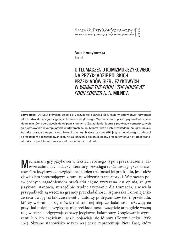 Rocznik Przekładoznawczy 1 Anna Rzemykowska Toruń O TŁUMACZENIU KOMIZMU JĘZYKOWEGO NA PRZYKŁADZIE POLSKICH PRZEKŁADÓW GIER JĘZYKOWYCH W WINNIE-THE-POOH I THE HOUSE AT POOH CORNER A. A. MILNE’A M echanizm gry językowej w tekstach różnego typu i przeznaczenia, zawsze zajmujący badaczy literatury, przyciąga także uwagę językoznawców. Gra językowa, ze względu na stopień trudności jej przekładu, jest także zjawiskiem interesującym z punktu widzenia translatoryki. W pracach poświęconych zagadnieniom przekładu często wyrażana jest opinia, że gry językowe stanowią szczególnie trudne wyzwanie dla tłumacza, a w wielu przypadkach są wręcz na granicy przekładalności. Agnieszka Koroniejenko zwraca uwagę na fakt, że nawet ci autorzy podręczników teorii przekładu, którzy wzbraniają się mówić o absolutnej nieprzekładalności, używają na przykład pojęcia „względna nieprzekładalność” wszędzie tam, gdzie ważną rolę w tekście odgrywają zabawy językowe, kalambury, żonglowanie wyrazami lub ich częściami, gdzie pojawiają się idiomy (Koroniejenko 1995: 157). Skrajne stanowisko w tym względzie reprezentuje Piotr Fast, który 76 ANNA RZEMYKOWSKA wyrażenia oparte na grze słów określa jako „radykalnie nieprzetłumaczalne” (Fast 1991: 24). Termin gra językowa, mimo iż posługują się nim przedstawiciele zarówno językoznawstwa, jak i literaturoznawstwa, nie został dotąd sprecyzowany w żadnej z tych dyscyplin. Najogólniej ujmuje się go jako zespół zabiegów stylistycznych, w różnym stopniu przekraczających reguły kodu językowego w warstwie strukturalnej i semantycznej. Ewa Jędrzejko wskazuje, że zasadą tak rozumianej gry językowej jest transformacja lub modyfikacja elementów struktury formalnej i semantycznej tekstu. Sygnałem gry w tekście literackim jest więc każde sfunkcjonalizowane naruszenie (ilościowe i jakościowe) zwykłych reguł użycia i budowy znaku z mocy kodu językowego (Jędrzejko 1997: 67). Należy jednak podkreślić, że pojęcie „gra językowa” odnosi się wyłącznie do świadomej manipulacji językiem, nie dotyczy zaś mimowolnej niezręczności językowej osoby tworzącej tekst, zwyczajnych niezamierzonych błędów w wypowiedzi, nawiasem mówiąc często wywołujących rozbawienie u odbiorców. Gra językowa często służy jako narzędzie komizmu językowego. W swoją grę, której tworzywem jest język, autor wciąga czytelnika. Celem jego gry z odbiorcą jest wywołanie efektu komicznego, wywołanie rozbawienia u czytającego. Czytelnik – rodzimy użytkownik danego języka – zna rządzące językiem reguły i spodziewa się pewnych zachowań językowych. Wypowiedź niezgodna z oczekiwaniami odbiorcy, naruszająca reguły kodu, zaskakuje i może bawić. Ta rozbieżność między oczekiwaniem odbiorcy a realizacją wypowiedzi wynikająca ze świadomej manipulacji autora systemem języka stanowi mechanizm komizmu językowego w tekstach operujących grą językową. Ewa Teodorowicz-Hellman wyraża pogląd, że tłumaczenie komizmu językowego sprawia najwięcej trudności w przekładzie. Żart, dowcip, zabawa słowem w języku oryginału nie zawsze znajdują bowiem ekwiwalent w języku przekładu. Z powodu różnic systemowych między dwoma językami tłumacz nie może stosować tych samych zabiegów w celu utworzenia dowcipu językowego. Tak więc tzw. granice przekładalności bardzo wyraźnie dają znać o sobie właśnie przy przekładzie komizmu (Teodorowicz-Hellman 1997: 210). Interesujący przykład użycia gry językowej jako źródła komizmu w literaturze dla dzieci stanowią Winnie-the-Pooh i e House at Pooh Corner Alexandra Alana Milne’a. Gra językowa przybiera w nich wiele różnych postaci, występuje zarówno w narracji, jak i w wypowiedziach bohaterów. O TŁUMACZENIU KOMIZMU JĘZYKOWEGO NA PRZYKŁADZIE POLSKICH PRZEKŁADÓW GIER JĘZYKOWYCH... 77 Milne stosuje różnorodne rodzaje gier językowych, łamie reguły obowiązujące na wielu płaszczyznach języka – składniowej, semantycznej, leksykalnej, fonetycznej i graficznej. Chciałabym omówić jeden z typów tworzonych przez niego gier językowych, a mianowicie gry funkcjonujące w sferze znaczeń oraz rozwiązania zastosowane przy ich przekładzie na język polski. (Obie książki przełożone zostały na język polski przez Irenę Tuwim, a Winnie-the-Pooh doczekała się również drugiego przekładu autorstwa Moniki Adamczyk). Przy opisie strategii translatorskich chciałabym dodatkowo zwrócić uwagę na możliwości oraz wynikające ze specyfiki języka docelowego trudności z przekładem omawianych gier. Pierwszym ze zjawisk z dziedziny semantyki, które leży u podstaw semantycznych gier językowych, jest wieloznaczność jednostek leksykalnych. Terminu wieloznaczność używam dla określenia faktu niejednoznaczności wyrazów izolowanych zgodnie z wysuniętym przez Macieja Grochowskiego postulatem odrzucenia tradycyjnego rozróżnienia homonimii i polisemii jako odrębnych faktów językowych. W tradycyjnym ujęciu fakt niejednoznaczności izolowanych wyrazów bywa w dwojaki sposób interpretowany: albo przyjmuje się, że dany wyraz ma więcej niż jedno znaczenie, albo wyróżnia się dwa lub większą liczbę wyrazów o identycznej postaci, z których każdy jest jednoznaczny, ale ma inne znaczenie. Pierwszy sposób interpretacji niejednoznaczności prowadzi do wyróżnienia zjawiska polisemii, a drugi – zjawiska homonimii. Z punktu widzenia synchronicznej semantyki leksykalnej opozycja polisemia–homonimia stanowi bowiem jedynie opozycję odzwierciedlającą różnice w konwencji opisu tego samego zjawiska niejednoznaczności (Grochowski 1982: 72). Tworzone przez A. A. Milne’a gry językowe, opierające się na wyrazach wieloznacznych, polegają na zestawieniu obu znaczeń danego wyrazu i zaskakującym przejściu od jednego z nich do drugiego. Mechanizm ten ilustrują przykłady: 1. Wha