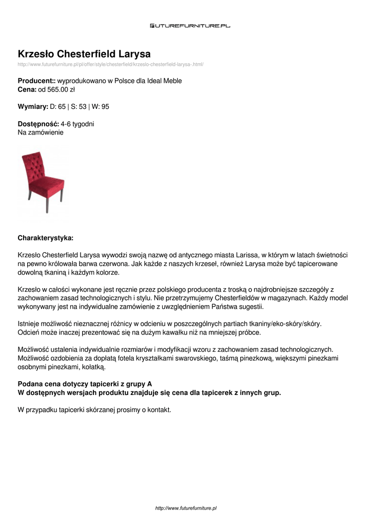 Krzesło Chesterfield Larysa http://www.futurefurniture.pl/pl/offer/style/chesterfield/krzeslo-chesterfield-larysa-.html/ Producent:: wyprodukowano w Polsce dla Ideal Meble Cena: od 565.00 zł Wymiary: D: 65 | S: 53 | W: 95 Dostępność: 4-6 tygodni Na zamówienie Charakterystyka: Krzesło Chesterfield Larysa wywodzi swoją nazwę od antycznego miasta Larissa, w którym w latach świetności na pewno królowała barwa czerwona. Jak każde z naszych krzeseł, również Larysa może być tapicerowane dowolną tkaniną i każdym kolorze. Krzesło w całości wykonane jest ręcznie przez polskiego producenta z troską o najdrobniejsze szczegóły z zachowaniem zasad technologicznych i stylu. Nie przetrzymujemy Chesterfieldów w magazynach. Każdy model wykonywany jest na indywidualne zamówienie z uwzględnieniem Państwa sugestii. Istnieje możliwość nieznacznej różnicy w odcieniu w poszczególnych partiach tkaniny/eko-skóry/skóry. Odcień może inaczej prezentować się na dużym kawałku niż na mniejszej próbce. Możliwość ustalenia indywidualnie rozmiarów i modyfikacji wzoru z zachowaniem zasad technologicznych. Możliwość ozdobienia za dopłatą fotela kryształkami swarovskiego, taśmą pinezkową, większymi pinezkami osobnymi pinezkami, kołatką. Podana cena dotyczy tapicerki z grupy A W dostępnych wersjach produktu znajduje się cena dla tapicerek z innych grup. W przypadku tapicerki skórzanej prosimy o kontakt. http://www.futurefurniture.pl Dostępne wersje produktu: nazwa produktu Krzesło Chesterfield Larysa warianty Tapicerka materiał, tkanina, plusz gr A cena 565.00zł dostępne 4-6 tygodni Krzesło Chesterfield Larysa Tapicerka materiał, tkanina, plusz gr B 675.00zł 4-6 tygodni Krzesło Chesterfield Larysa Tapicerka materiał, tkanina, plusz gr C 905.00zł 4-6 tygodni Krzesło Chesterfield Larysa Tapicerka materiał, tkanina, plusz gr D 1040.00zł 4-6 tygodni http://www.futurefurniture.pl Zdjęcia produktu: http://www.futurefurniture.pl Powered by TCPDF (www.tcpdf.org)
