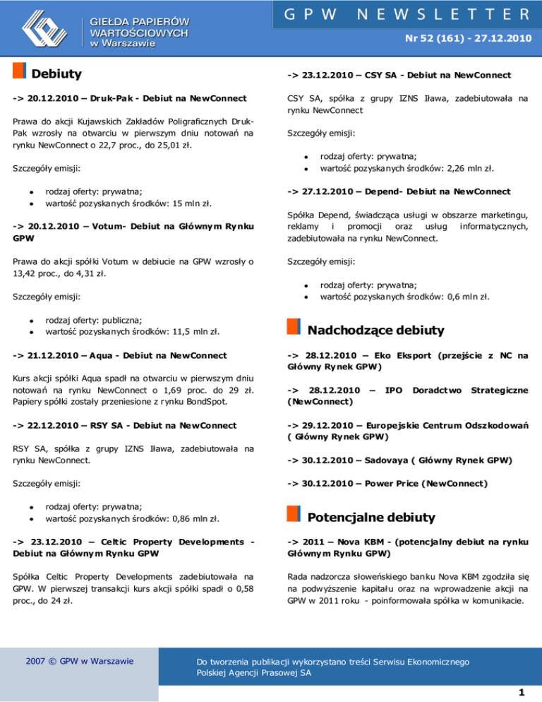 Nr 52 (161) - 27.12.2010 Debiuty -> 23.12.2010 – CSY SA - Debiut na NewConnect -> 20.12.2010 – Dr uk-Pak - Debiut na NewConnect Prawa do akcji Kujawskich Zakładów Poligraficznych Dr ukPak wzrosły na otwarciu w pierwszym dniu notowań na rynku NewConnect o 22,7 proc., do 25,01 zł. CSY SA, spółka z grupy IZNS Iława, zadebiutowała na rynku NewConnect Szczegóły emisji: rodzaj oferty: prywatna; wartość pozyskanych środków: 2,26 mln zł. Szczegóły emisji: rodzaj oferty: prywatna; wartość pozyskanych środków: 15 mln zł. -> 20.12.2010 – Votum- Debiut na Główny m Ry nku GPW Prawa do akcji spół ki Votum w debiucie na GPW wzrosły o 13,42 proc., do 4,31 zł. -> 27.12.2010 – Depend- Debiut na NewConnect Spółka Depend, świadcząca usługi w obszarze marketingu, reklamy i promocji oraz usług informatycznych, zadebiutowała na r ynku NewConnect. Szczegóły emisji: rodzaj oferty: prywatna; wartość pozyskanych środków: 0,6 mln zł. Szczegóły emisji: rodzaj oferty: publiczna; wartość pozyskanych środków: 11,5 mln zł. -> 21.12.2010 – Aqua - Debiut na NewConnect Kurs akcji spółki Aqua spadł na otwarciu w pierwszym dniu notowań na rynku NewConnect o 1,69 proc. do 29 zł. Papiery spółki zostały przeniesione z r ynku BondSpot. -> 22.12.2010 – RSY SA - Debiut na NewConnect Nadchodzące debiuty -> 28.12.2010 – Eko Eksport (przejście z NC na Główny Ry nek GPW) -> 28.12.2010 (NewConnect) – IPO Doradct wo Strategiczne -> 29.12.2010 – Europejskie Centrum Odszkodowań ( Główny Ry nek GPW) RSY SA, spółka z grupy IZNS Iława, zadebiutowała na rynku NewConnect. -> 30.12.2010 – Sadovaya ( Główny Rynek GPW) Szczegóły emisji: -> 30.12.2010 – Power Pr ice (NewConnect) rodzaj oferty: prywatna; wartość pozyskanych środków: 0,86 mln zł. Potencjalne debiuty -> 23.12.2010 – Celt ic Property Developments Debiut na Główny m Rynku GPW -> 2011 – Nova KBM - (potencjalny debiut na rynku Główny m Rynku GPW) Spółka Celtic Proper ty Developments zadebiutowała na GPW. W pierwszej transakcji kurs akcji spółki spadł o 0,58 proc., do 24 zł. Rada nadzorcza słoweńskiego banku Nova KBM zgodziła się na podw yższenie kapitał u oraz na wprowadzenie akcji na GPW w 2011 roku - poinformowała spół ka w komunikacie. 2007 © GPW w Warszawie Do tworzenia publikacji wykorzystano treści Serwisu Ekonomicznego Polskiej Agencji Prasowej SA 1 Nr 52 (161) - 27.12.2010 -> luty 2011 – Inpro (potencjalny debiut na rynku NewConnect) PERMEDIA 14,49 16,86 16,36 SEKO 11,20 13,00 16,07 Spółka deweloperska Inpro chce w publicznej ofercie 10 mln akcji pozyskać ponad 70 mln zł. Debiut na GPW spółka planuje na początku lutego - powiedział PAP Piotr Stefaniak, prezes Inpro. Wśród branż najw yższą tygodniową stopę zwrotu osiągnęły spółki za branży spożywczej (wzrost o 1,64 proc.) najniższą zaś z branży energetycznej (spadek o 1,16%). -> I kwartał 2011 – Codemedia - (potencjalny debiut na rynku NewConnect) Relacje z wydarzeń i komunikaty Codemedia, spółka z Grupy ADV świadcząca usługi w zakresie komunikacji w internecie planuje zadebiutować na NewConnect w pierwszym kwar tale 2011 roku poinformowała ADV w komunikacie prasow ym. Tydzień na rynku (20.12.10 – 23.12.10) -> 20.12.2010 – Nowy animator rynku na opcje na WIG20 20 gr udnia na opcjach na WIG20 rozpoczął działanie dr ugi animator rynku – Członek Giełdy Raiffeisen Centrobank AG. Warunki animowania są istotnie lepsze od warunków standardowych, co znacząco podnosi atrakcyj ność tego segmentu r ynku. -> 20.12.2010 - Nowe kontrakty terminowe na GPW -> Indeksy: WIG20 wartość na koniec tygodnia: 2.768,66 pkt. zmiana tygodniowa: 0,33 % GPW wprowadziła do obrotu giełdowego następujące serie kontraktów terminow ych na akcje spółki TAURON POLSKA ENERGIA S.A., z liczbą akcji przypadających na jeden kontrakt wynoszącą 1000 akcji: mWIG40 wartość na koniec tygodnia: 2.807,22 pkt. zmiana tygodniowa: -0,72 % -- seria FTPEH11, w ygasająca 18 marca 2011 r., - seria FTPEM11, w ygasająca 17 czerwca 2011 r., - seria FTPEU11, w ygasająca 16 września 2011 r. sWIG80 wartość na koniec tygodnia: 12.090,56 pkt. zmiana tygodniowa: 0,46% Jest to 10 kontrakt terminowy na akcje spółek dostępny na GPW. -> GPW wprowadza Indeks spółek dywidendowych NC Index wartość na koniec tygodnia: 62,59 pkt. zmiana tygodniowa: -2,07 % Od pierwszej sesji w styczniu 2011 r. warszawska Giełda Papierów Wartościow ych będzie publikować nowy indeks. WIGdiv obejmie do 30 spółek z indeksów WIG20, mWIG40, sWIG80 o najw yższych stopach dywidendy. ->Spółki – Główny Rynek GPW: Uczestnicy indeksu muszą także legitymować się regularną wypłatą dywidendy (co najmniej 3 razy na przestrzeni ostatnich 5 lat obrotowych). Największe wzrosty kursów: Akcje Kurs zamk. (17.12.10) Kurs zamk. (23.12.10) Zmiana (%) FON 0,42 0,52 23,81 MILKILAND 39,40 46,99 19,26 MAKARONYPL 7,27 8,51 17,06 2007 © GPW w Warszawie Lista uczestników indeksu będzie w yznaczana po ostatniej sesji sierpnia, zaś po ostatniej sesji lutego, maja i listopada będą aktualizowane wagi spółek w indeksie, przy czym waga największych spółek nie może przekraczać poziomu Do tworzenia publikacji wykorzystano treści Serwisu Ekonomicznego Polskiej Agencji Prasowej SA 2 Nr 52 (161) - 27.12.2010 10%. WIGdiv będzie indeksem dochodowym, a więc przy jego wyliczaniu pod uwagę będzie brana informacja o dywidendach i prawach poboru. harmonogramu sesji giełdowych, odpowiedniej zmianie ulegnie również czas publikacji poszczególnych indeksów giełdowych. Więcej informacji: Więcej informacji: http://www.gpw.pl/ wydarzenia/?ph_tresc_glowna _start=show&ph_tresc_glowna_cmn_id=44726 http://www.gpw.pl/ komunikaty/?ph_tresc_glowna _start=show&ph_tresc_glowna_cmn_id=44701 -> GPW podpisała umowę o dystrybucję danych giełdowych z grupą Trinity Giełda podpisała umowę o dystr ybucję danych giełdowych z gr