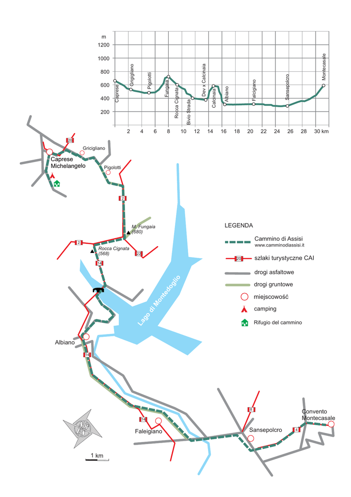 m Montecasale 1200 200 2 4 6 8 10 12 14 16 Sansepolcro Falcigiano Albiano Calcinaia Dev x Calcinaia Bivio Strada Rocca Cignata 400 Fungaia 600 Caprese 800 Pigolotti Grigigliano 1000 18 20 22 24 26 28 30 km 20 Gricigliano Caprese Michelangelo Pigolotti 2 LEGENDA M. Fungaia (680) Cammino di Assisi 2 Rocca Cignata (568) www.camminodiassisi.it 22 szlaki turystyczne CAI 20 14 gl io drogi asfaltowe te do drogi gruntowe M on miejscowość La go di camping Rifugio del cammino Albiano 14 8 Convento Montecasale 14 Faleigiano 1 km Sansepolcro 4