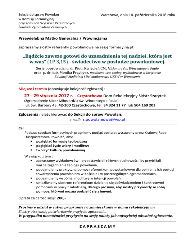 Sekcja do spraw Powołań w Komisji Formacyjnej Warszawa, dnia 14. października 2016 roku przy Konsulcie Wyższych Przełożonych Żeńskich Zgromadzeń Zakonnych Przewielebna Matko Generalna / Prowincjalna zapraszamy siostry referentki powołaniowe na sesję formacyjną pt. „Bądźcie zawsze gotowi do uzasadnienia tej nadziei, która jest w was” (1P 3,15) - świadectwo w posłudze powołaniowej. Sesję poprowadzi o. dr Piotr Kwiecień CM, Misjonarz św. Wincentego a Paulo oraz p. dr hab. Monika Przybysz, medioznawca, teolog, wykładowca w Instytucie Edukacji Medialnej i Dziennikarstwa UKSW w Warszawie Miejsce i termin (obowiązuje kolejność zgłoszeń) : 27 - 29 stycznia 2017 r. – Częstochowa Dom Rekolekcyjny Sióstr Szarytek (Zgromadzenie Sióstr Miłosierdzia św. Wincentego a Paulo) ul. Św. Barbary 43, 42-200 Częstochowa, tel. 34 324 11 77 lub 504 169 203 Zgłoszenia należy kierować do Sekcji do spraw Powołań: e-mail: [email protected] Cel: Podczas spotkań formacyjnych pragniemy podjąć postulat wysuwany przez Krajową Radę Duszpasterstwa Powołań, aby: pogłębiać formację teologiczną pogłębiać życie wiary i modlitwy tworzyć kulturę powołaniową W związku z tym : zapraszamy wykładowców - przedstawicieli różnych duchowości, by przybliżali ważne zagadnienia teologii powołania, podejmujemy praktyczną pomoc referentkom powołaniowym dla pełnienia ich posługi towarzyszenia powołaniom w Kościele i w poszczególnych Zgromadzeniach, podejmujemy wspólną modlitwę w intencji powołań, umożliwiamy siostrom referentkom dzielenie się doświadczeniem i konkretnymi pomocami w pracy z młodzieżą, dlatego prosimy, aby siostry przywiozły ze sobą pomoce, którymi można podzielić się z innymi. Opłata za całość sesji: 200,Prosimy o udział w całym programie i o zamieszkanie w domu rekolekcyjnym. Siostry otrzymają potwierdzenie przyjęcia zgłoszenia. W przypadku niemożności przybycia na sesję należy jak najszybciej odwołać zgłoszenie. ZAPRASZAMY