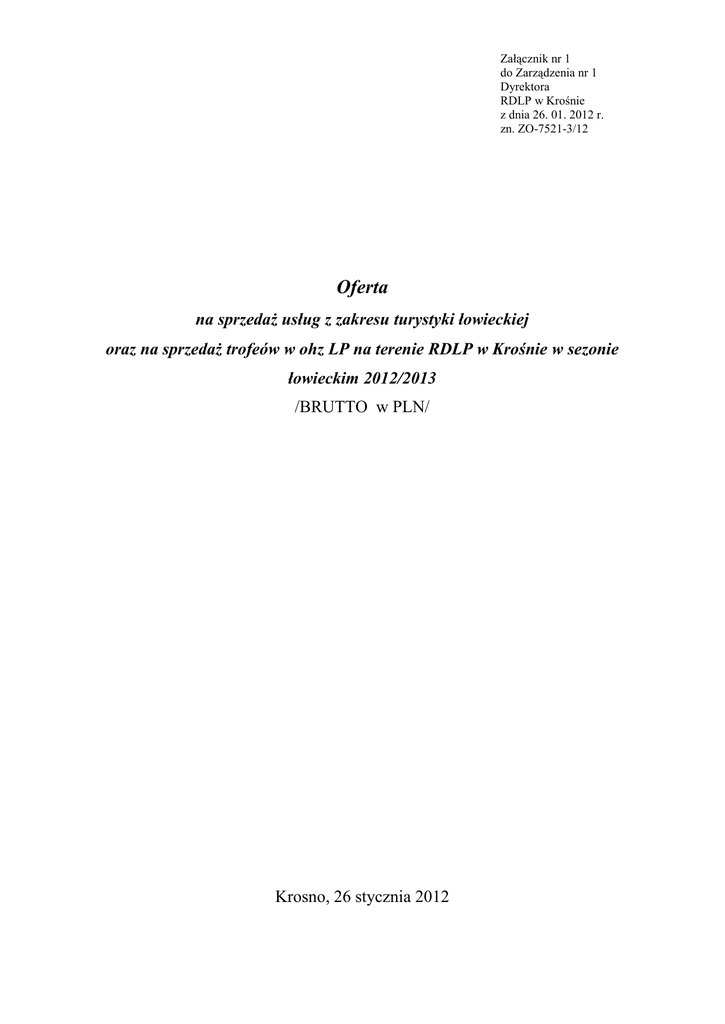 Załącznik nr 1 do Zarządzenia nr 1 Dyrektora RDLP w Krośnie z dnia 26. 01. 2012 r. zn. ZO-7521-3/12 Oferta na sprzedaż usług z zakresu turystyki łowieckiej oraz na sprzedaż trofeów w ohz LP na terenie RDLP w Krośnie w sezonie łowieckim 2012/2013 /BRUTTO w PLN/ Krosno, 26 stycznia 2012 I. Organizacja polowania a) polowanie indywidualne1 b) polowanie zbiorowe - 140,00 zł/dzień - 500,00 zł/dzień/myśliwego Opłata za trofeum2 Jelenie. Postrzelenie postrzelenie3 jelenia byka postrzelenie jelenia łani lub cielaka - 600,00 zł 250,00 zł - 290,00 zł 430,00 zł 650,00 zł 1010,00 zł 1440,00 zł 1660,00 zł 1870,00 zł 2160,00 zł 2880,00 zł 4320,00 zł 5040,00 zł + 14,00 zł za każde 0,01 kg powyżej 8,00 kg Oplata za trofeum Byki. trofeum o masie do 2kg trofeum o masie od 2,01 – 2,49 kg trofeum o masie od 2,50 – 2,99 kg trofeum o masie od 3,00 – 3,49 kg trofeum o masie od 3,50 – 3,99 kg trofeum o masie od 4,00 – 4,49 kg trofeum o masie od 4,50 – 4,99 kg trofeum o masie od 5,00 – 5,99 kg trofeum o masie od 6,00 – 6,99 kg trofeum o masie od 7,00 – 7,99 kg trofeum o masie 8,00 kg i powyżej Łanie i cielęta trofeum grandle, rapcie 100,00 zł - 1 Zarządzający ohz LP określi, co oznacza dzień organizacji polowania. Organizacja polowania indywidualnego na drapieżniki (lis, jenot, kuna, borsuk, tchórz) wynosi 40 zł/dzień. 2 Opłata za trofeum, oprócz wartości trofeum, zawiera również koszty przygotowania trofeum do preparowania, koszty preparacji i przechowania oraz koszty wydania certyfikatu o miejscu pozyskania trofeum, jego wadze i wstępnej wycenie według CIC. Certyfikaty wydawane są obligatoryjnie myśliwym, którzy pozyskali trofeum wycenione w trakcie wyceny wstępnej na medal brązowy, srebrny lub złoty. W pozostałych przypadkach certyfikat wydawany jest na prośbę myśliwego. 3 Uznanie za postrzałka następuje po znalezieniu farby lub ścinki. Przy postrzeleniu stosuje się podatek VAT w wysokości jak przy organizacji polowania. 2 Sarny Postrzelenie postrzelenie4 sarny – kozła postrzelenie sarny kozy lub koźlęcia - 200,00 zł 36,00 zł Oplata za trofeum Kozły - masa trofeum netto. trofeum o masie do 149g ( w tym rogacz guzikarz) trofeum o masie od 150 – 199 g trofeum o masie od 200 – 299 g trofeum o masie od 300 – 349 g trofeum o masie od 350 – 399 g trofeum o masie od 400 – 499 g - trofeum o masie 500 g i powyżej - trofeum kozła perukarza o wadze powyżej 550 g - 120,00 zł 180,00 zł 290,00 zł 420,00 zł 720,00 zł 730,00 zł + 5,00 zł za każdy gram powyżej 400 1230,00 zł + 12,0 zł za każdy gram powyżej 500 2400,00 zł Kozy, koźlęta racice - 36,00 zł - 120,00 zł Dziki Postrzelenie postrzelenie5 dzika Oplata za trofeum Trofeum (szable) o długości do 13,99 cm a) osobników o wadze do 29,99 kg b) osobników o wadze od 30,00 – 49,99 kg c) osobników o wadze od 50,00 – 79,99 kg d) osobników o wadze powyżej 80 kg trofeum (szable) o długości od 14,00 –15,99 cm trofeum (szable) o długości od 16,00 – 19,99 cm trofeum (szable) o długości powyżej 20 cm 4 5 Jak w przypisie 2. Jak w przypisie 2. 37,00 zł 53,00 zł 210,00 zł 320,00 zł 600,00 zł 610,00 zł +5,5zł za każdy mm powyżej 16,00 cm. 850,00 zł + 12,00 zł za każdy mm powyżej 20,00 cm Zwierzyna drobna Oplata za trofeum trofeum z lisa (czaszka) trofeum z jenota (czaszka) trofeum z borsuka (czaszka) trofeum z kuny (czaszka) trofeum z tchórza (czaszka) trofeum z piżmaka (skóra) trofeum z zająca (skóra) - trofeum z dzikiej kaczki (pióra) trofeum z bażanta (pióra) trofeum z kuropatwy (pióra) trofeum ze słonki (pióra) trofeum z gołębia grzywacza (pióra) trofeum z łyski (pióra) trofeum z jarząbka (pióra) - bez opłaty bez opłaty bez opłaty bez opłaty bez opłaty 5,00 zł 20,00 zł 10,00 zł 10,00 zł 20,00 zł 10,00 zł 5,00 zł 5,00 zł 50,00 zł IV. Świadczenia dodatkowe Ściągnięcie skóry na medalion Jeleń-byk - 160 zł Sarna–rogacz - 100 zł Dzik - 130 zł Ściągnięcie całej skóry Jeleń - 200 zł Sarna - 100zł Dzik - 130 zł Zakup skóry surowej Cena jednego kg skóry wg aktualnej ceny 1 kg dziczyzny danego gatunku. Fotografowanie lub filmowanie zwierzyny6 140,00 zł/dzień7 od osoby Zatwierdzam: Dyrektor RDLP w Krośnie mgr inż. Edward Balwierczak 6 7 W cenę wliczony jest podprowadzanie oraz przygotowanie i udostępnienie łowiska Zarządzający ohz LP określi, co oznacza dzień filmowania lub fotografowania 2