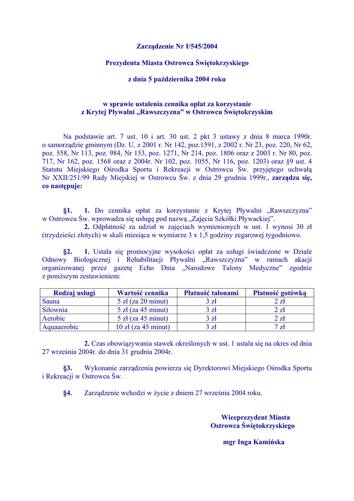 Zarządzenie Nr I/545/2004 Prezydenta Miasta Ostrowca Świętokrzyskiego z dnia 5 października 2004 roku w sprawie ustalenia cennika opłat za korzystanie z Krytej Pływalni „Rawszczyzna” w Ostrowcu Świętokrzyskim Na podstawie art. 7 ust. 10 i art. 30 ust. 2 pkt 3 ustawy z dnia 8 marca 1990r. o samorządzie gminnym (Dz. U. z 2001 r. Nr 142, poz.1591, z 2002 r. Nr 23, poz. 220, Nr 62, poz. 558, Nr 113, poz. 984, Nr 153, poz. 1271, Nr 214, poz. 1806 oraz z 2003 r. Nr 80, poz. 717, Nr 162, poz. 1568 oraz z 2004r. Nr 102, poz. 1055, Nr 116, poz. 1203) oraz §9 ust. 4 Statutu Miejskiego Ośrodka Sportu i Rekreacji w Ostrowcu Św. przyjętego uchwałą Nr XXII/251/99 Rady Miejskiej w Ostrowcu Św. z dnia 29 grudnia 1999r., zarządza się, co następuje: §1. 1. Do cennika opłat za korzystanie z Krytej Pływalni „Rawszczyzna” w Ostrowcu Św. wprowadza się usługę pod nazwą „Zajęcia Szkółki Pływackiej”. 2. Odpłatność za udział w zajęciach wymienionych w ust. 1 wynosi 30 zł (trzydzieści złotych) w skali miesiąca w wymiarze 3 x 1,5 godziny zegarowej tygodniowo. §2. 1. Ustala się promocyjne wysokości opłat za usługi świadczone w Dziale Odnowy Biologicznej i Rehabilitacji Pływalni „Rawszczyzna” w ramach akacji organizowanej przez gazetę Echo Dnia „Narodowe Talony Medyczne” zgodnie z poniższym zestawieniem: Rodzaj usługi Sauna Siłownia Aerobic Aquaaerobic Wartość cennika 5 zł (za 20 minut) 5 zł (za 45 minut) 5 zł (za 45 minut) 10 zł (za 45 minut) Płatność talonami 3 zł 3 zł 3 zł 3 zł Płatność gotówką 2 zł 2 zł 2 zł 7 zł 2. Czas obowiązywania stawek określonych w ust. 1 ustala się na okres od dnia 27 września 2004r. do dnia 31 grudnia 2004r. §3. Wykonanie zarządzenia powierza się Dyrektorowi Miejskiego Ośrodka Sportu i Rekreacji w Ostrowcu Św. §4. Zarządzenie wchodzi w życie z dniem 27 września 2004 roku. Wiceprezydent Miasta Ostrowca Świętokrzyskiego mgr Inga Kamińska