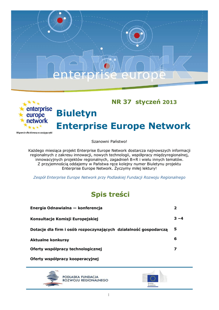 NR 37 stycze 2013 Biuletyn Enterprise Europe Network Szanowni Pa stwo! Ka dego miesi ca projekt Enterprise Europe Network dostarcza najnowszych informacji regionalnych z zakresu innowacji, nowych technologii, wspó pracy mi dzyregionalnej, innowacyjnych projektów regionalnych, zagadnie B+R i wielu innych tematów. Z przyjemno ci oddajemy w Pa stwa r ce kolejny numer Biuletynu projektu Enterprise Europe Network. yczymy mi ej lektury! Zespó Enterprise Europe Network przy Podlaskiej Fundacji Rozwoju Regionalnego Spis tre ci Energia Odnawialna — konferencja 2 Konsultacje Komisji Europejskiej 3 –4 Dotacje dla firm i osób rozpoczynaj cych dzia alno gospodarcz 5 Aktualne konkursy 6 Oferty wspó pracy technologicznej 7 Oferty wspó pracy kooperacyjnej 1 Energia Odnawialna szans rozwoju województwa podlaskiego W imieniu Podlaskiej Fundacji Rozwoju Regionalnego, Urz du Marsza kowskiego Województwa Podlaskiego, Politechniki Bia ostockiej oraz niemieckiej Fundacji EuroNatur serdecznie zapraszamy do udziau w konferencji „Energia odnawialna szans rozwoju województwa podlaskiego” która odb dzie si 30-31 stycznia 2013 r. w Auli Wydzia u Elektrycznego Politechniki Bia ostockiej przy ul. Wiejskiej 45D w Bia ymstoku, w godzinach 9:00-15:30. Konferencja „Energia odnawialna szans rozwoju województwa podlaskiego” to dwa dni merytorycznych prelekcji i dyskusji z polskimi i niemieckimi specjalistami i ekspertami z dziedziny energii odnawialnej na temat wspó pracy w zakresie wymiany do wiadcze niemieckiej i polskiej energetyki ze róde odnawialnych, wskazanie sprawdzonych rozwi za z rynku niemieckiego oraz przedstawienie aktywnych postaw i dzia ukierunkowanych na rozwój energii odnawialnej oraz korzy ci z tego p y- cych dla regionu. Przedsi wzi cie stworzy impuls do rozwoju potencja u energii odnawialnej na bazie wymiany do wiadcze i wiedzy mi dzy Polsk i Niemcami. Udzia w konferencji jest bezp atny. Warunkiem uczestnictwa w konferencji jest przes anie karty zg oszenia lub rejestracja online. Dalszych informacji udziela Agnieszka Pa usewicz-Sarosiek, tel. 85 740 86 88, e-mail: [email protected]. Zapraszamy tak e na stron konferencji www.konferencjaoze.eu 2 Konsultacje Komisji Europejskiej - warto zabra g os i mie wp yw na przysz e decyzje. Konsultacje spo eczne s form dialogu spo ecznego prowadzon pomi dzy administracj publiczn i partnerami spo ecznymi. Konsultacje spo eczne to tak e mo liwo wyra enia swojej opinii i wp yw na polityk EU. Poni ej znajduje si wykaz aktualnie og oszonych konsultacji spo ecznych wraz z okre leniem obszaru polityki i linkiem do szczegó owego opisu ka dego tematu konsultacji. Zach camy do zapoznania z tematyk konsultacji i wzi cia udzia u w tych, które podejmuj istotne problemy. 1. Konsultacje w sprawie przegl du europejskiej polityki w zakresie rolnictwa ekologicznego Obszar polityki: Rolnictwo i rozwój obszarów wiejskich Data zako czenia: 15.01.2013 – 10.04.2013 Wi cej informacji 2. Konsultacje w sprawie transgranicznego przenoszenia siedzib statutowych spó ek Obszar polityki: Rynek wewn trzny Data zako czenia: 14.01.2013 – 16.04.2013 Wi cej informacji 3. Konsultacje w sprawie pomocy pa stwa w sektorze rolnym i le nym Obszar polityki: Rolnictwo i rozwój obszarów wiejskich Data zako czenia: 20.12.2012 – 20.03.2013 Wi cej informacji 4. Niekonwencjonalne paliwa kopalne (np. gaz upkowy) w Europie Obszar polityki: rodowisko Data zako czenia: 20.12.2012 – 23.03.2013 Wi cej informacji 3 5. Publiczne konsultacje w sprawie ochrony know-how w biznesie i badaniach naukowych Obszar polityki: Rynek wewn trzny Data zako czenia: 11.12.2012 – 08.03.2013 Wi cej informacji 6. Egzekwowanie praw w asno ci intelektualnej: konsultacje publiczne dotycz ce efektywnoci post powania cywilnego oraz dost pno ci rodków cywilnoprawnych Obszar polityki: Rynek wewn trzny Data zako czenia: 11.12.2012 – 08.03.2013 Wi cej informacji 7. Odpowiedni poziom produkcji energii elektrycznej, mechanizmy zdolno ci przesy owych i rynek wewn trzny energii elektrycznej Obszar polityki: Energia Data zako czenia: 15.11.2012 – 07.02.2013 Wi cej informacji 8. Zintegrowany rynek us ug dostawy paczek jako impuls rozwoju handlu elektronicznego w Unii Europejskiej Obszar polityki: Rynek wewn trzny Data zako czenia: 29.11.2012 – 22.02.2013 Wi cej informacji 9. Opcje dla przegl du unijnej strategii tematycznej dotycz cej zanieczyszczenia powietrza i strategii z ni Obszar polityki: powi zanych rodowisko Data zako czenia: 10.12.2012 – 04.03.2013 Wi cej informacji http://ec.europa.eu/yourvoice/consultations KONTAKT: Podlaska Fundacja Rozwoju Regionalnego ul. Starobojarska 15, 15-073 Bia ystok tel. 085 740 86 83, fax. 085 740 86 85 e-mail: [email protected] 4 Dotacje dla firm i osób planuj cych rozpocz cie prowadzenia dzia alno ci gospodarczej Stowarzyszenie LOKALNA GRUPA DZIA ANIA „Biebrza ski Dar Natury” dzia aj ce na terenie województwa podlaskiego, w ramach dzia ania „Wdra anie Lokalnych Strategii Rozwoju” og asza nabór wniosków o przyznanie pomocy na operacj z zakresu: „Ma e projekty”, „Ró nicowanie w kierunku dzia alno ci nierolniczej”, „Odnowa i rozwój wsi” oraz „Tworzenie i rozwój mikroprzedsi biorstw”. Wnioski o dofinansowanie mog sk ada osoby fizyczne lub prawne, zameldowane lub prowadz ce dzia alno na obszarze LGD tj. nast puj cych sze ciu gmin: Grajewo, Szczuczyn, Rajgród, Jedwabne, Radzi ów i W sosz. Wysoko dost pnych rodków w ramach nast puj cych dzia wynosi: „Ró nicowanie w kierunku dzia alno ci nierolniczej” – limit dost pnych rodków – 353 100 z , „Tworzenie i rozwój mikroprzedsi biorstw” – limit dost pnych rodków – 300 000 z , „Odnowa i rozwój wsi” – limit dost pnych rodków – 353 100 z , „Ma e projekty” – limit dost pnych rodków – 452 107,38 z . Wnioski nale y sk ada w terminie od 31 grudnia 2012 r. do 28 stycznia 2013 r. Szczegó owe informacje dotycz ce naboru, w tym kryteria wyboru operacji i wykaz niezb