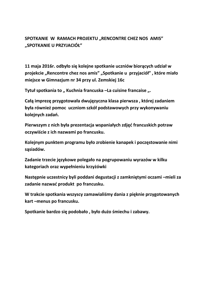SPOTKANIE W RAMACH PROJEKTU „RENCONTRE CHEZ NOS AMIS” „SPOTKANIE U PRZYJACIÓŁ” 11 maja 2016r. odbyło się kolejne spotkanie uczniów biorących udział w projekcie „Rencontre chez nos amis” „Spotkanie u przyjaciół” , które miało miejsce w Gimnazjum nr 34 przy ul. Zemskiej 16c Tytuł spotkania to „ Kuchnia francuska –La cuisine francaise „. Całą imprezę przygotowała dwujęzyczna klasa pierwsza , której zadaniem była również pomoc uczniom szkół podstawowych przy wykonywaniu kolejnych zadań. Pierwszym z nich była prezentacja wspaniałych zdjęć francuskich potraw oczywiście z ich nazwami po francusku. Kolejnym punktem programu było zrobienie kanapek i poczęstowanie nimi sąsiadów. Zadanie trzecie językowe polegało na pogrupowaniu wyrazów w kilku kategoriach oraz wypełnieniu krzyżówki Następnie uczestnicy byli poddani degustacji z zamkniętymi oczami –mieli za zadanie nazwać produkt po francusku. W trakcie spotkania wszyscy zamawialiśmy dania z pięknie przygotowanych kart –menus po francusku. Spotkanie bardzo się podobało , było dużo śmiechu i zabawy.