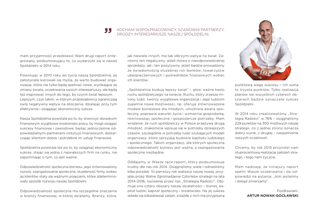 Kochani Współpracownicy, szanowni Partnerzy, drodzy Interesariusze naszej Spółdzielni, mam przyjemność przedstawić Wam drugi raport zintegrowany, podsumowujący to, co wydarzyło się w naszej Spółdzielni w 2014 roku. Powołując w 2010 roku do życia naszą Spółdzielnię, jej założyciele kierowali się myślą, że warto budować organizacje, które nie tylko będą spełniać nowe, wynikające ze zmiany świata, oczekiwania swoich interesariuszy, ale będą też inspirować innych do tego, by czynili świat lepszym. Lepszym, czyli takim, w którym przedsiębiorcy ograniczają swój negatywny wpływ na otoczenie, działając przy tym efektywnie i osiągając ekonomiczny sukces. Nasza Spółdzielnia powstała po to, by stworzyć doradcom finansowym wyjątkowe środowisko pracy, by mogli osiągać sukcesy finansowe i zawodowe, będąc jednocześnie odpowiedzialnymi partnerami instytucji finansowych, dostarczając klientom dobre i potrzebne im usługi finansowe. Spółdzielnia powstała też po to, by osiągnąć ekonomiczny sukces, stając się jedną z największych firm na rynku, nie zapominając o tym, co jest ważne. Odpowiedzialność społeczna biznesu, jego zrównoważony rozwój, zaangażowanie społeczne, służebność firmy wobec jej klientów stały się ważnymi pojęciami, które zdeterminowały sposób rozwoju naszej Spółdzielni. Odpowiedzialność społeczna ma szczególne znaczenie w branży finansowej, w której działamy. Branży, która, jak niewiele innych, ma tak olbrzymi wpływ na świat. Zarówno ten negatywny, jeżeli mowa o nieodpowiedzialnej sprzedaży, jak i ten pozytywny, jeżeli będzie prowadzony ze świadomością służebnej roli banków, towarzystw ubezpieczeniowych i pośredników finansowych wobec ich klientów. „Spółdzielnie budują lepszy świat” – głosi ważne hasło ruchu spółdzielczego na świecie. Ruchu, który zrzesza miliony ludzi, tworzy wyjątkowe organizacje i daje ludziom zupełnie nowe możliwości, np. oferuje zrównoważone modele biznesowe dla młodych, umożliwia awans społeczny, poprawia warunki życia i wzmacnia gospodarkę, równoważąc społeczne i gospodarcze potrzeby. Mam wrażenie, że ruch spółdzielczy w Polsce przeżywa drugą młodość, znakomicie wpisuje się w potrzeby dzisiejszych czasów, szczególnie w potrzeby ludzi szukających modeli organizacji, które sprzyjają budowie kapitału ludzkiego i społecznego. Takich organizacji, dla których społeczna odpowiedzialność biznesu jest ważna, a zaangażowanie społeczne niezbędne. Oddajemy w Wasze ręce raport, który podsumowuje trudny dla nas rok 2014. Osiągnęliśmy wiele i odnieśliśmy kilka porażek. To pierwszy rok realizacji naszej nowej, przyjętej przez Walne Zgromadzenie Członków strategii na lata 2014-2016, nazwanej przez nas „Strategią Radości”. Objmuje ona cztery obszary naszej działalności – biznes, kapitał ludzki, kapitał społeczny i środowisko. Na jej sukces składa się kilkadziesiąt zadań, a każde z nich ma przypisaną punktową wagę sukcesu – ich suma to trzysta punktów. Tylko realizacja planów we wszystkich czterech obszarach bę dzie oznaczała sukces Spółdzielni. W 2014 roku zrealizowaliśmy „Strategię Radości” w 76% – osiągnęliśmy 229 punktów na 300 możliwych naszej strategii, co z jednej strony oznacza dobry wynik, z drugiej – niespełnienie naszych oczekiwań. Chcemy, by rok 2015 przyniósł nam stuprocentową realizację założeń strategii, i tego nam życzcie. Mam nadzieję, że niniejszy raport spełni Wasze oczekiwania i da odpowiedzi na pytania: „kim jesteśmy i dokąd zmierzamy”. Pozdrawiam, Artur Nowak-Gocławski