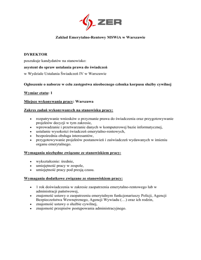 Zakład Emerytalno-Rentowy MSWiA w Warszawie DYREKTOR poszukuje kandydatów na stanowisko: asystent do spraw ustalania prawa do świadczeń w Wydziale Ustalania Świadczeń IV w Warszawie Ogłoszenie o naborze w celu zastępstwa nieobecnego członka korpusu służby cywilnej Wymiar etatu: 1 Miejsce wykonywania pracy: Warszawa Zakres zadań wykonywanych na stanowisku pracy: rozpatrywanie wniosków o przyznanie prawa do świadczenia oraz przygotowywanie projektów decyzji w tym zakresie, wprowadzanie i przetwarzanie danych w komputerowej bazie informatycznej, ustalanie wysokości świadczeń emerytalno-rentowych, bezpośrednia obsługa interesantów, przygotowywanie projektów postanowień i zaświadczeń wydawanych w imieniu organu emerytalnego. Wymagania niezbędne związane ze stanowiskiem pracy: wykształcenie: średnie, umiejętność pracy w zespole, umiejętność pracy pod presją czasu. Wymagania dodatkowe związane ze stanowiskiem pracy: 1 rok doświadczenia w zakresie zaopatrzenia emerytalno-rentowego lub w administracji państwowej, znajomość ustawy o zaopatrzeniu emerytalnym funkcjonariuszy Policji, Agencji Bezpieczeństwa Wewnętrznego, Agencji Wywiadu (…) oraz ich rodzin, znajomość ustawy o służbie cywilnej, znajomość przepisów postępowania administracyjnego. Wymagane dokumenty i oświadczenia: życiorys i list motywacyjny oświadczenie kandydata o wyrażeniu zgody na przetwarzanie danych osobowych do celów rekrutacji oświadczenie kandydata o korzystaniu z pełni praw publicznych oświadczenie kandydata o nieskazaniu prawomocnym wyrokiem za umyślne przestępstwo lub umyślne przestępstwo skarbowe kopie dokumentów potwierdzających wykształcenie kopia dokumentu potwierdzającego posiadanie polskiego obywatelstwa lub oświadczenie o posiadaniu obywatelstwa polskiego kopie świadectw pracy kopia dowodu osobistego Termin składania dokumentów: 06-08-2010 Miejsce składania dokumentów: Zakład Emerytalno-Rentowy MSWiA Pawińskiego 17/21 02-106 Warszawa Inne informacje: Oferty niespełniające wymagań formalnych oraz otrzymane po terminie (decyduje data wysłania) nie będą rozpatrywane. Kandydaci zakwalifikowani do kolejnego etapu zostaną powiadomieni telefonicznie o terminie rozmów w ciągu 3 tygodni od dnia zakończenia nadsyłania ofert. Oferty odrzucone zostaną komisyjne zniszczone. Zastrzegamy sobie prawo do skontaktowania się z wybranymi osobami. Zachęcamy osoby niepełnosprawne do udziału w rekrutacji. Dodatkowe informacje: 022-60-28-470.