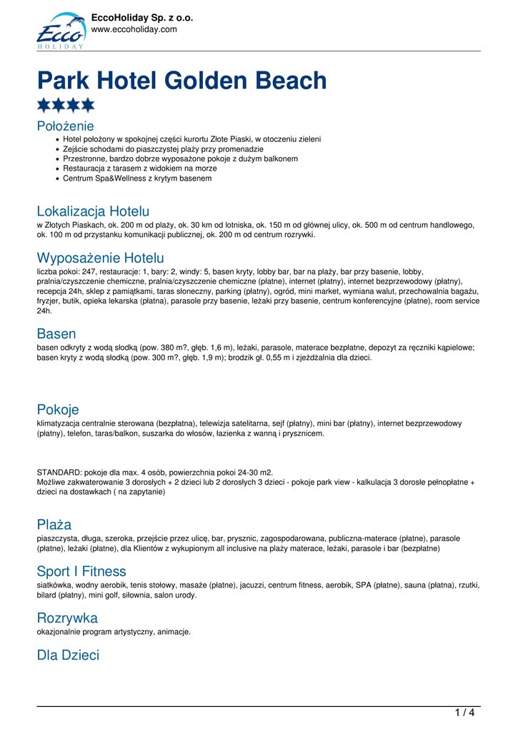 EccoHoliday Sp. z o.o. www.eccoholiday.com Park Hotel Golden Beach Położenie Hotel położony w spokojnej części kurortu Złote Piaski, w otoczeniu zieleni Zejście schodami do piaszczystej plaży przy promenadzie Przestronne, bardzo dobrze wyposażone pokoje z dużym balkonem Restauracja z tarasem z widokiem na morze Centrum Spa&Wellness z krytym basenem Lokalizacja Hotelu w Złotych Piaskach, ok. 200 m od plaży, ok. 30 km od lotniska, ok. 150 m od głównej ulicy, ok. 500 m od centrum handlowego, ok. 100 m od przystanku komunikacji publicznej, ok. 200 m od centrum rozrywki. Wyposażenie Hotelu liczba pokoi: 247, restauracje: 1, bary: 2, windy: 5, basen kryty, lobby bar, bar na plaży, bar przy basenie, lobby, pralnia/czyszczenie chemiczne, pralnia/czyszczenie chemiczne (płatne), internet (płatny), internet bezprzewodowy (płatny), recepcja 24h, sklep z pamiątkami, taras słoneczny, parking (płatny), ogród, mini market, wymiana walut, przechowalnia bagażu, fryzjer, butik, opieka lekarska (płatna), parasole przy basenie, leżaki przy basenie, centrum konferencyjne (płatne), room service 24h. Basen basen odkryty z wodą słodką (pow. 380 m?, głęb. 1,6 m), leżaki, parasole, materace bezpłatne, depozyt za ręczniki kąpielowe; basen kryty z wodą słodką (pow. 300 m?, głęb. 1,9 m); brodzik gł. 0,55 m i zjeżdżalnia dla dzieci. Pokoje klimatyzacja centralnie sterowana (bezpłatna), telewizja satelitarna, sejf (płatny), mini bar (płatny), internet bezprzewodowy (płatny), telefon, taras/balkon, suszarka do włosów, łazienka z wanną i prysznicem. STANDARD: pokoje dla max. 4 osób, powierzchnia pokoi 24-30 m2. Możliwe zakwaterowanie 3 dorosłych + 2 dzieci lub 2 dorosłych 3 dzieci - pokoje park view - kalkulacja 3 dorosłe pełnopłatne + dzieci na dostawkach ( na zapytanie) Plaża piaszczysta, długa, szeroka, przejście przez ulicę, bar, prysznic, zagospodarowana, publiczna-materace (płatne), parasole (płatne), leżaki (płatne), dla Klientów z wykupionym all inclusive na plaży materace, leżaki, parasole i bar (bezpłatne) Sport I Fitness siatkówka, wodny aerobik, tenis stołowy, masaże (płatne), jacuzzi, centrum fitness, aerobik, SPA (płatne), sauna (płatna), rzutki, bilard (płatny), mini golf, siłownia, salon urody. Rozrywka okazjonalnie program artystyczny, animacje. Dla Dzieci 1/4 EccoHoliday Sp. z o.o. www.eccoholiday.com opiekunka (płatna) , mini klub, plac zabaw, łóżeczko dziecięce (bezpłatne) , krzesełka w restauracji, animacje. 2/4 EccoHoliday Sp. z o.o. www.eccoholiday.com Wyżywienie pakiet All Inclusive. All Inclusive Zawiera śniadanie (7.30 - 10.00), lunch (12.00 - 14.00) i obiadokolację (18.00 - 21.00) w formie bufetu w restauracji głównej; napoje bezalkoholowe i lokalne alkohole (wódka, gin, whisky, wina, piwo, rakija, rum) 10.00 - 23.00 w lobby barze i barze przy basenie; przekąski, lody i owoce w barze przy basenie (10.00 - 11.00 oraz 15.00 - 17.00); all inclusive w hotelu bransoletki białe Płatne: soki ze świeżych owoców, markowe wina i importowane alkohole, barbecue a'la carte. Istnieje możliwość rezerwacji hotelu z opcją All Inclusive na plaży (dopłata do Ultra All Inclusive) zawierającego dodatkowo bar service na plaży: napoje bezalkoholowe i piwo 10.00 - 17.00; ciepłe przekąski jak frytki, mięso, zimne przekąski, sałatki, owoce , ciastka 10.00 - 11.00 oraz 15.00 - 17.00; 2 leżaki i parasol na jeden pokój. DOPŁATA ZA ALL INCLUSIVE NA PLAŻY- żółta bransoletka 219 zł/os./tydzień, 438 zł/os./2 tygodnie Pierwsze dziecko 2-14 lat 100% zniżki Drugie dziecko 2-14 lat 100% zniżki materace na plaży płatne ok 6 leva/sztuka/dzień Informacje Dodatkowe W okresie lipiec do 26.08 prowadzone są polskie animacje w hotelu. Uwaga: zejście na plażę po schodach. Depozyt za ręczniki plażowe i sprzęt do mini golfa. Hotel nie akceptuje zwierząt. Wypożyczalnia samochodów Możliwość wypożyczenia w recepcji żelazka. Przechowalnia bagażu Automaty do gier (płatne) ANIMACJE Poranne i popołudniowe animacje z animatorka Ecco Holiday bezpłatne Raz w tygodniu jest dzień tematyczny. W tym dniu wieczorne show jest odpłatne w ramach opłaty ok 20 leva jest malowanie twarzy, koszulka, występ i zabawa na scenie. Osoby , które nie dokonały opłaty mogą wziąć udział w wieczorze, ale nie obejmuje ich malowanie, pamiątki, zabawa na scenie. Raz w tygodniu jest dzień kreatywny, wtedy można dokonać zakupu maskotki i flamastry do malowania maskotki cena ok 10 leva. Z każdego mini disco można jako pamiątkę nabyć płytę z muzyką za ok 10 leva. Wszelkie szczegóły animacji dostępna na miejscu u animatorki Ecco Holiday. Oferta: Wylot 01.01.1970 Powrót 01.01.1970 Zakwaterowanie -- Dni dni Cena os. dorosła 3/4 EccoHoliday Sp. z o.o. www.eccoholiday.com godz. godz. () 4/4 Powered by TCPDF (www.tcpdf.org)
