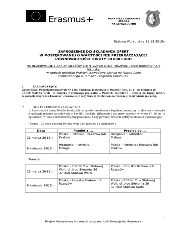 PRAKTYKI ZAWODOWE SZANSĄ NA LEPSZE JUTRO Stalowa Wola , dnia 11.12.2015r. ZAPROSZENIE DO SKŁADANIA OFERT W POSTĘPOWANIU O WARTOŚCI NIE PRZEKRACZAJĄCEJ RÓWNOWARTOŚCI KWOTY 30 000 EURO NA REZERWACJĘ I ZAKUP BILETÓW LOTNICZYCH DO/Z HISZPANII oraz transfery na/z lotniska w ramach projektu Praktyki zawodowe szansą na lepsze jutro realizowanego w ramach Programu Erasmus+ 1. ZAMAWIAJĄCY: Zespół Szkół Ponadgimnazjalnych Nr 2 im. Tadeusza Kościuszki w Stalowej Woli, ul. 1 –go Sierpnia 26 37-450 Stalowa Wola w związku z realizacją projektu: ,, Praktyki zawodowe – szansą na lepsze jutro", w ramach programu Erasmus+, zwraca się z zapytaniem ofertowym na realizację zamówienia jak niżej. 2. OPIS PRZEDMIOTU ZAMÓWIENIA: 1. Rezerwacja i zakup biletów lotniczych na przelot samolotem z bagażem (podręczny + główny) w związku z realizacją praktyk zawodowych w Sevilli i Ubedzie (Hiszpania ) dla grupy uczniów w wieku 17 -20 lat i 2 opiekunów w klasie ekonomicznej bez przesiadek. Ceny powinny zawierać opłaty lotniskowe i transakcyjne. I Grupa - 20 osób powyżej 16 roku życia ( 18 uczniów i 2 opiekunów ) Data 26 marca 2015 r. Przelot z … Polska – lotnisko: Rzeszów lub Kraków Przelot do … Hiszpania – lotnisko: Malaga 9 kwietnia 2015 r. Hiszpania – lotnisko: Malaga Polska – lotnisko: Rzeszów lub Kraków Polska –ZSP Nr 2 w Stalowej Woli, ul 1-go Sierpnia 26 37-450 Stalowa Wola Polska - lotnisko Kraków lub Rzeszów Polska - lotnisko Kraków lub Rzeszów Polska –ZSP Nr 2 w Stalowej Woli, ul 1-go Sierpnia 26 37-450 Stalowa Wola Transfer 26 marca 2015 r. 9 kwietnia 2015 r. 1 Projekt finansowany w ramach programu Unii Europejskiej Erasmus+ PRAKTYKI ZAWODOWE SZANSĄ NA LEPSZE JUTRO II Grupa – 18 osób powyżej 16 roku życia ( 16 uczniów i 2 opiekunów ) Data 28 maj 2016 Przejazd z … Polska – lotnisko: Rzeszów lub Kraków Przejazd do … Hiszpania – lotnisko: Malaga 18 czerwca 2015 Hiszpania – lotnisko: Malaga Polska – lotnisko: Rzeszów lub Kraków Polska –ZSP Nr 2 w Stalowej Woli, ul 1-go Sierpnia 26 37-450 Stalowa Wola Polska - lotnisko Kraków lub Rzeszów Polska - lotnisko Kraków lub Rzeszów Polska –ZSP Nr 2 w Stalowej Woli, ul 1-go Sierpnia 26 37-450 Stalowa Wola Transfer 28 maj 18 czerwca wykupić ubezpieczenie od anulowania biletu 3. Wykonawca zapewni bilet najtańszy na rynku na danej trasie, z uwzględnieniem warunków podróży określonych przez Zamawiającego; 2.Dla 2 uczestników z każdej grupy należy 4. Cena biletu powinna obejmować łącznie wszystkie opłaty lotniskowe, bagażowe, manipulacyjne i inne przewidziane przez Wykonawcę, 5. Każdy z uczestników może zabrać bagaż podręczny (do 10 kg) oraz rejestrowany ( 15 kg); 6. Zagwarantowania na drogę pakietu żywnościowego : kanapka, sok, drożdżówka, baton wymagania dotyczące dostarczanych kanapek: łączna waga pojedynczej kanapki powinna wynosić 160g, w tym: bułka zwykła 100g, pozostałe dodatki (masło, wędlina lepszego gatunku lub mięso (np. kurczak grillowany), ser żółty, dodatki warzywne (sałata, ogórek świeży lub konserwowy, pomidor, papryka itp.) w zależności od pory roku); 2 x sok owocowy 100% 0,5 l (Hortex lub równoważny); drożdżówka; baton czekoladowy 50 gram (Mars, Snikers lub równoważny). 7. W dniu zawarcia umowy z Wykonawcą, Zamawiający dostarczy listę uczestników z odpowiednimi danymi; 8. Wykonawca jest zobowiązany do dostarczenia biletów osobiście w terminie do 5 dnia od dnia podpisania Umowy dotyczącej zakupu i dostawy biletów lotniczych oraz po wystawieniu prawidłowo wystawionej faktury i dokonaniu płatności na konto Wykonawcy wskazane na fakturze/rachunku, bezpośrednio do siedziby Zamawiającego: Zespół Szkół Ponadgimnazjalnych Nr 2 im. Tadeusza Kościuszki w Stalowej Woli 2 Projekt finansowany w ramach programu Unii Europejskiej Erasmus+ PRAKTYKI ZAWODOWE SZANSĄ NA LEPSZE JUTRO Zamawiający nie dopuszcza składania ofert częściowych. Wspólny słownik zamówień 63510000-7 Usługi biur podróży i podobne 60172000-4 Wynajem autobusów i autokarów wraz z kierowcą 60400000-2 Usługi transportu lotniczego 60440000-4 Usługi lotnicze i podobne 55520000-1 Usługi dostarczania posiłków 55321000-6 Usługi przygotowywania posiłków 3. TERMIN REALIZACJI ZAMÓWIENIA: Przedmiot zamówienia należy wykonać w godzinach i dniach ustalonych z Zamawiającym. zgodnie z harmonogramem projektu 4. OFERTA POWINNA ZAWIERAĆ: Cenę brutto za wykonanie przedmiotu zamówienia - zaproponowana cena uwzględniać powinna wszelkie koszty związane z realizacją zamówienia. 5. KRYTERIUM WYBORU OFERTY Cena 10O%. Zamawiający dokona wyboru oferty, która okaże się najkorzystniejsza w oparciu o przyjęte kryterium oceny ofert –najkorzystniejsza cena. 6. OPIS SPOSOBU OBLICZENIA CENY. a) Cena w ofercie musi być wyrażona cyfrowo i słownie jako cena brutto. b) Wszystkie wartości powinny być liczone do dwóch miejsc po przecinku. c) Cena podana w ofercie powinna obejmować wszystkie koszty i składniki związane z wykonaniem zamówienia. d) Cena może być tylko jedna. e) Cena podana przez wykonawcę nie będzie podczas wykonywania umowy podlegały waloryzacji, stosownie do postanowień zawartych w treści umowy. f) Cena ofertowa musi zawierać wszelkie wydatki oraz ryzyko związane z koniecznością zrealizowania przedmiotu zamówienia. 7. MIEJSCE ORAZ TERMIN ZŁOŻENIA I OTWARCIA OFERT: Ofertę należy złożyć do godziny 12.00 dnia 16.12.2015 r. Oferty mogą być złożone pisemnie: a. w siedzibie Zamawiającego w sekretariacie Zespołu Szkół Ponadgimnazjalnych Nr 2 im. Tadeusza Kościuszki w Stalowej Woli, ul. 1 –go Sierpnia 26, 37-450 Stalowa Wola Dopuszczalne jest złożenie ofert za pośrednictwem faksu lub drogą elektroniczną. b. faxem na nr: (15) 842-06-40 c. w wersji elektronicznej na e-mail: [email protected] Uwaga! W przypadku przesyłania oferty mailem prosimy o wyraźne oznaczenie oferty tak aby nie zo