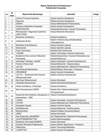 Rejestr Studenckich Kół Naukowych Politechnika Poznańska 1. 2. 3. 4. 5. Nr ewid. 1 2 3 4 5 6. 6 7. 7 Centrum Promocji Inżynierów Ergonomii „MICRO” „Enactus Politechnika Poznańska” „MOSTOWCÓW” Wibroakustyki i Diagnostyki Systemów „SPECTRUM” Studentów Architektury 8. 8 „Multimedia Studio” 9. 10. 11. 12. 9 10 11 12 13. 13 14. 15. 16. 17. 18. 14 15 16 17 18 19. 19 20. 21. 20 21 Studentów Dróg Żelaznych Geoinżynierii Fizyki Technicznej „CHEMIK” Akademicki Klub Lotniczy Politechniki Poznańskiej Automatyki i Robotyki „CybAiR” Fotoniki „Photon Club” „Info Car” Koło Naukowe Mechaników „PROGRESS” „S.K.I.M. – Studenckie Koło Inżynierii Mikroprocesorowej” Koło Nauk Obliczeniowych Studentów Budownictwa 22. 22 Historii Architektury i Urbanistyki 23. 23 24. 24 25. 26. 27. 28. 29. 30. 31. 32. 33. 34. 35. 36. 25 26 27 28 29 30 31 32 33 34 35 36 Lp. Nazwa Koła Naukowego Sieci Komputerowych AEGIS Jednostki Instytut Inżynierii Zarządzania Wydział Inżynierii Zarządzania Instytut Elektrotechniki Przemysłowej Instytut Inżynierii Zarządzania Wydział Budownictwa i Inżynierii Środowiska Instytut Mechaniki Stosowanej Wydział Architektury Katedra Telekomunikacji Multimedialnej i Mikroelektroniki Instytut Inżynierii Lądowej Instytut Inżynierii Lądowej Wydział Fizyki Technicznej Instytut Technologii i Inżynierii Chemicznej Wydział Budownictwa i Inżynierii Środowiska oraz Wydział Elektryczny Instytut Automatyki i Inżynierii Informatycznej Wydział Elektroniki i Telekomunikacji Instytut Elektrotechniki i Elektroniki Przemysłowej Wydział Maszyn Roboczych i Transportu Instytut Inżynierii Zarządzania Katedra Inżynierii Komputerowej Instytut Informatyki Instytut Konstrukcji Budowlanych Wydział Architektury Katedra Sieci Telekomunikacyjnych i Komputerowych Studenckie Koło Naukowe „Zarządzanie w Instytut Konstrukcji Budowlanych budownictwie – CMS” „ATENA” Instytut Automatyki i Inżynierii Informatycznej „FOTON” Instytut Elektrotechniki i Elektroniki Przemysłowej Energetyki Cieplnej Katedra Techniki Cieplnej Krótkofalowców Wydział Elektroniki i Telekomunikacji Mechatroników Katedra Podstaw Konstrukcji Maszyn „MIND” Instytut Informatyki Koło Studenckie „MAGNESIA” Inst. Elektrotechniki i Elektroniki Przemysłowej „ELEKTROENERGETYKA” Instytut Elektroenergetyki Studentów Informatyki BOOBOO Instytut Informatyki Inżynierii Wirtualnej Projektowania Instytut Silników Spalinowych i Transportu Odlewników Instytut Technologii Materiałów „LOGISTYKA” Instytut Inżynierii Zarządzania Uwagi 37. 37 38. 38 39. 39 40. 40 41. 42. 43. 44. 45. 46. 47. 41 42 43 44 45 46 47 48. 48 49. 50. 51. 52. 49 51 52 53. 53 54. 54 55. 56. 55 56 57. 57 58. 59. 60. 61. 62. 63. 59 60 61 62 63 64. 64 65. 66. 67. 68. 69. 70. 65 66 67 68 69 70 71. 71 72. 72 „Studenckie Koło Naukowe Konsultingu COGNITIS” Inżynierii Materiałowej Studenckie Koło Doskonalenia Procesów przy Politechnice Poznańskiej Naukowo-Artystyczne „DEDAL” „Polimery i Tworzywa Sztuczne” „DECYBEL” Urbanistów „URBA-NATION” Inżynierów Środowiska Nanoinżynierii Molekularnej Silników Spalinowych Technologii Ochrony Wód „ELECTRONUS” Instalacje Inteligentne w Budynkach „SENSOR” Robotyka Automatyka Informatyka Młodego BHP-owca Komputerowego Wspomagania Projektowania Technologii Obrabiarek Sterowanych Numerycznie „MACHTOOL” Akademickie Koło Aplikacji Internetowych KREATORNIA Instytut Inżynierii Zarządzania Instytut Inżynierii Materiałowej Instytut Inżynierii Zarządzania Katedra Rysunku, Malarstwa, Rzeźby i Sztuk Wizualnych Instytut Technologii Materiałów Katedra Sterowania i Inżynierii Systemów Instytut Architektury i Planowania Przestrzennego Instytut Inżynierii Środowiska Wydział Fizyki Technicznej Instytut Silników Spalinowych i Transportu Instytut Inżynierii Środowiska Instytut Elektroenergetyki Inst. Elektrotechniki i Elektroniki Przemysłowej Katedra Sterowania i Inżynierii Systemów Instytut Inżynierii Zarządzania Instytut Technologii Mechanicznej Instytut Technologii Mechanicznej Instytut Informatyki Instytut Architektury i Planowania Przestrzennego Katedra Systemów Telekomunikacyjnych i Opto„Pajączek” elektroniki Inżynierów Transportu Publicznego Instytut Silników Spalinowych i Transportu Sieci Komputerowe i Systemy Rozproszone Instytut Informatyki „ILLUMINATION” Wydział Architektury Automatyki Przemysłowej Instytut Automatyki i Inżynierii Informatycznej „Light Architecture” Wydział Architektury Studenckie Koło Naukowe Inteligencji Wydział Informatyki Obliczeniowej Ruch Projektantów Gier „RPG” Wydział Informatyki Systemów Wbudowanych Wydział Informatyki Inwestorów i Ekonomistów „MAKLER” Katedra Nauk Ekonomicznych „PRIME” Wydział Budowy Maszyn i Zarządzania „DIODAK” Katedra Radiokomunikacji „Inżynierii komputerowej” Katedra Inżynierii Komputerowej Odkrywców Współczesnej Architektury Instytut Architektury i Planowania Przestrzennego „IN SITU” Zarządzania Kosztami w Budownictwie Instytut Konstrukcji Budowlanych 73. 73 74. 75. 76. 77. 78. 79. 80. 81. 82. 83. 74 75 76 77 78 79 80 81 82 83 Telewizji Studenckiej Politechniki Poznańskiej „Spacja TV” „ConInno” Obróbki Skrawaniem Fantomatyka Bioinformatyki Matematyczne Koło Naukowe „EDUART” „Techniki Wirtualne w Projektowaniu” „ARCHimpACT” „Pyralab” Architektury Projektowanej Cyfrowo Katedra Telekomunikacji Multimedialnej i Mikroelektroniki Instytut Konstrukcji Budowlanych Instytut Technologii Mechanicznej Wydział Architektury Instytut Informatyki Instytut Matematyki Wydział Architektury Wydział Budowy Maszyn i Zarządzania Wydział Architektury Katedra Radiokomunikacji Instytut Architektury i Planowania Przestrzennego